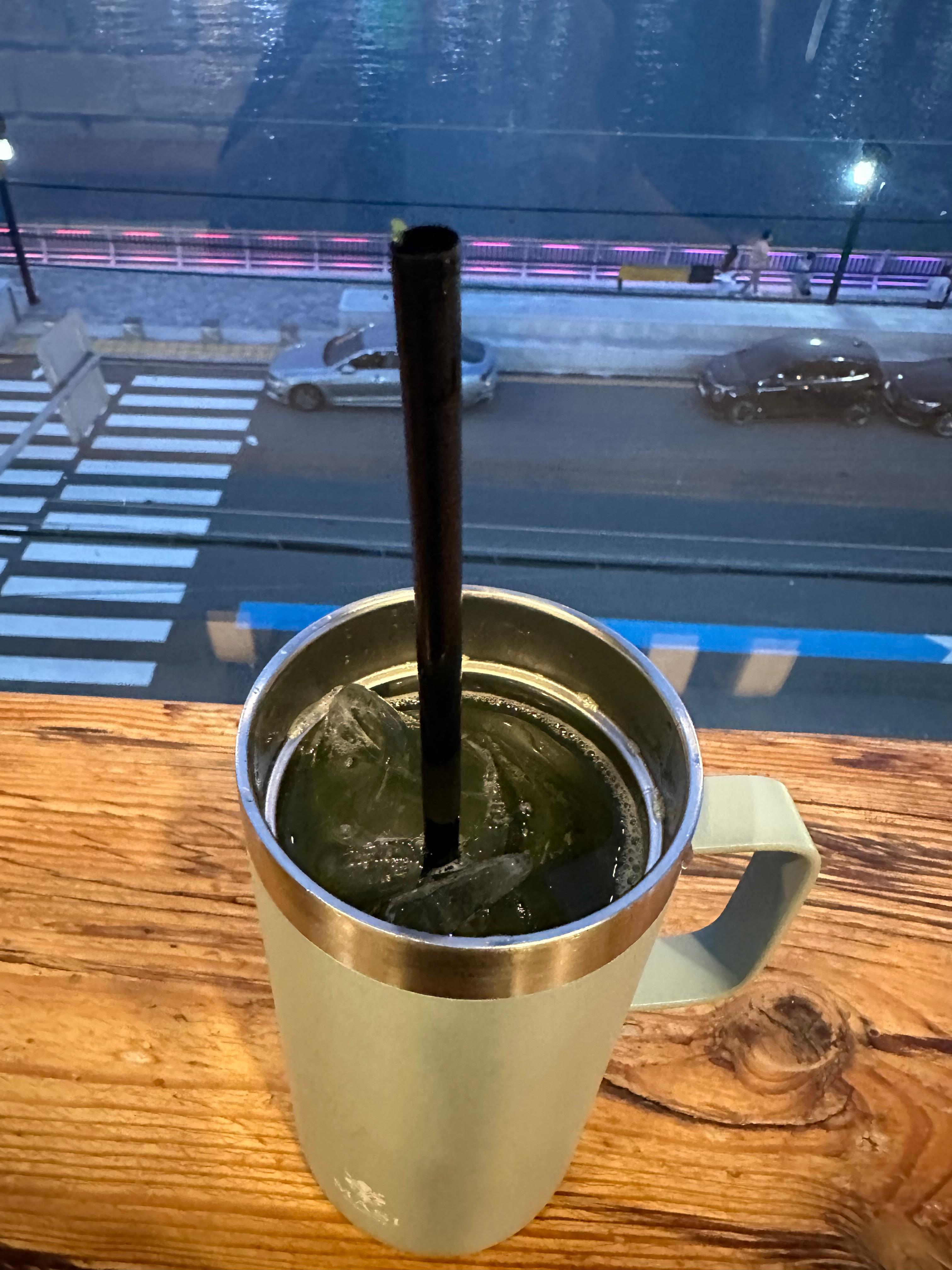 자리를 잡고 제가 주문했던 청포도 에이드를 작은 테이블 탁자 위에 놓았습니다. 카페가 그렇게 넓지 않다보니 넓은 테이블을 놓을 수 없던것 같습니다. 그러나 가볍게 노트북을 할 정도 크기는 되었습니다. 청포도 에이드라 그런지 사진을 찍으도 청포도 색상이 그대로 느껴지지 않은 그냥 물색이었습니다. 맛은 청포도처럼 포도맛이 그대로 느껴지는 시원한 에이드 음료수였습니다.