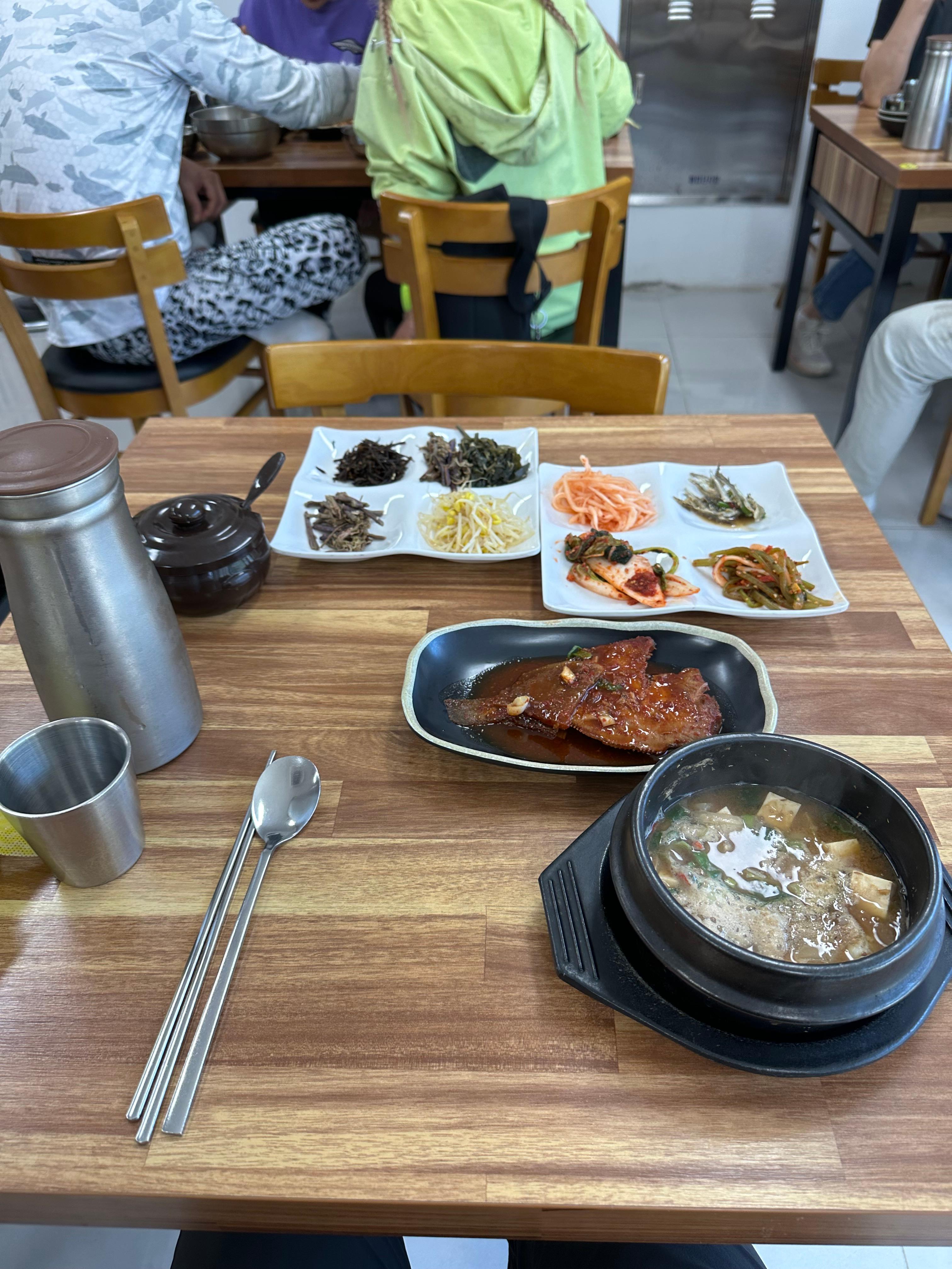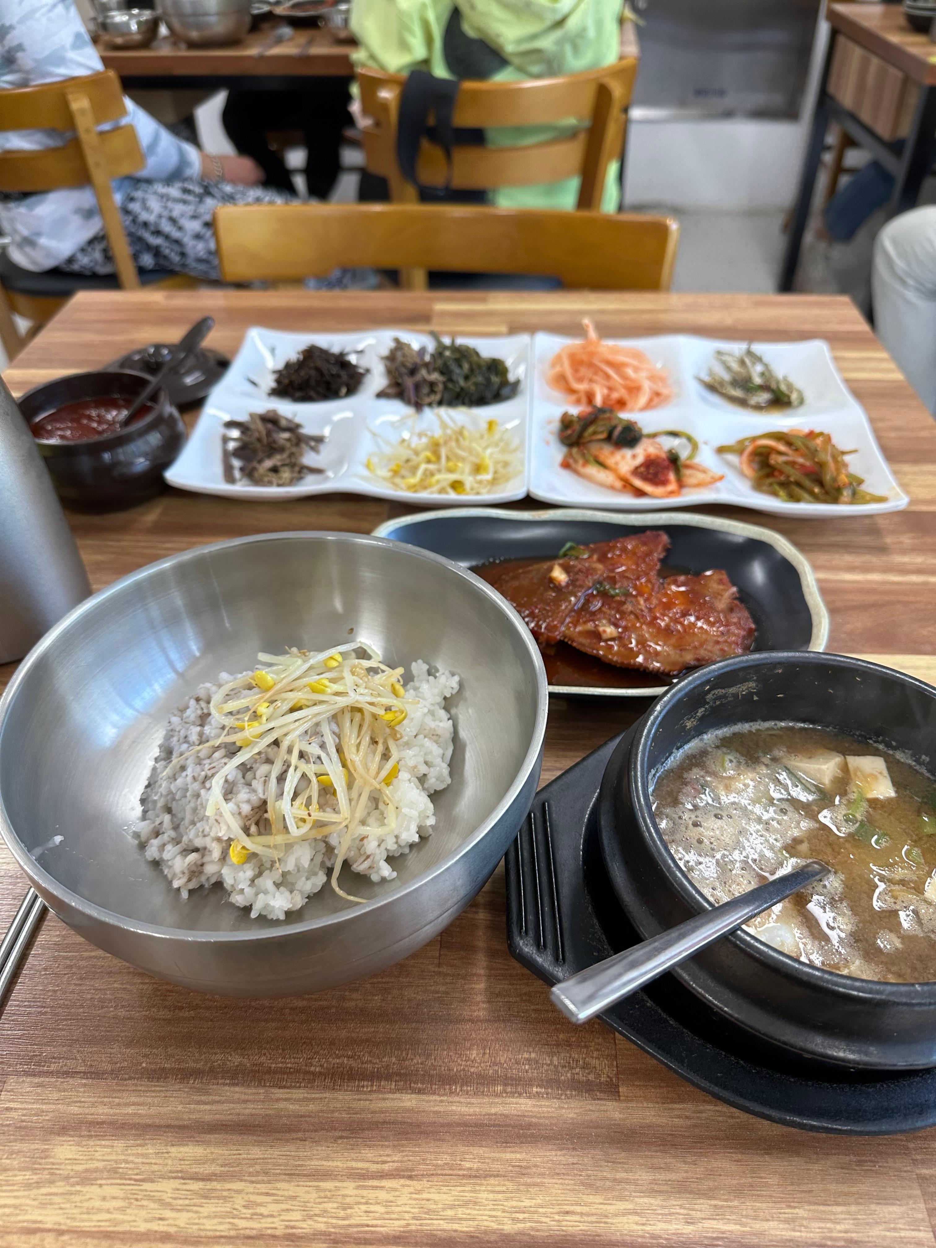 보리밥을 주문하고 얼마 지나지 않아서 반찬과 된장찌개, 갈치인지 고등어인지 모르지만 생선반찬이 먼저 나왔습니다. 된장찌개는 겉으로보면 그냥 평범하지만 바로 다음에 소개해드리겠지만 꽃게 들어있는 정말 푸짐한 된장찌개였습니다. 도시에서 먹는 된장찌개는 된장과 두부만 가득하다면 통영이나 바다 해안에서 먹는 음식의 특징은 해산물이 풍부하다는 특징이 있습니다. 반찬에는 산나물들이 정말 많은데요. 보리밥이 나오면 보리밥 위에 산나물들을 섞어서 먹으면 정말 맛있고 건강해지는 기분입니다.