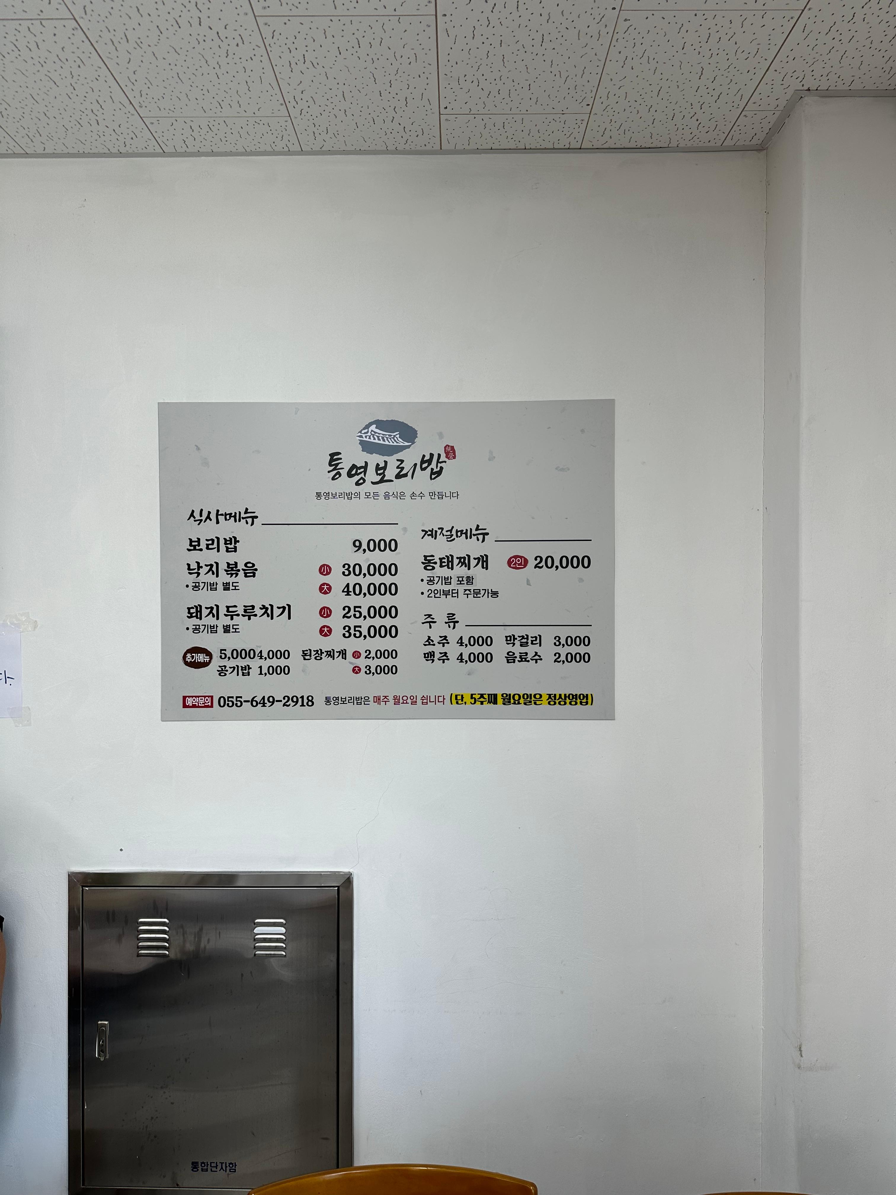 저는 자리에 앉아서 주문을 하기 시작했습니다. 메뉴는 간단했습니다. 대표메뉴는 보리밥이구요. 요즘은 어느 가게를 가든 기본 1만원이 넘는데요. 통영보리밥에서 보리밥은 만원이 되지 않는 가성비 1인 식당이었습니다. 그 외에 여러명이 함께 식사 가능한 메뉴는 돼지 두루치기와 낚지볶음, 동태찌개가 크기 소,중,대로 있었습니다.