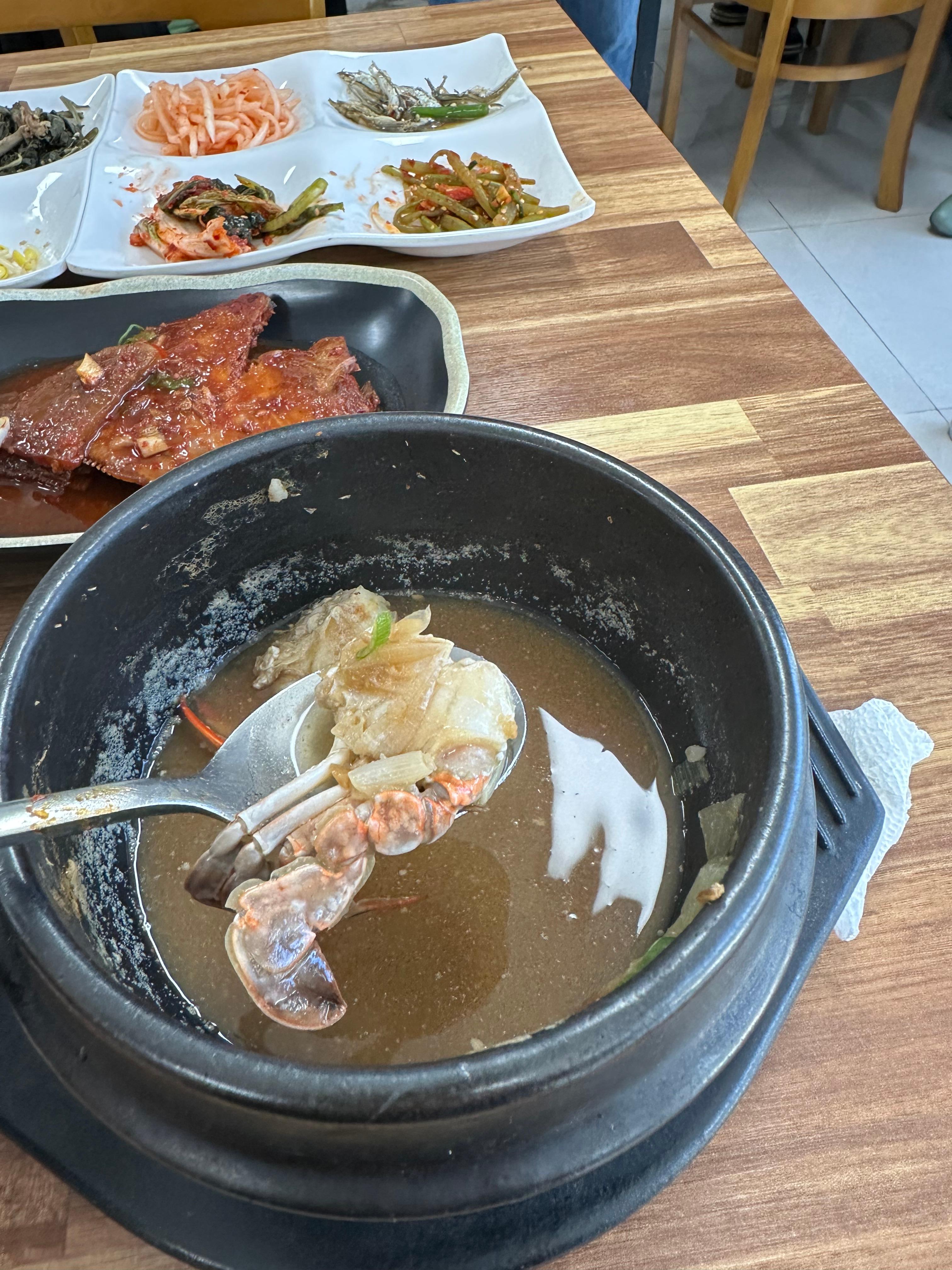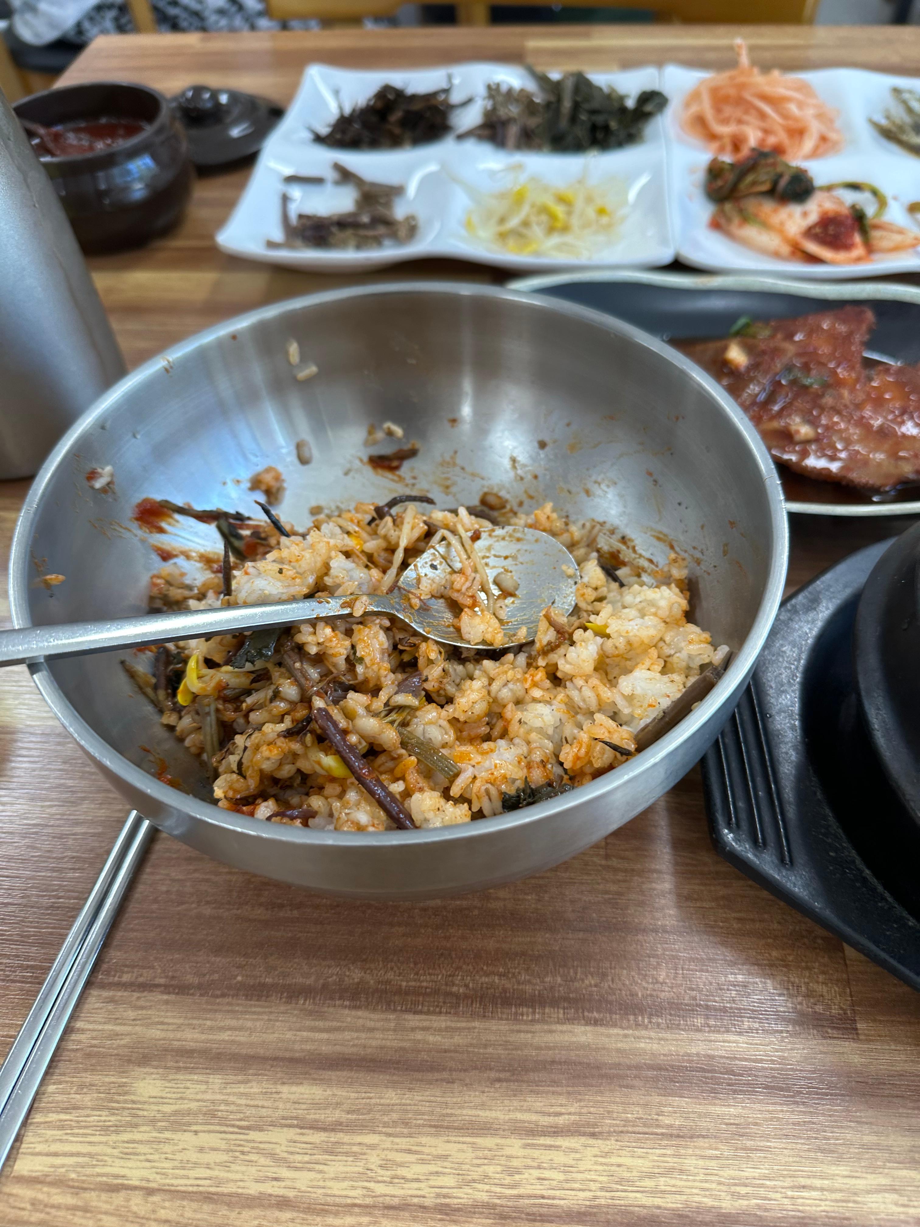 반찬이 나오고 나서 얼마 지나지 않아 드디어 통영 보리밥의 메인 메뉴인 보리밥이 나왔습니다. 만약에 보편적카페 스테이에서 붕어빵을 먹지 않았다면 더 맛있게 먹었을것 같습니다. 하지만 붕어빵이라 그런지 곧잘 보리밥이 맛있게 잘 넘어갔습니다. 특히 고기도 아니고 산나물과 함께 보리밥에 비벼먹는 비빔밥이라 그런지 배에 부담되지도 않고 맛있었습니다. 보리밥 나오기전에 된장찌개도 함께 먹다보니까 정말 개운하게 먹었는데요. 먹다보니까 된장찌개 안에 꽃게도 먹을 수 있었습니다.