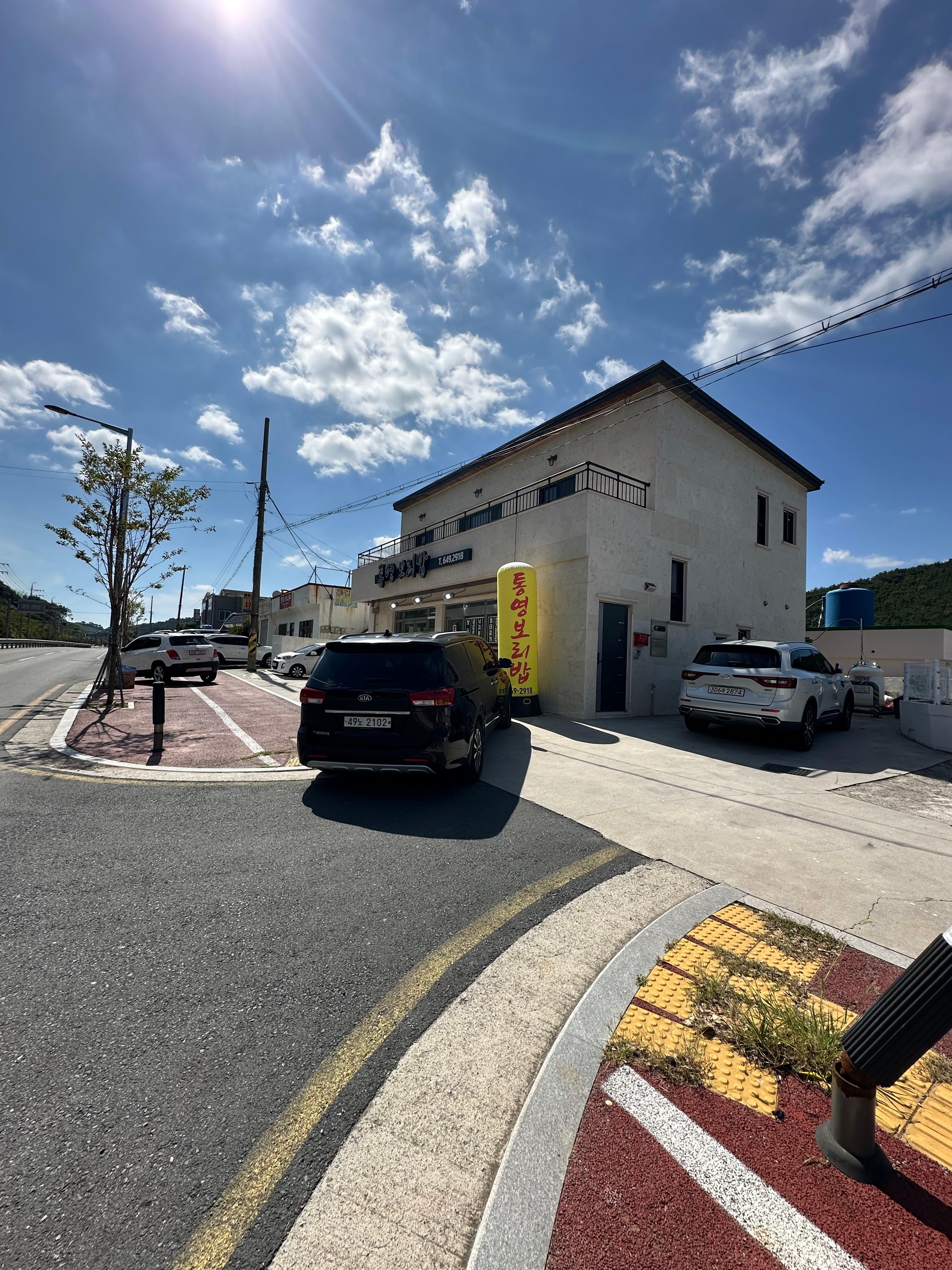 이번 여행은 날씨가 좋아서 여행하는 2박3일내내 푸른하늘과 멋지고 아름다운 구름이 사진을 찍는동안 계속 찍혔습니다. 그래서 신기하기도 하고 저절로 웃음이 나오면서 즐거운 여행이었는데요. 통영보리밥 앞에 도착해서 사진을 찍는데도 푸른하늘과 함께 멋진 구름들이 찍혔습니다.