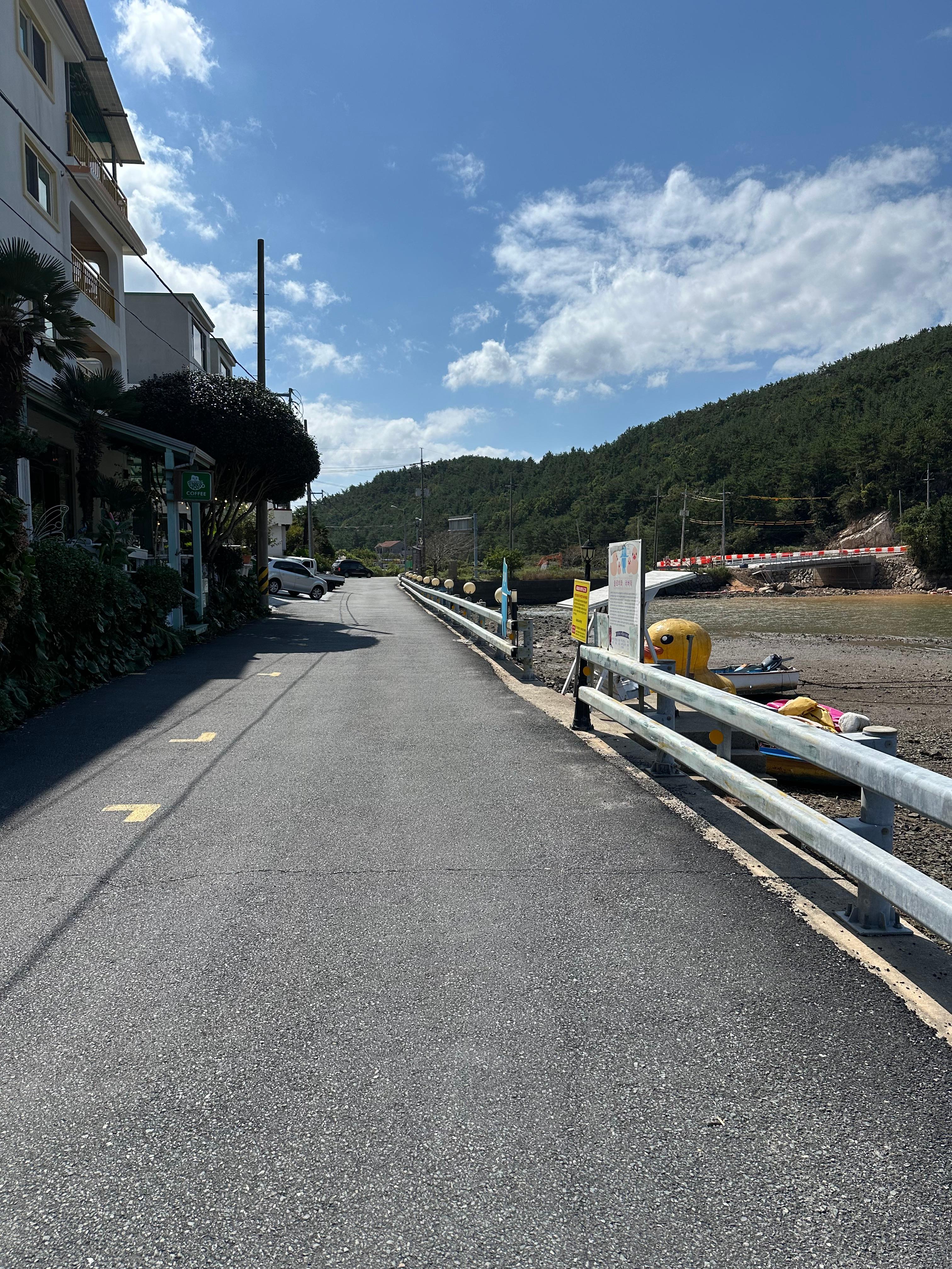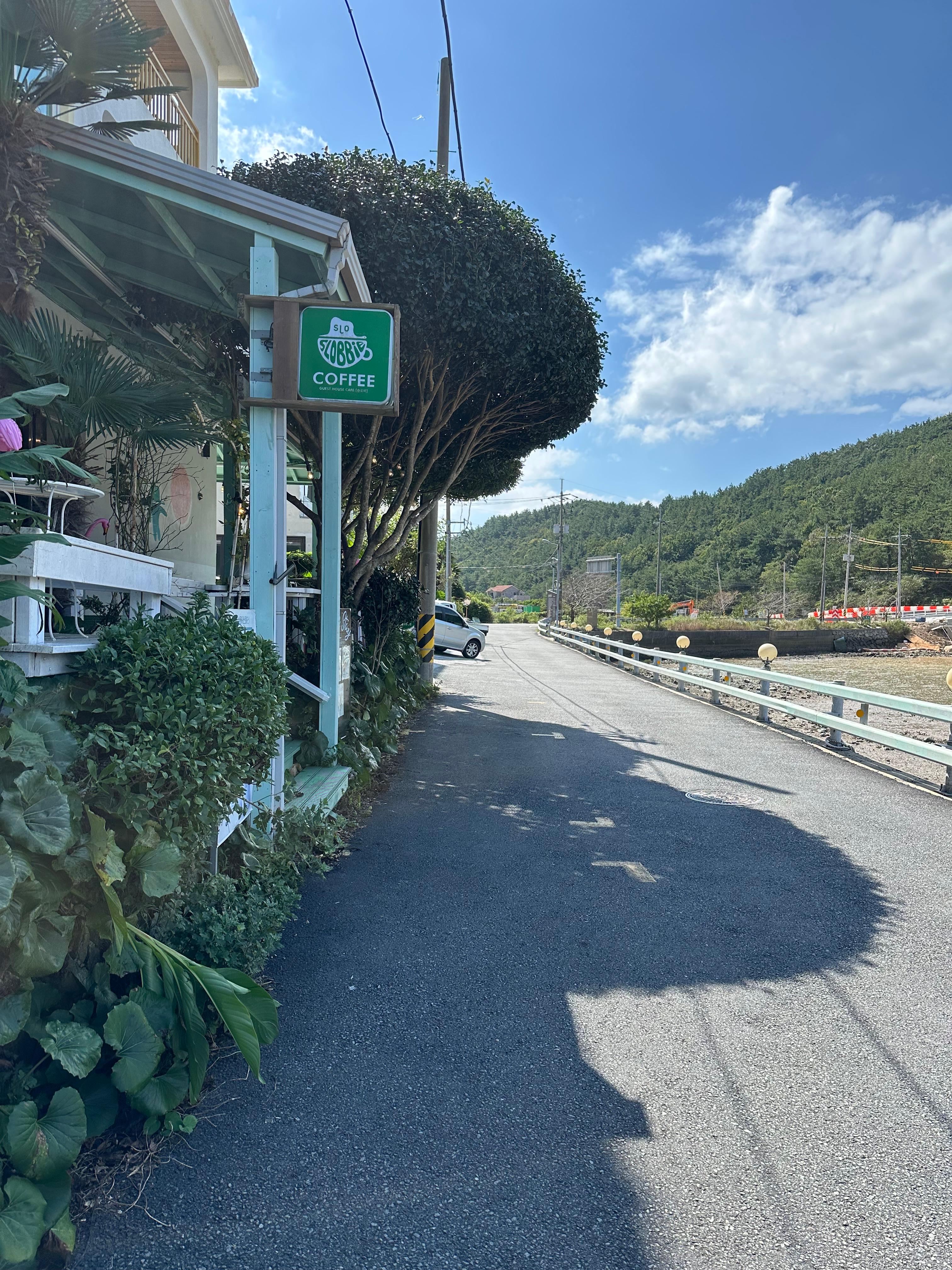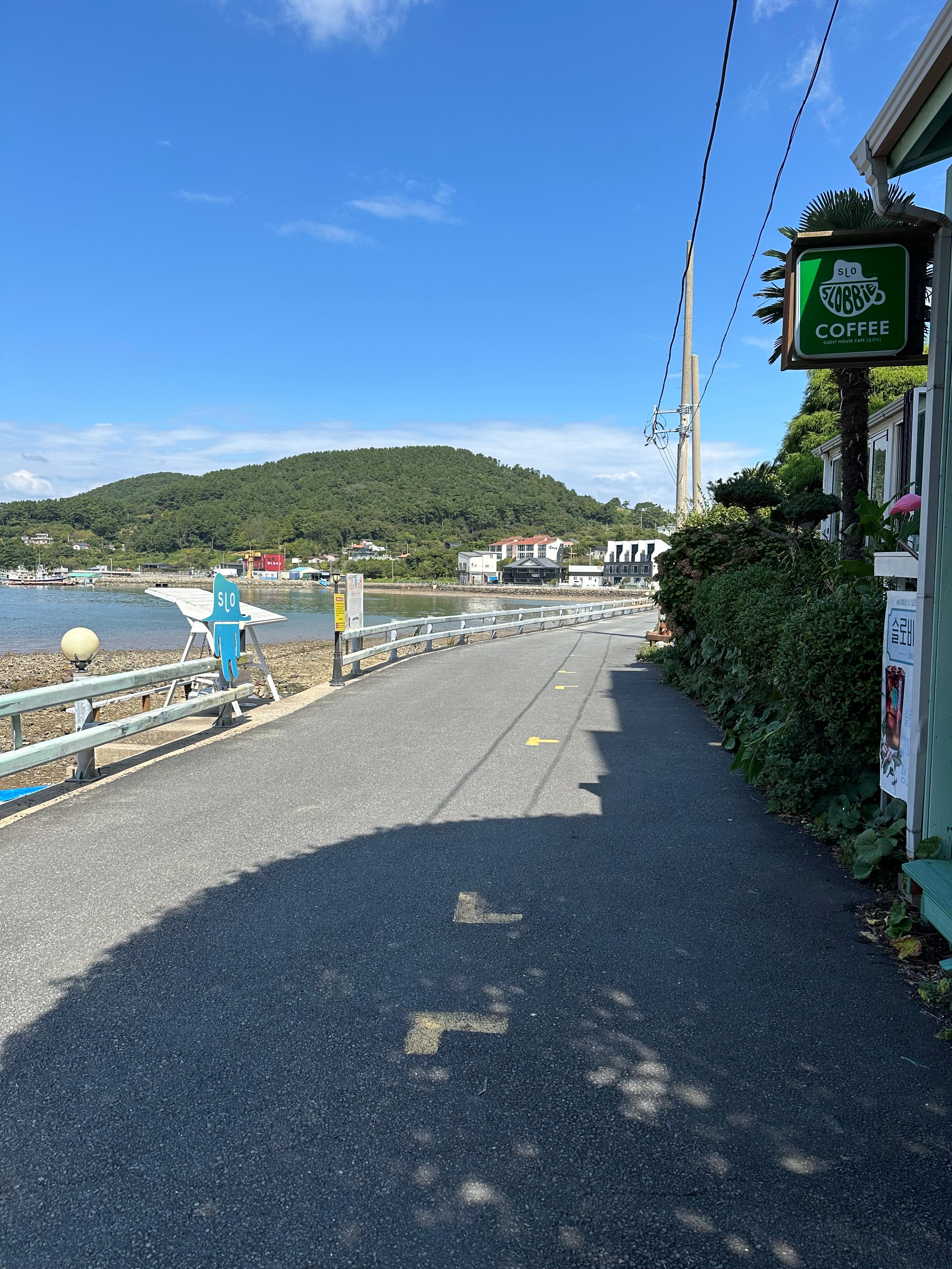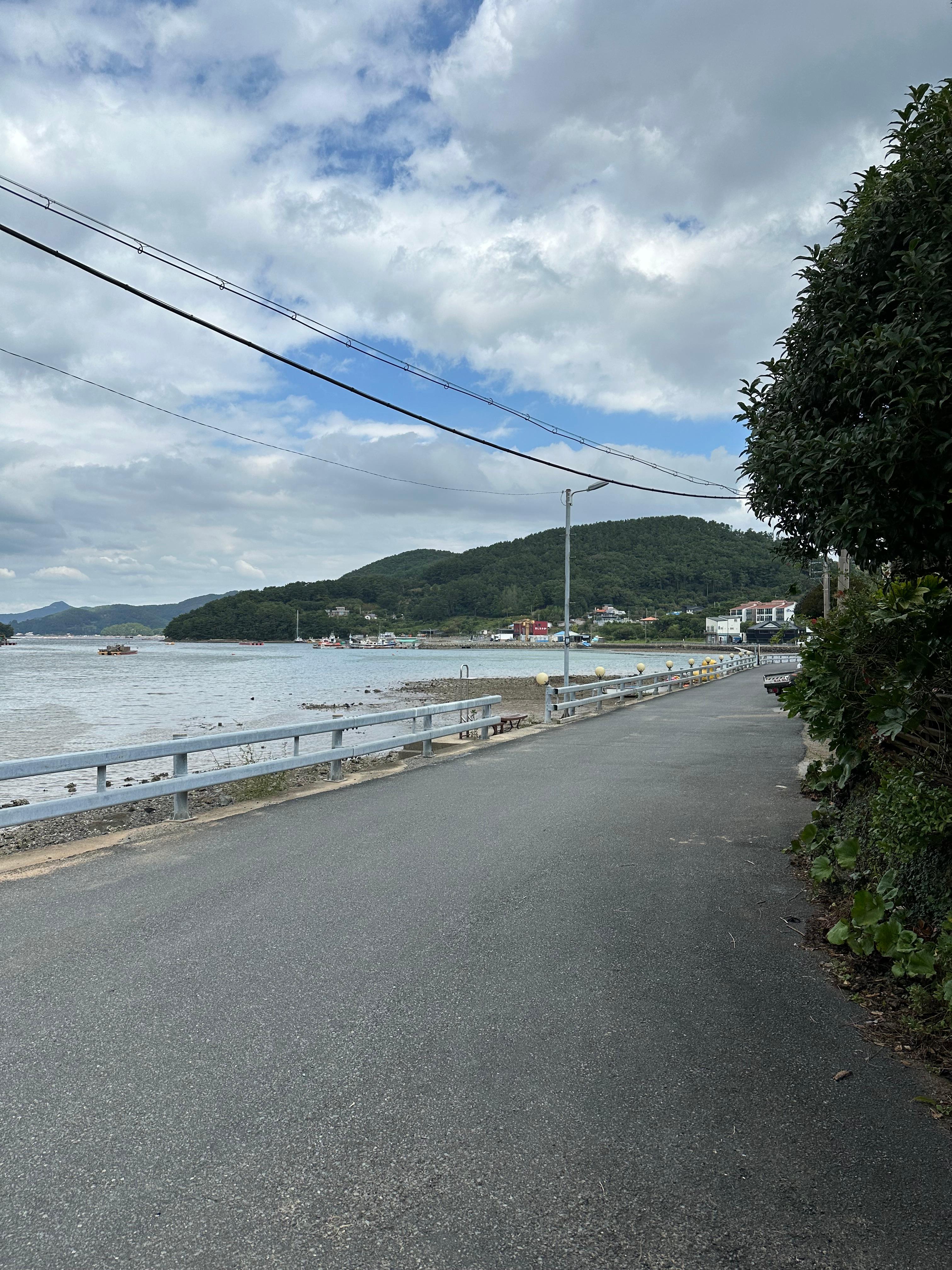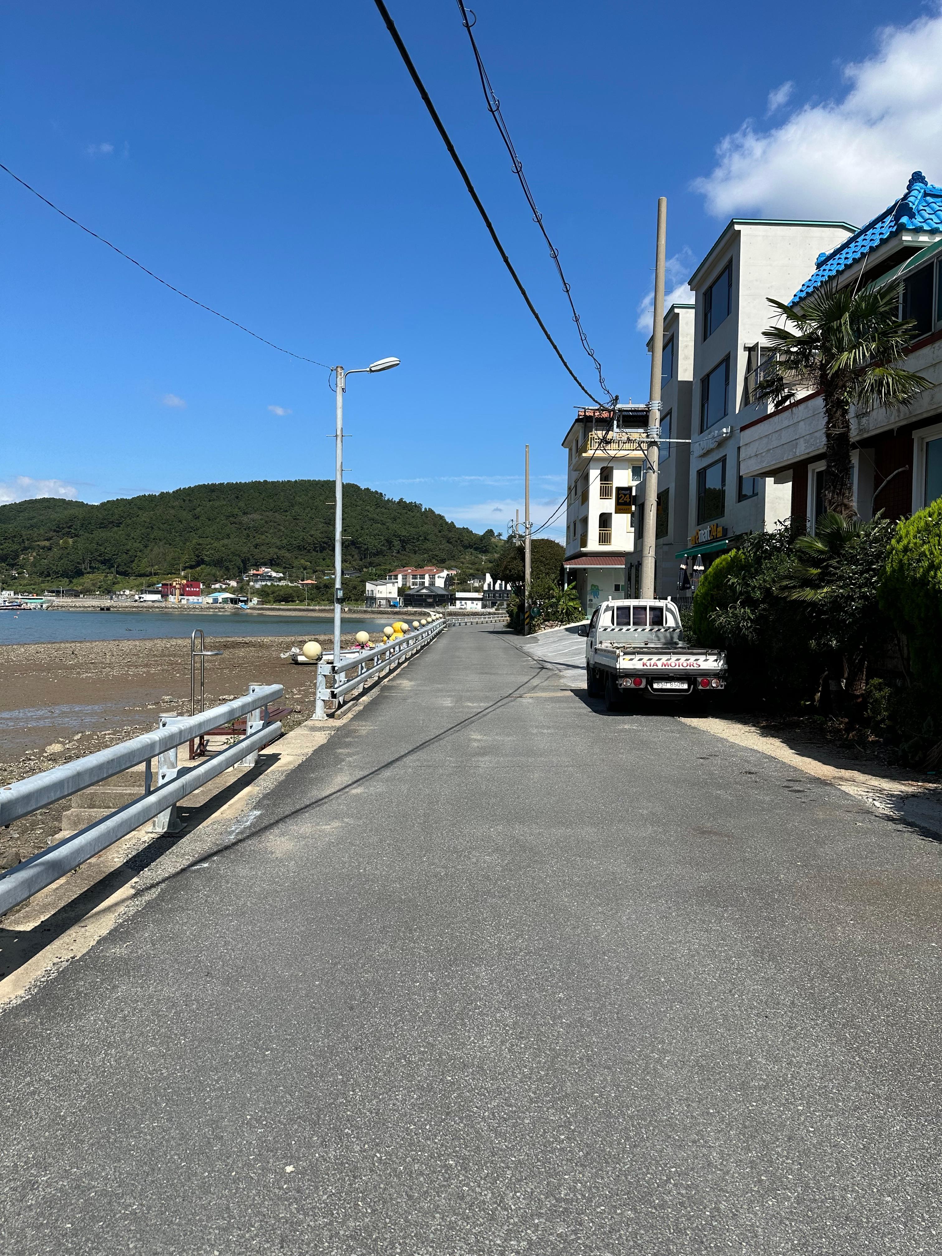 슬로비게스트하우스 뒤로는 저 멀리 산 언덕 위에 보편적카페의 모습을 볼 수 있습니다. 게스하우스 앞쪽으로는 바다를 보며 걸을 수 있는 길을 볼 수 있습니다. 특히 물이 빠지는 시기에는 갯벌체험도 할 수 있다고 해요.