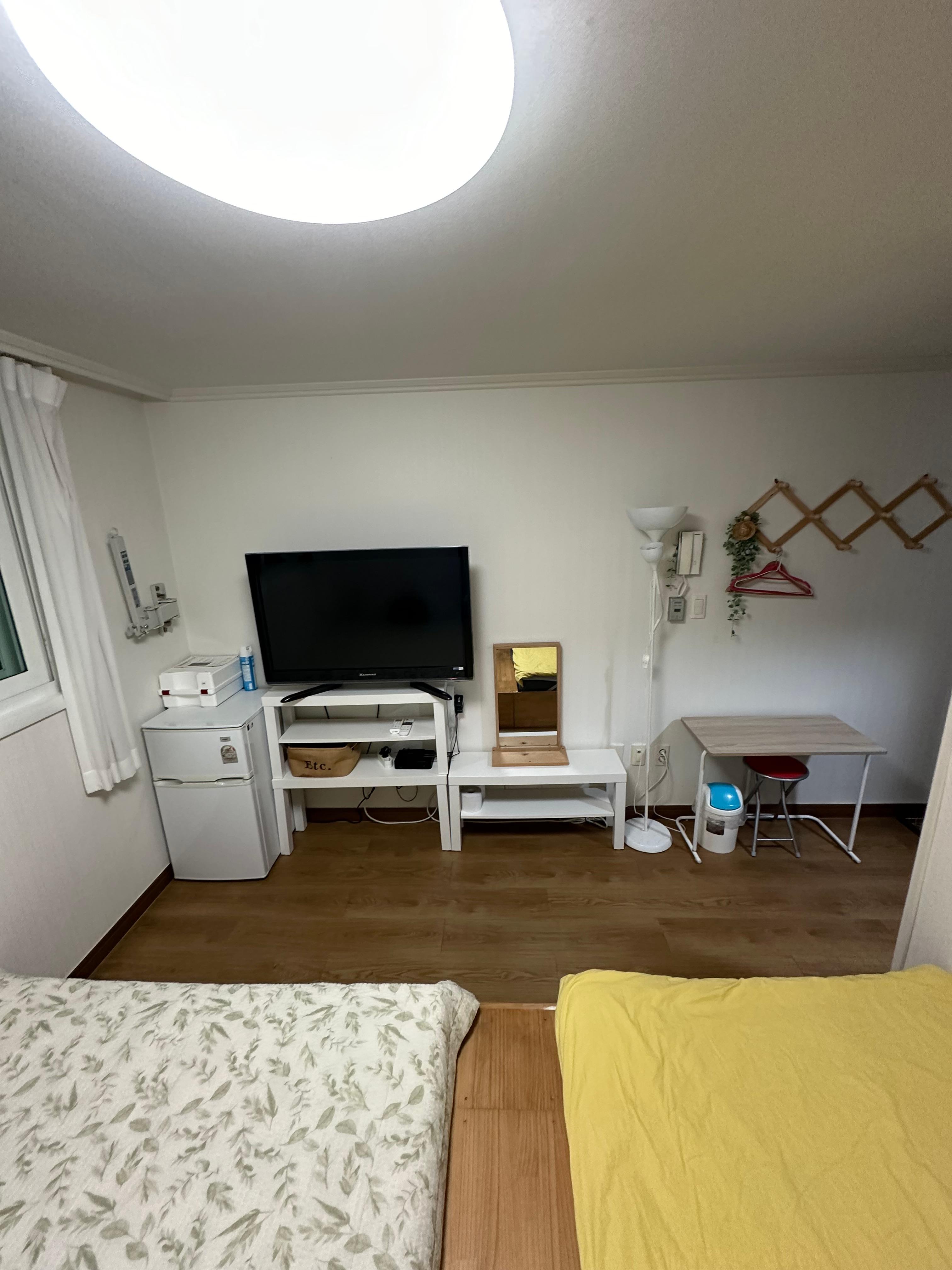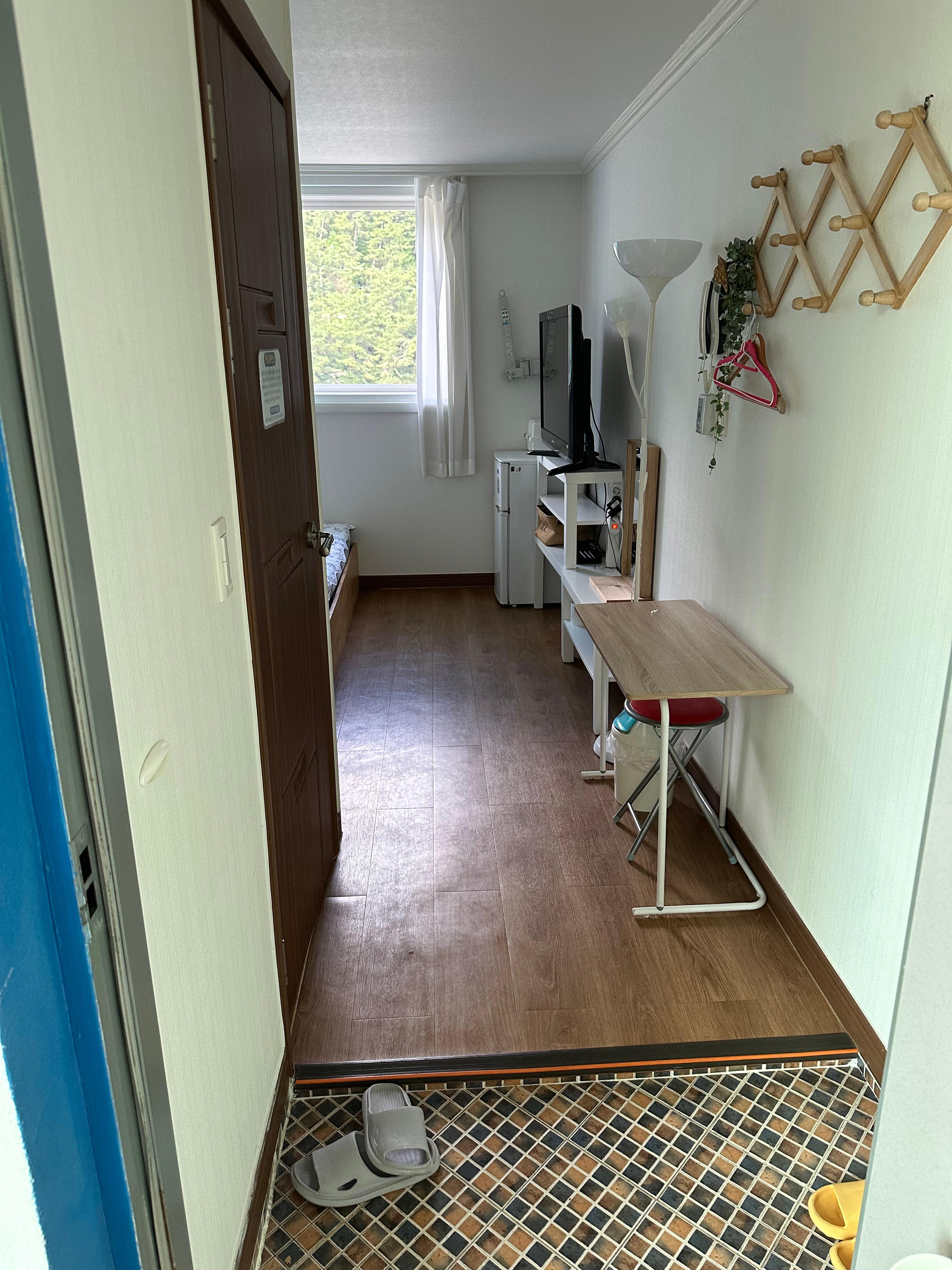 드디어 제가 배정받은 2-3인실 방안으로 들어왔습니다. 지난번 2023년 겨울 여행 때 이용했던 3-4인실에 비하면 작지만 혼자서 이용하는 싱글침대와 두명이 누울 수 있는 더블 침대가 있었습니다. 기본적으로 티비와 냉장고가 제공되고 있었습니다. 그리고 헤어드라이어와 가볍게 음식을 먹을 수 있는 테이블정도가 있었습니다.
