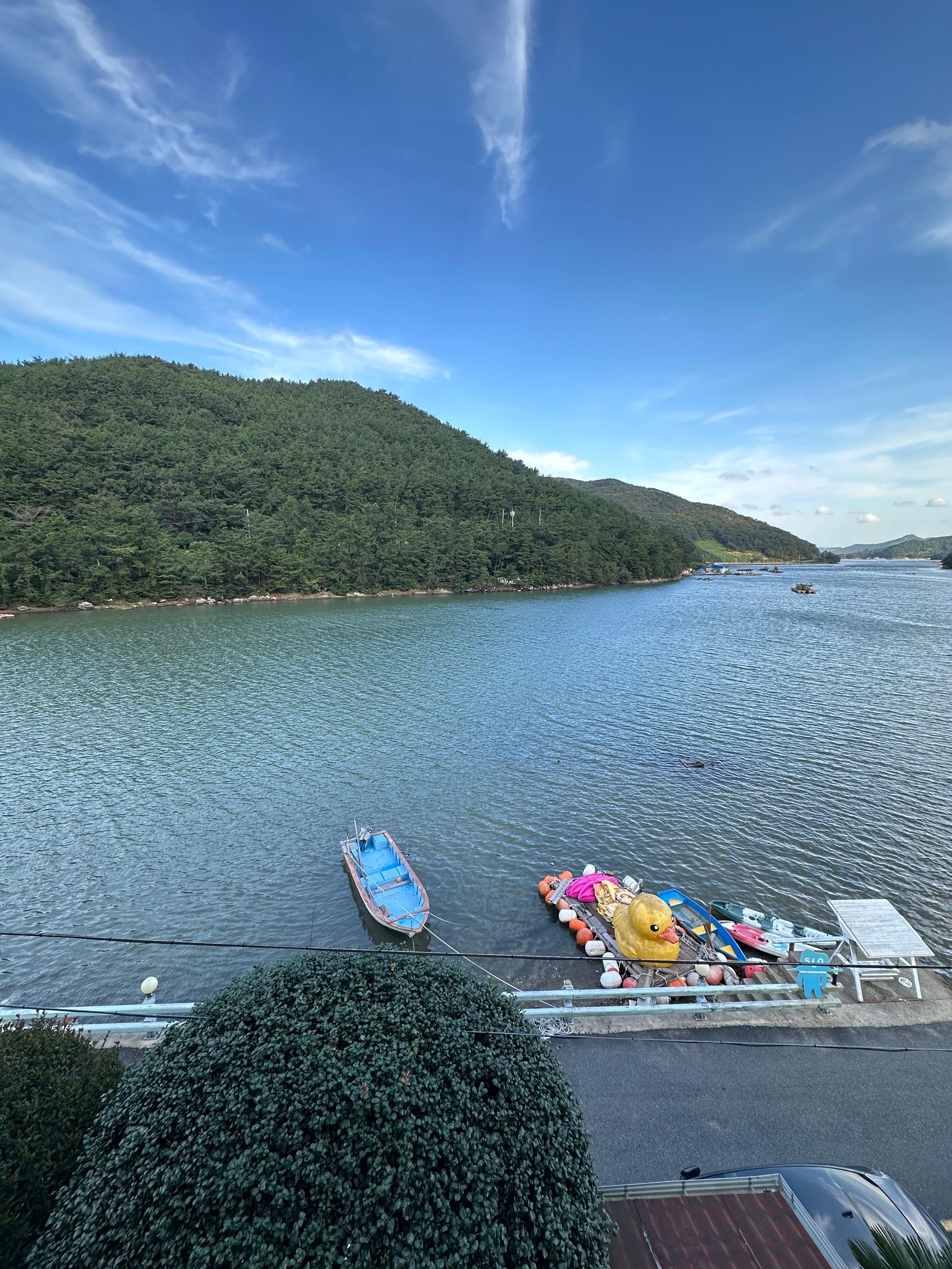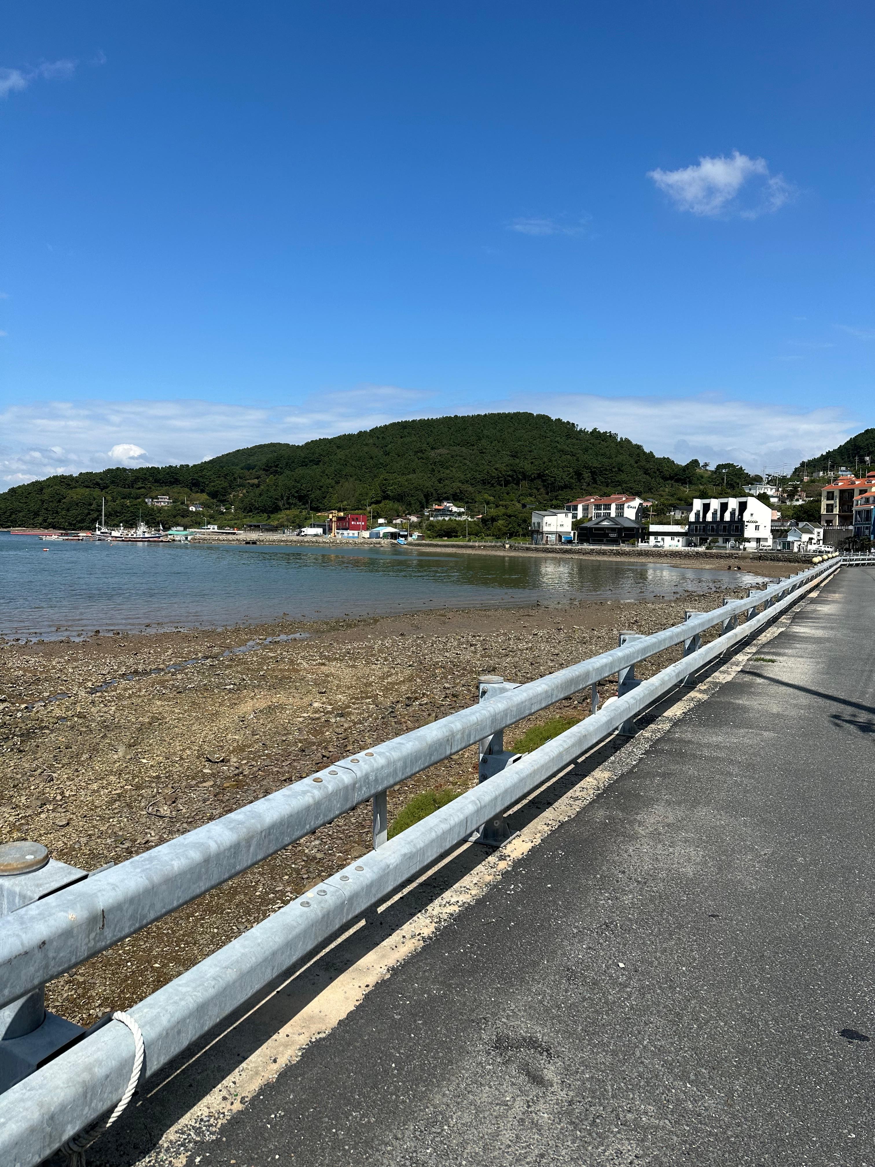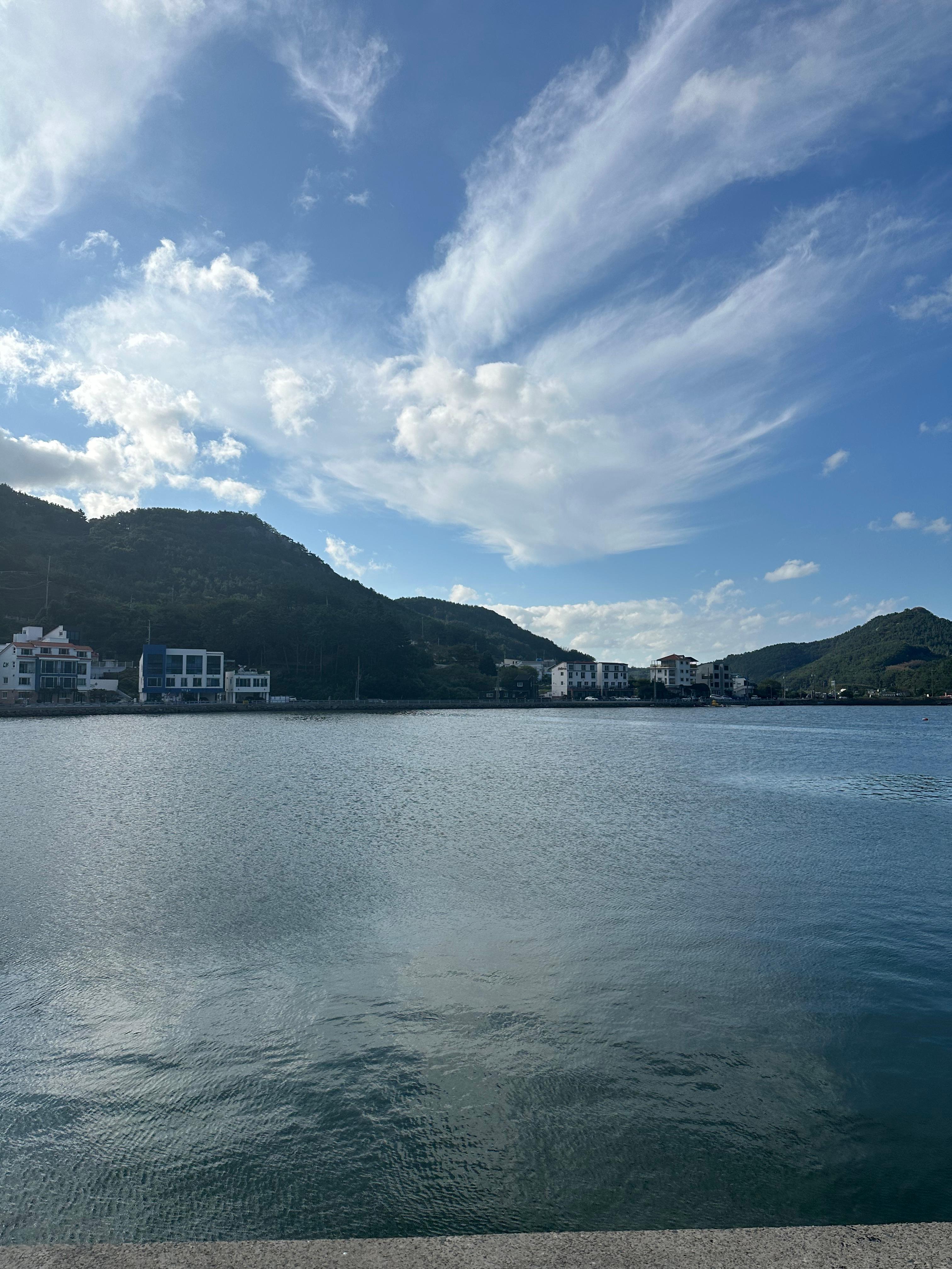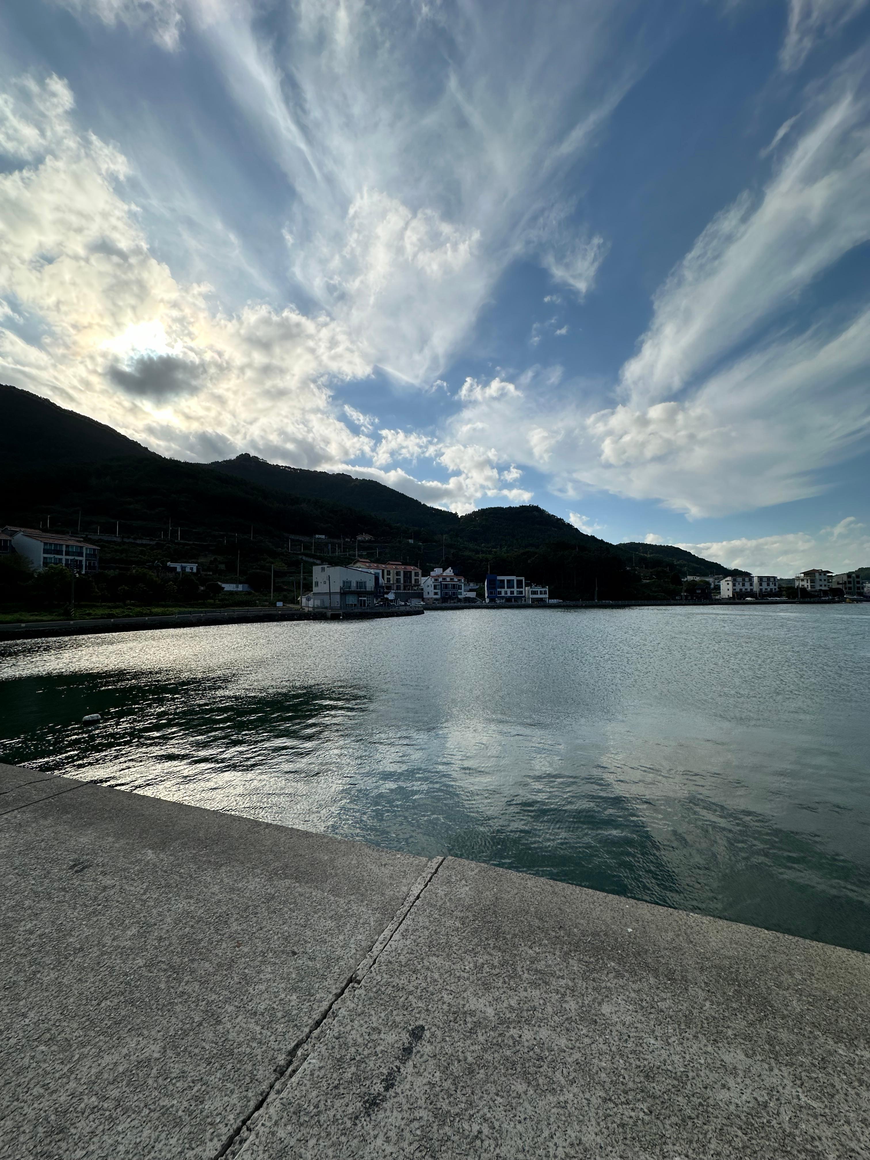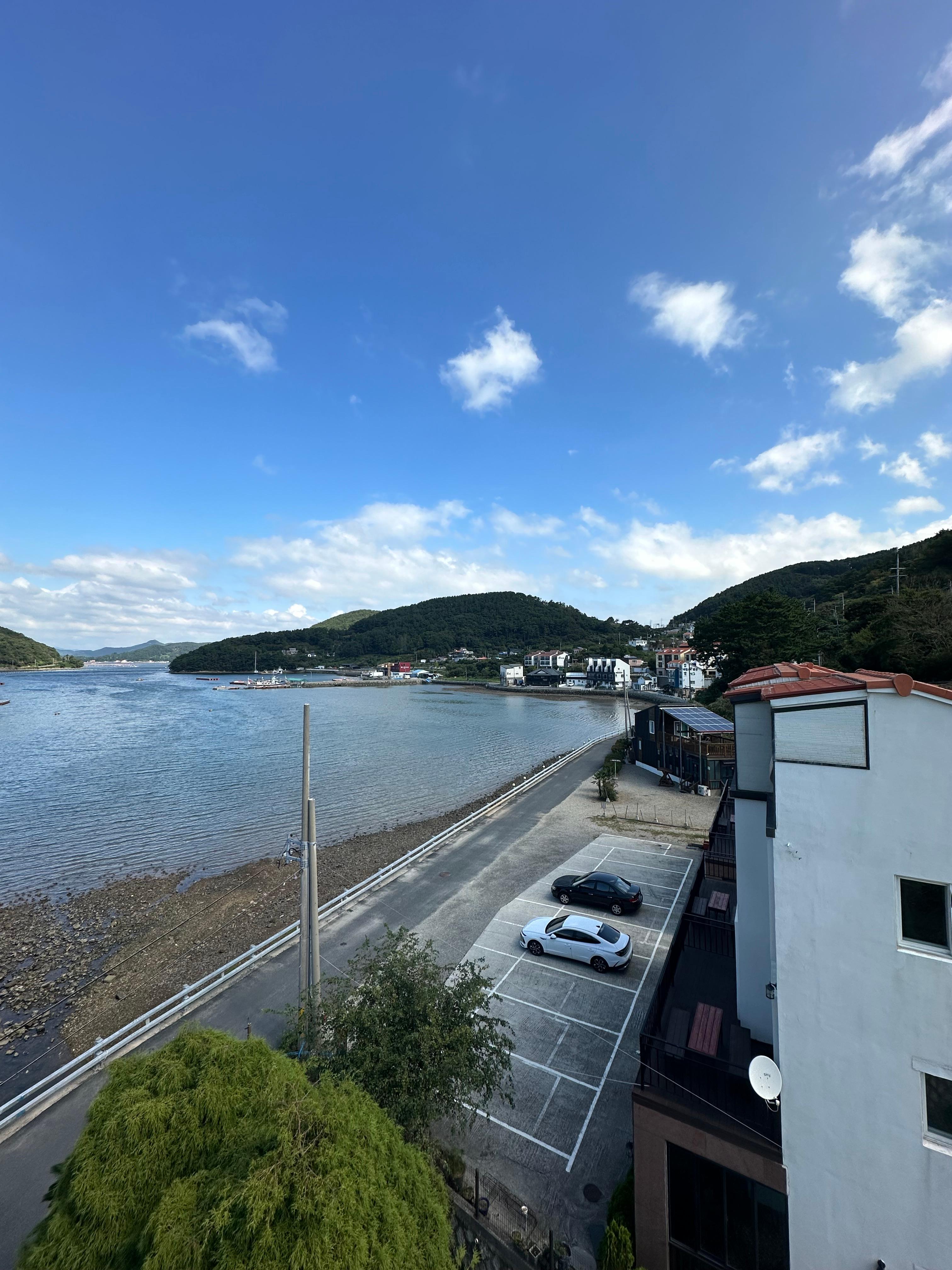 전날에는 물이 빠진 모습이었지만 3일차 마지막 슬로비게스트하우스 아침의 모습은 바닷물이 들어오고 푸른 하늘과 멋진 구름의 모습을 볼 수 있었습니다. 가을 통영 여행의 장점은 이렇게 푸른 하늘과 멋진 구름을 볼 수 있다는 것이 장점같습니다.