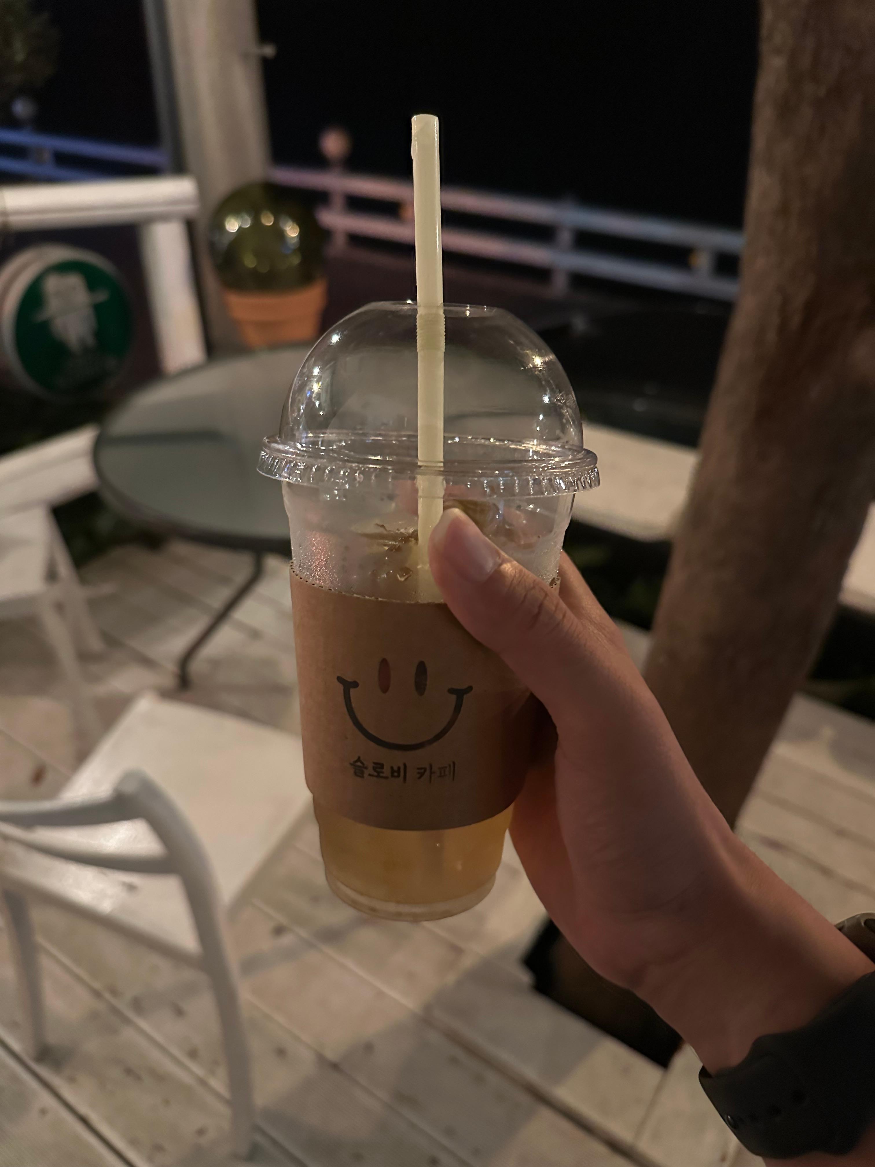 슬로비게스트하우스에 가는 이유에는 여러가지가 있는데요. 멀리 가지않더라도 숙소에서 바다와 산을 볼 수 있는 것만으로 힐링이 된다는 점과 정성스러운 한식 조식을 먹을 수 있다는 것입니다. 하지만 일정 인원수가 되지 않는경우에는 조식이 제공되지 않고 슬로비 카페에서 제공되는 음료 한잔이 무료로 제공되는데요. 저는 빈속이기는 하지만 아이스 허니 아메리카노를 주문했습니다. 음료와 함께 작은 과자도 받았습니다. 시원한 9월의 날씨라서 그런지 바람이 카페안으로 들어오는 것이 느껴졌습니다. 저는 주로 바다가 보이는 숙소를 찾는데요. 슬로비게스트하우스에서도 이렇게 바다와 산을 보며 밥을 먹고 야식을 먹고 커피를 마실 수 있었습니다.