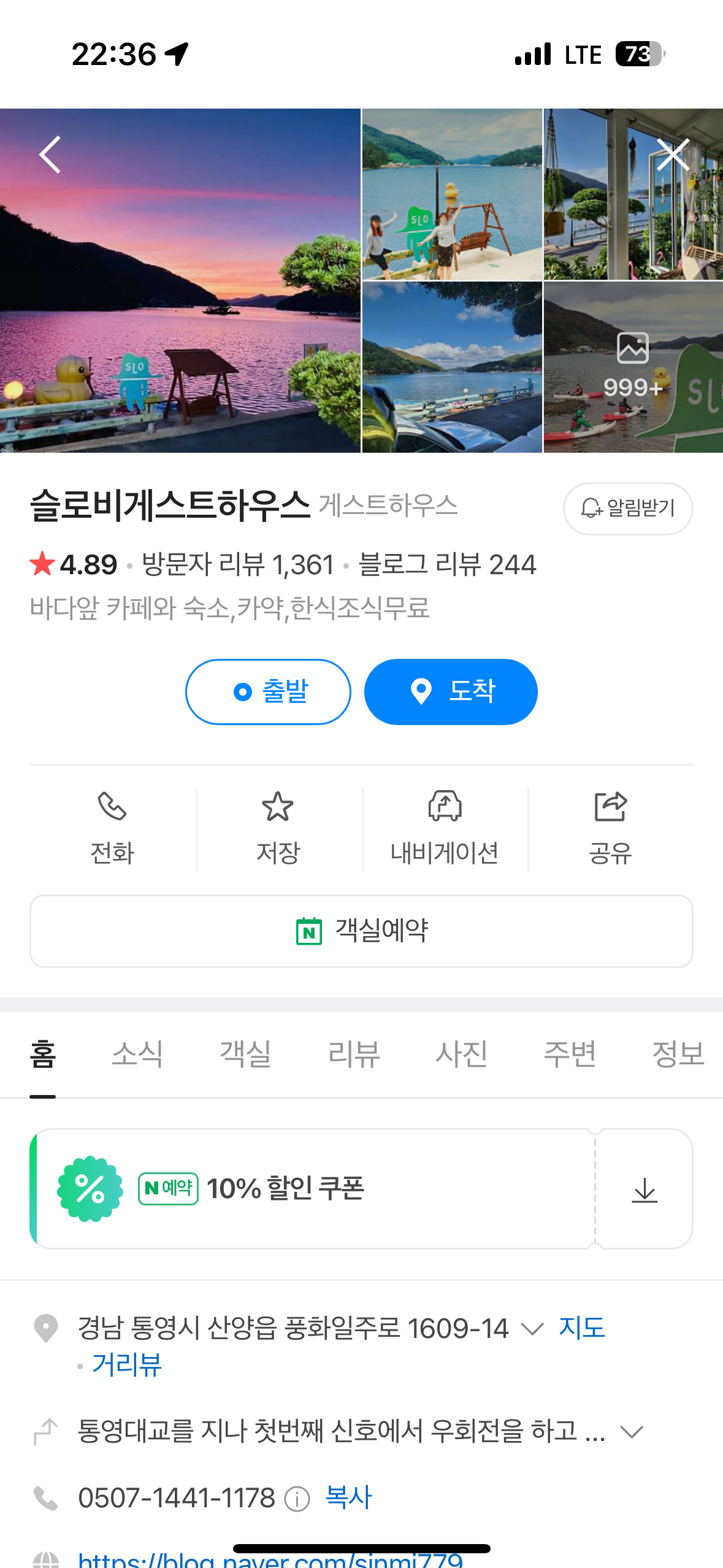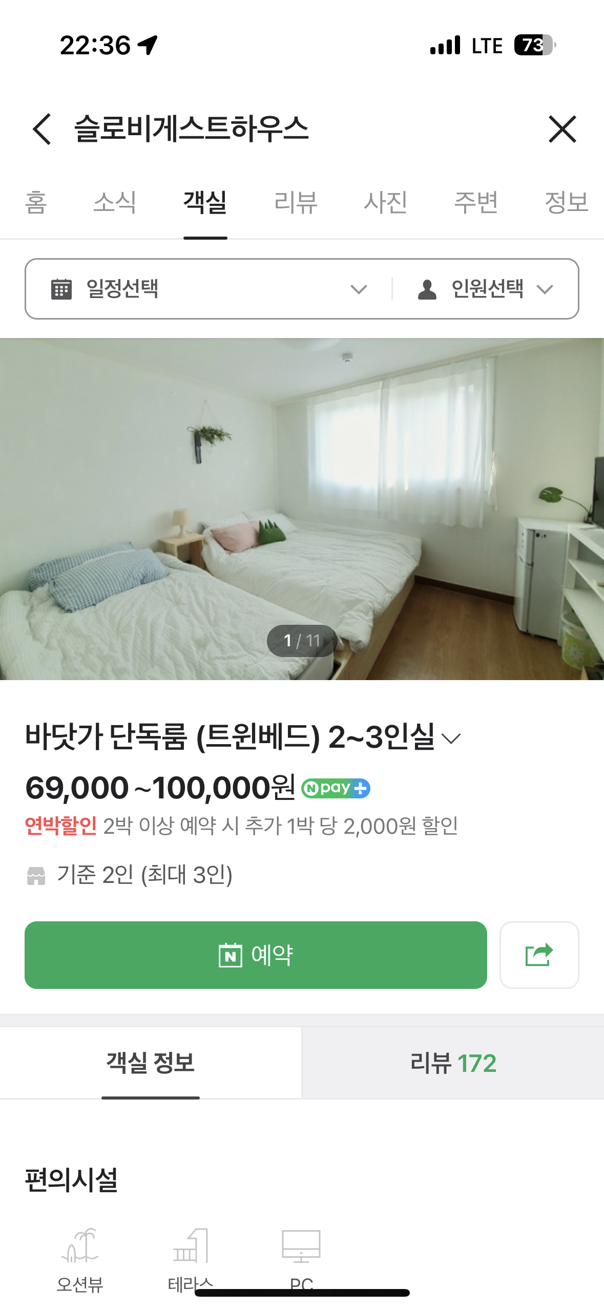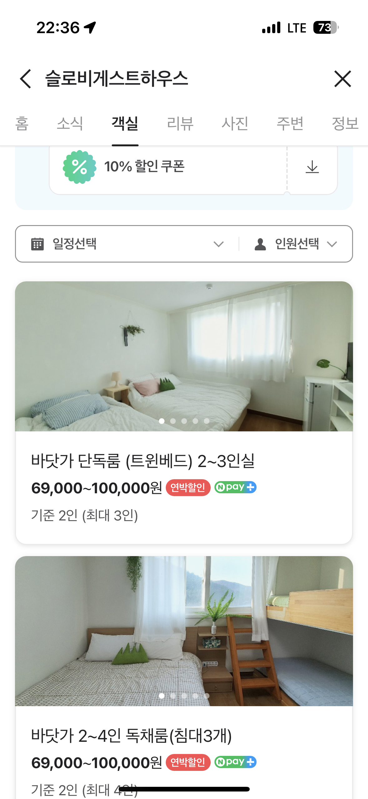 이번에도 저는 네이버 플레이스에서 통영 슬로비게스트하우스를 예약해서 방문했습니다. 슬로비게스트하우스는 10년 이상 운영해온 숙소이기 때문에 특히 주말에는 인기가 많은데요. 특히 슬로비게스트하우스에 가면 맛있는 조식과 편안하고 유쾌하고 재미있는 사장님이 계신 숙소로 유명합니다. 처음가더라도 부담되지 않는 숙소인데요. 특히나 숙소 건물앞에는 바다와 산이 있어서 아침에 일어나면 힐링이 되는 기분이었습니다. 저는 그동안 포스팅을 통해 소개해드렸지만 도미토리룸과 3-4인실 독채룸까지 이용했는데요. 슬로비게스트하우스는 혼자서 오는 손님들을 위한 도미토리 숙소와 2-3인과 3-4인 단체가 와서 쉴수 있는 숙소, 그리고 가족단위의 손님들을 위한 숙소까지 있습니다. 특히 이번에 이용하는 2-3인실 숙소는 2-3인실이지만 가격은 혼자서도 이용하기 부담되지 않는 가성비 숙소 였습니다. 특히 네이버로 예약할 경우 10% 할인 쿠폰도 제공되고, 저처럼 연박으로 이용할 경우 1박당 2,000원 할인이 되고 있었습니다. 2-3인실 숙소는 주말인지 평일인지에 따라 가격이 다른데요. 저는 2박으로 주말이 껴있어서 아마 10만원정도 들었습니다. 하지만 네이버 할인과 함께 연박 할인을 받을 수 있었습니다. 그래서 2박임에도 불구하고 163,000원에 이용했습니다. 보통 2-3일인실이라면 최소 30만원정도는 들 수 있는데요. 정말 혼자방문하더라도 여럿이 오더라도 부담되지 않는 가격이죠?