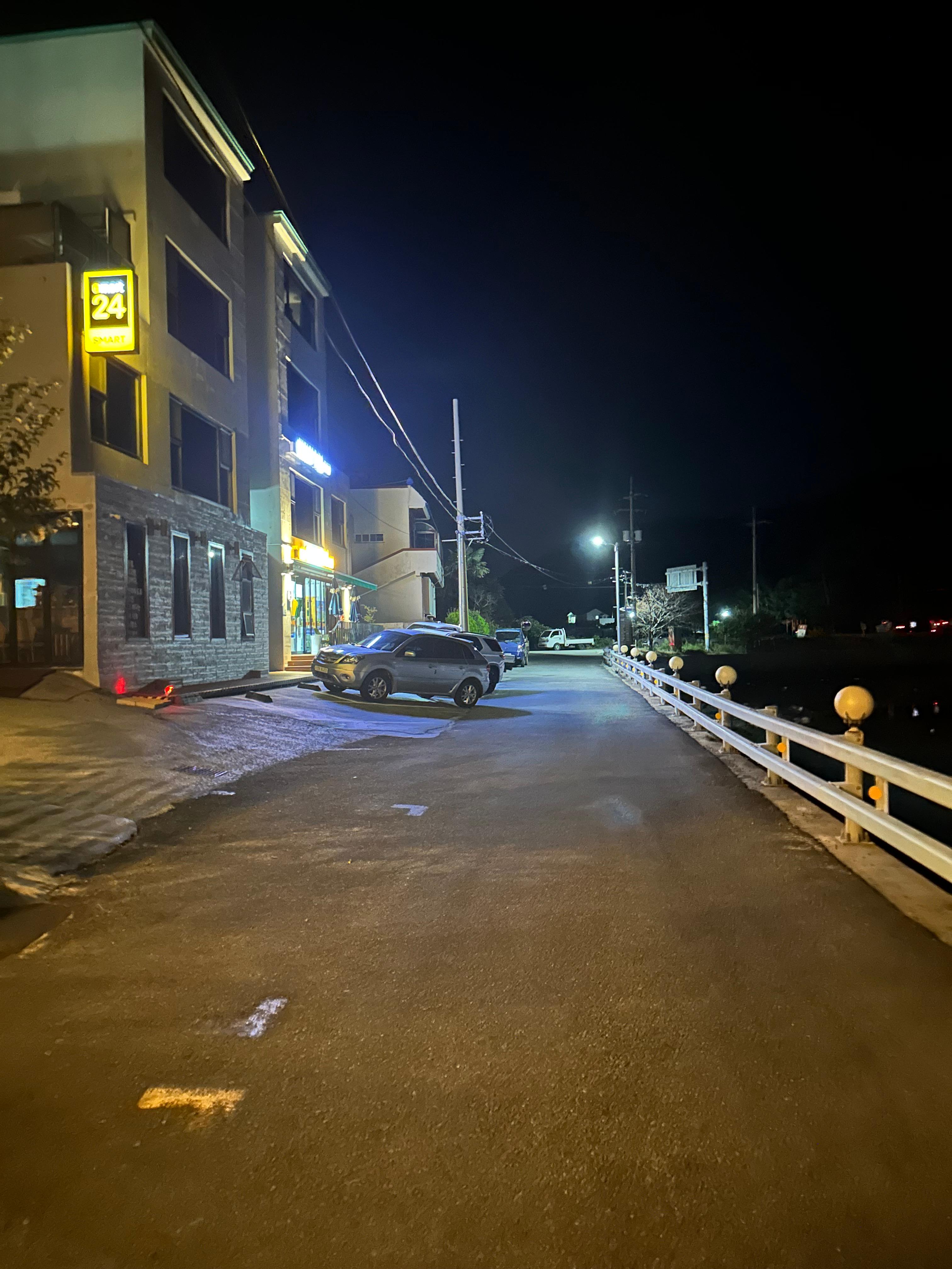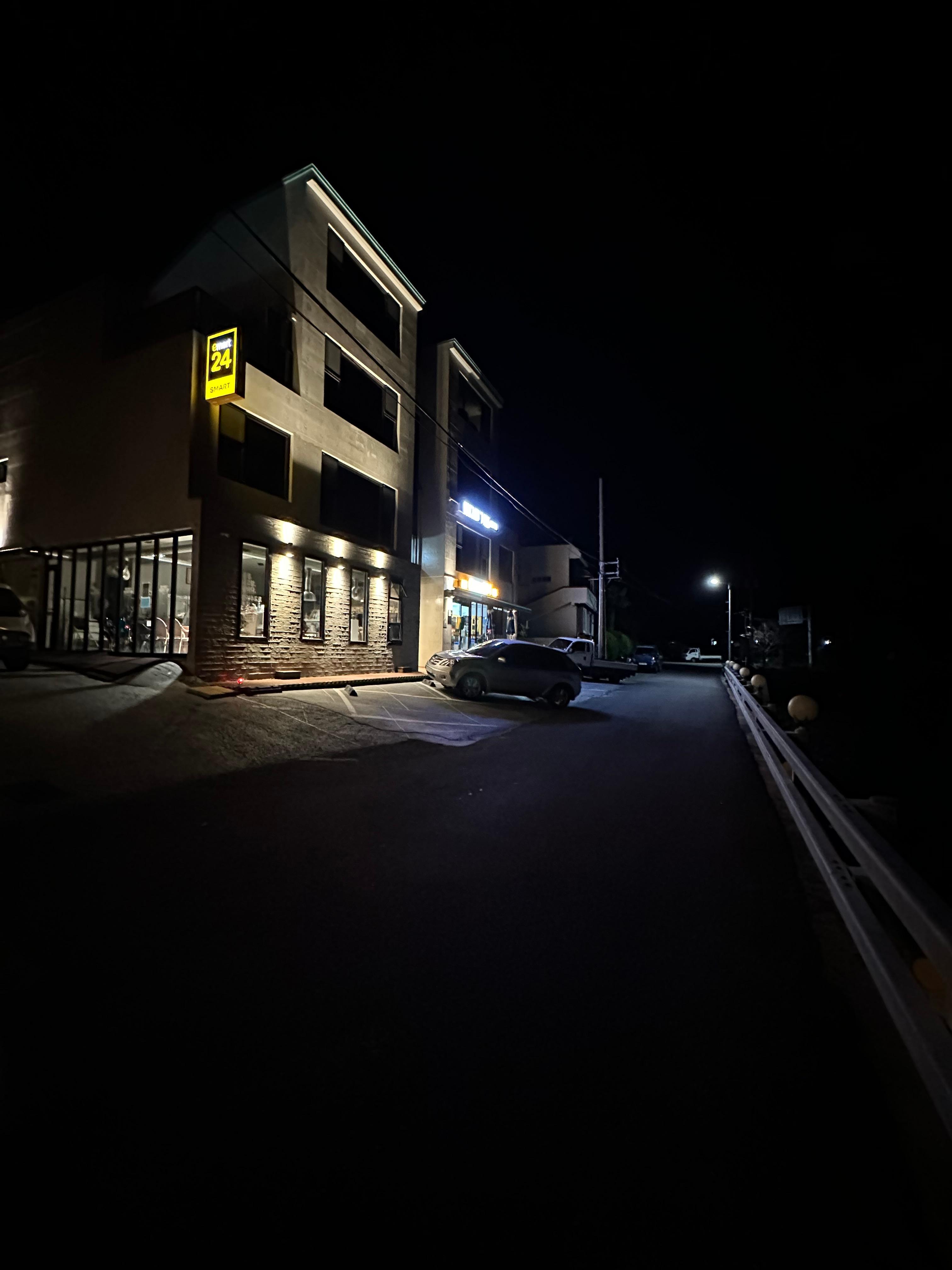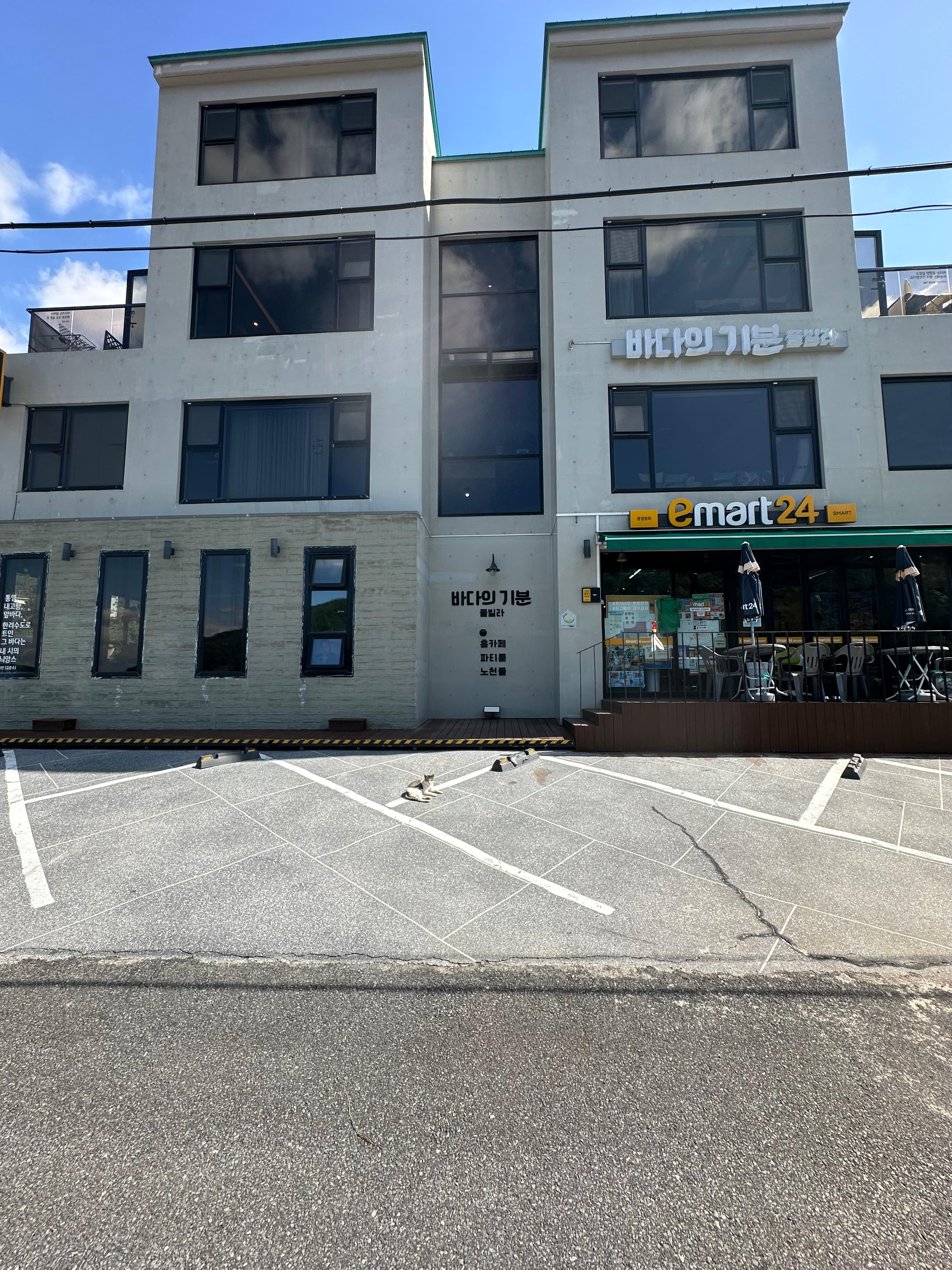 열쇠를 받아서 2-3인실 숙소에 들어와서 짐을 풀고 방을 점검했습니다. 방안에만 그대로 있기에는 아쉬운 것이 많은 슬로비게스트하우스인데요. 슬로비게스트의 장점을 셀 수 없도록 많지만 우선은 바다와 산이 있는 멋진 뷰가 있습니다. 물론 저녁이라 잘 보이지 않지만 저녁때도 조용하고 아름다운 밤을 느끼는 슬로비게스트하우스였습니다. 그래도 놀러왔으니까 과자랑 맥주 한잔 하고 싶어서 슬로비게스트하우스 옆에 몇년전부터 생긴 바다의 기분 1층에 있는 이마트24에 다녀왔었습니다.