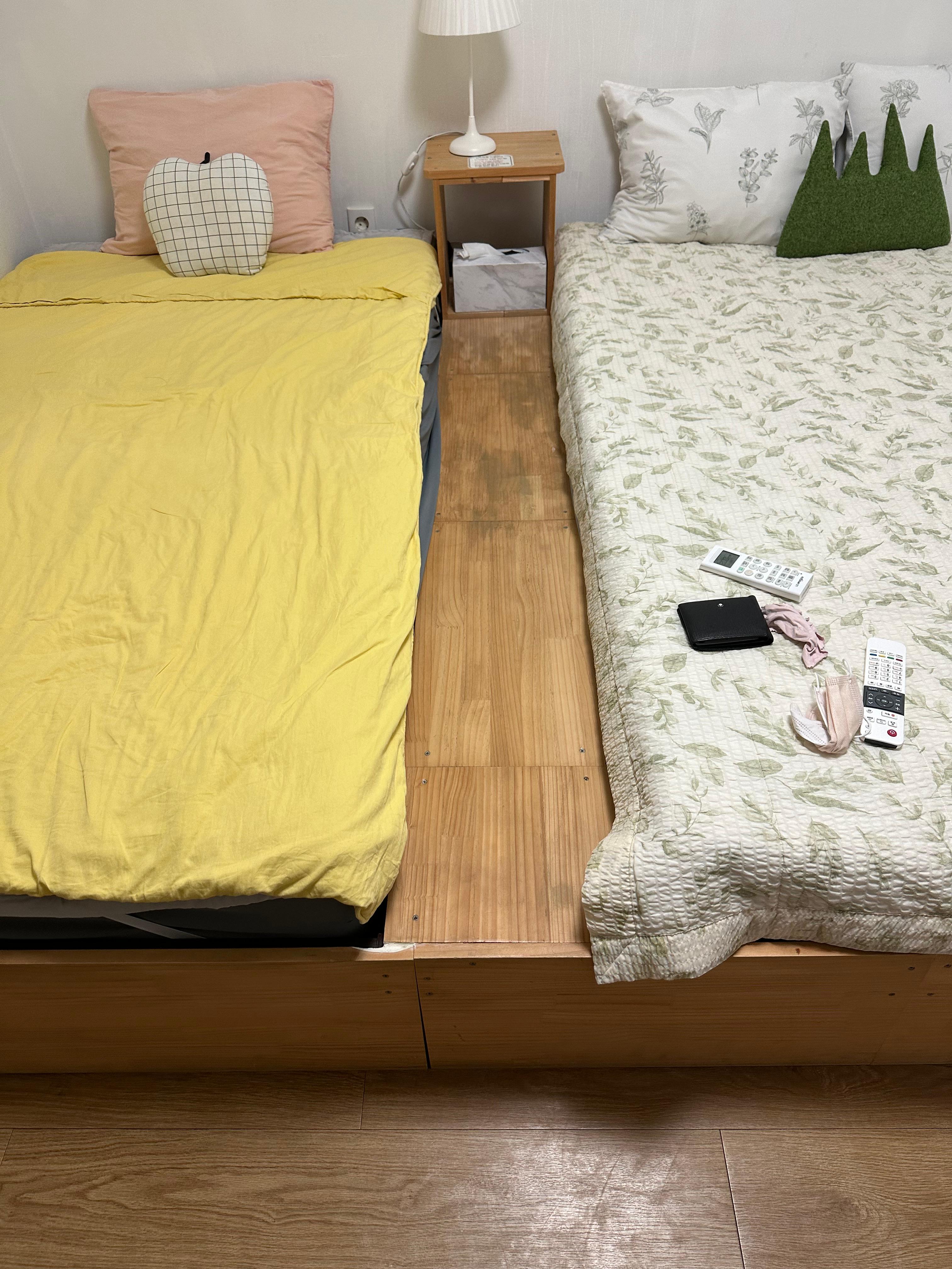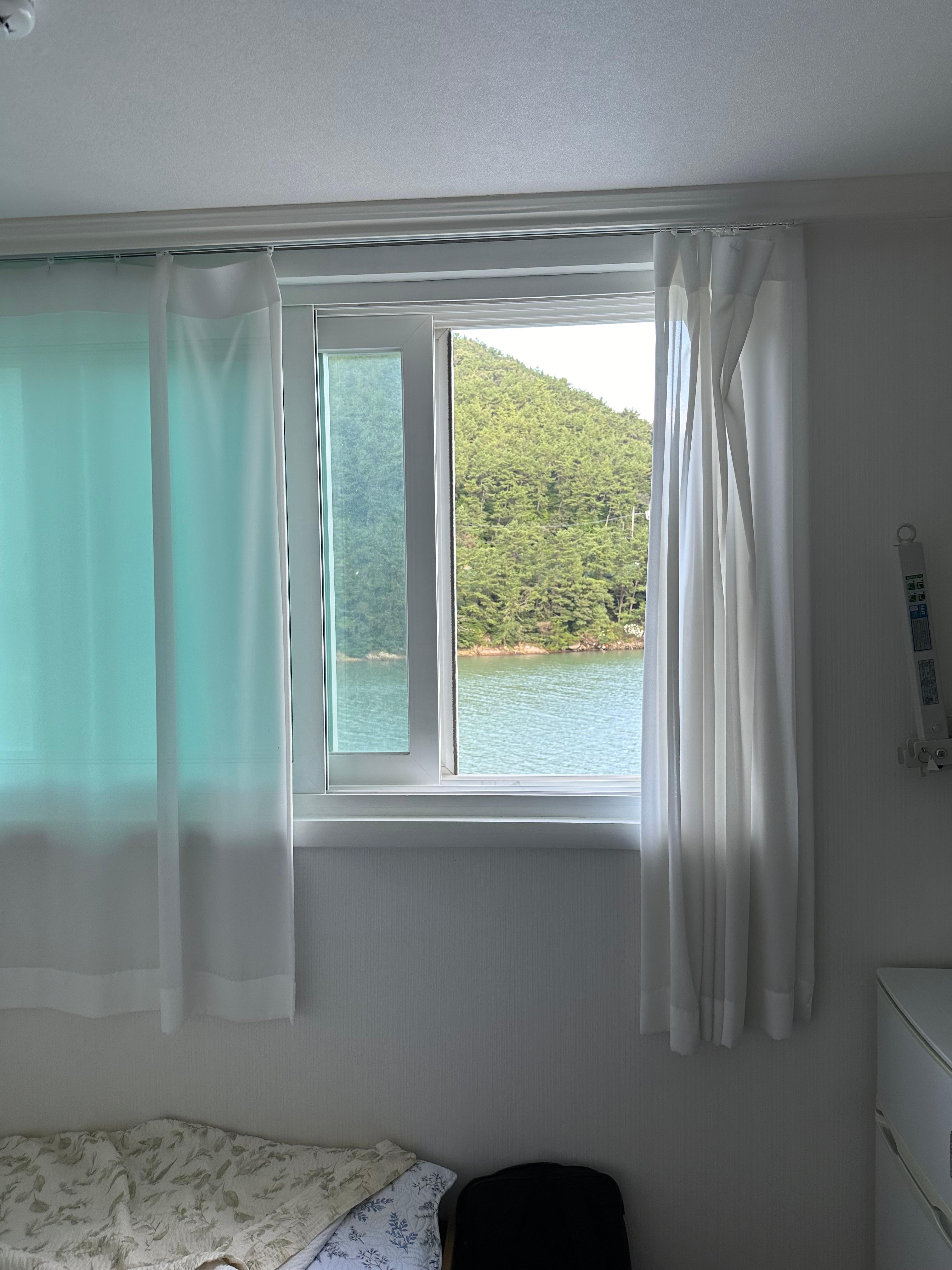 가장 중요한 것은 창문을 열면 바다가 보이는데요. 너무 늦게 도착해서 바다 사진은 낮이 되는 시간에 영상과 보여드리겠습니다. 이용하는 분들이 체격에 따라 2-3인실의 더블침대가 작을 수 도 있는데요. 그래도 평범한 체구의 경우에는 충분히 이용할 수 있을 것 같습니다.