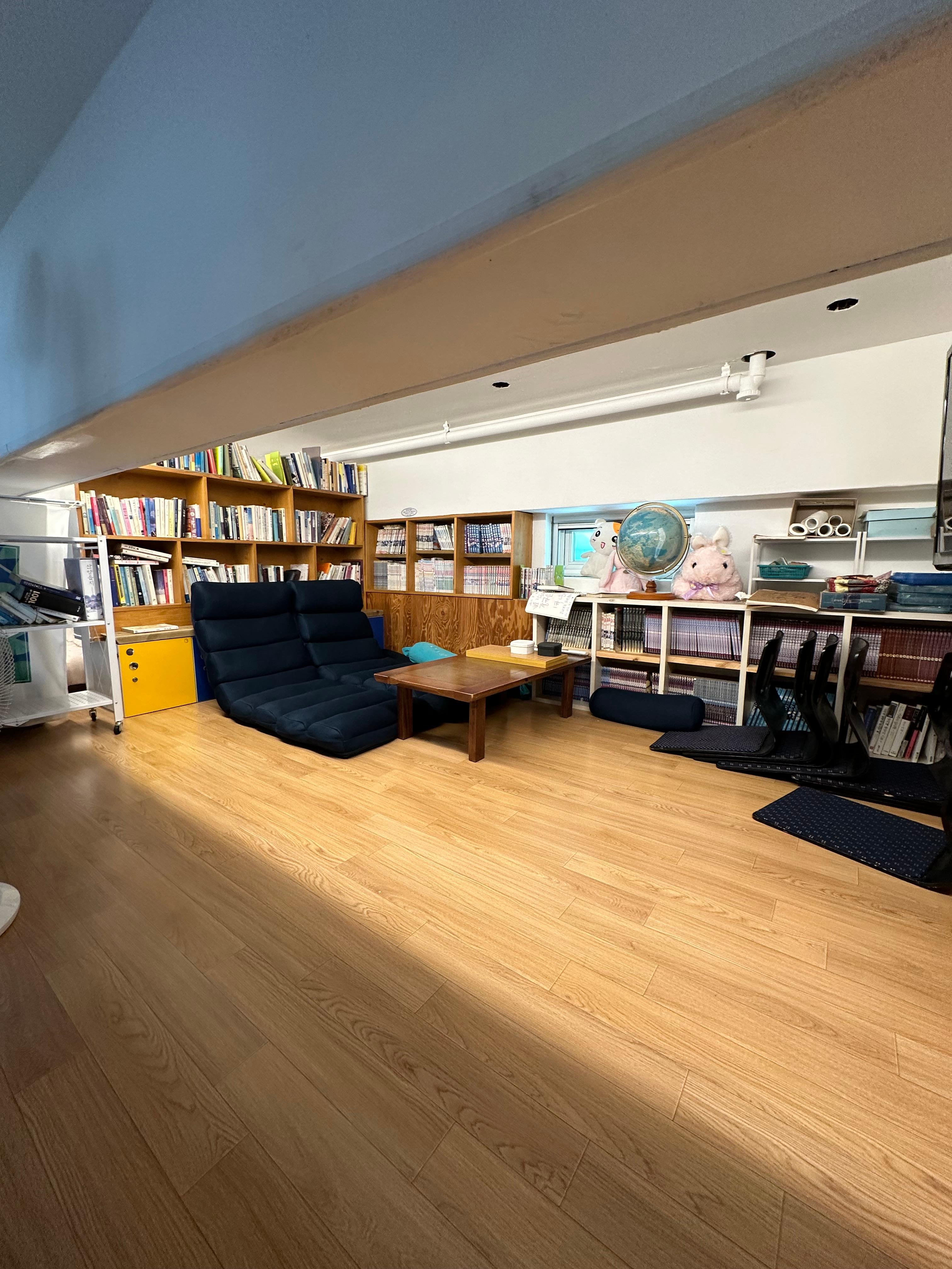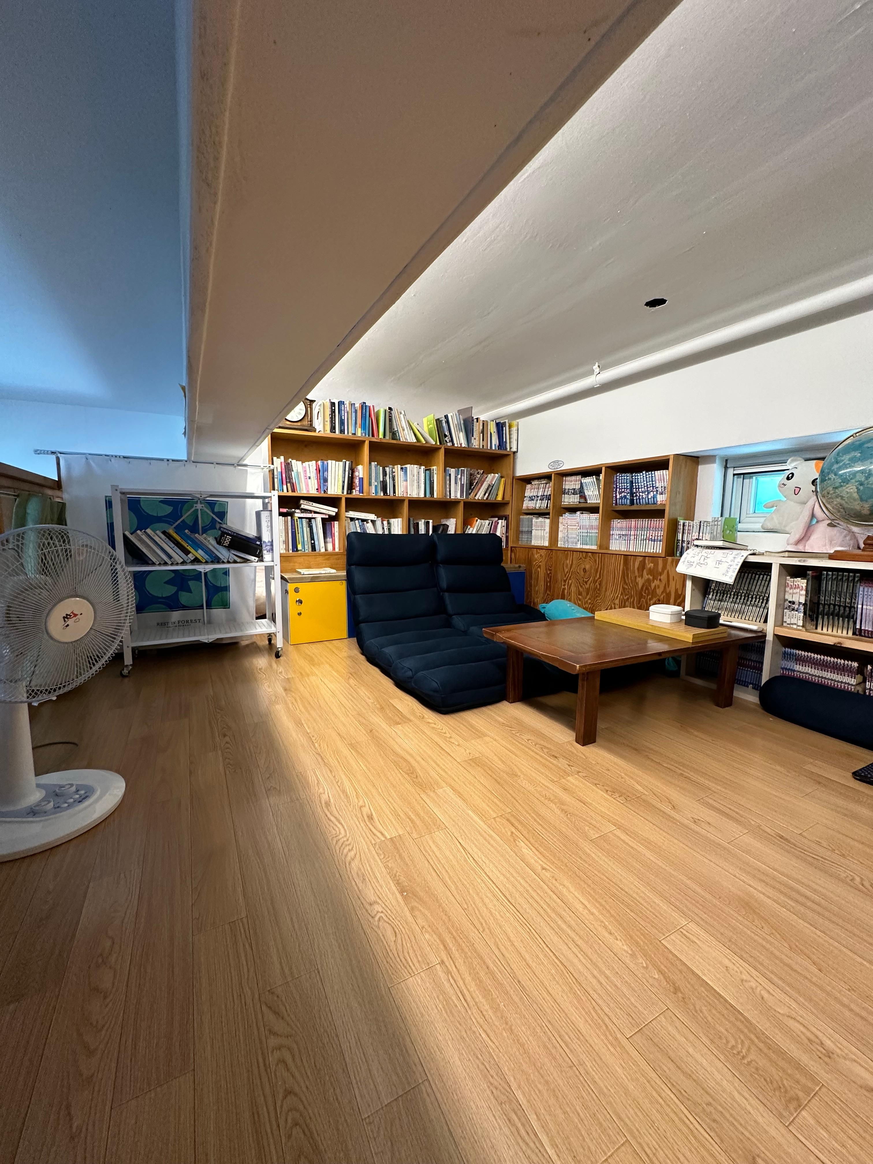 1층 슬로비 카페는 아침에는 게스트들의 식사 공간이 됩니다. 체크아웃을 할 쯤에는 카페가 되어 통영 세포마을을 찾는 사람들의 휴식공간이 됩니다. 1층 슬로비 카페 입구에는 2층으로 올라가는 다락방이 있는데요. 다락방에는 만화책과 각종 책을 볼 수 있는 공간이기도 합니다. 슬로비를 찾는 손님들의 휴식공간이 됩니다. 이렇게 1층 슬로비 카페는 저녁에는 게스트들의 소통공간이 되고, 낮에는 세포마을을 찾는 사람들의 쉼터가 되기도 합니다.