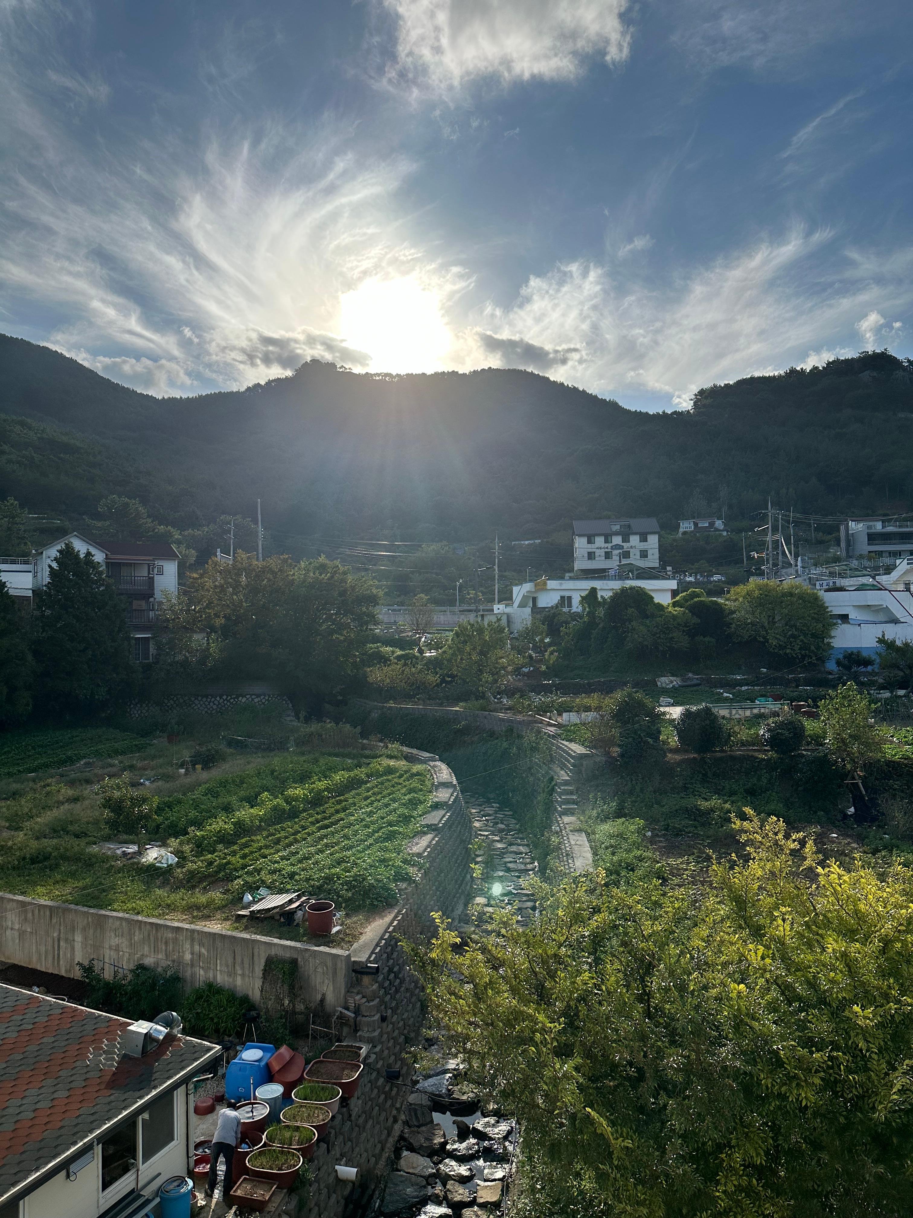 슬로비게스트하우스의 2일차을 마무리하고 꿀잠을 자고 일어났습니다. 아침에 일어나서 창문을 여니까 날씨가 맑고 산과 바다가 보였습니다.