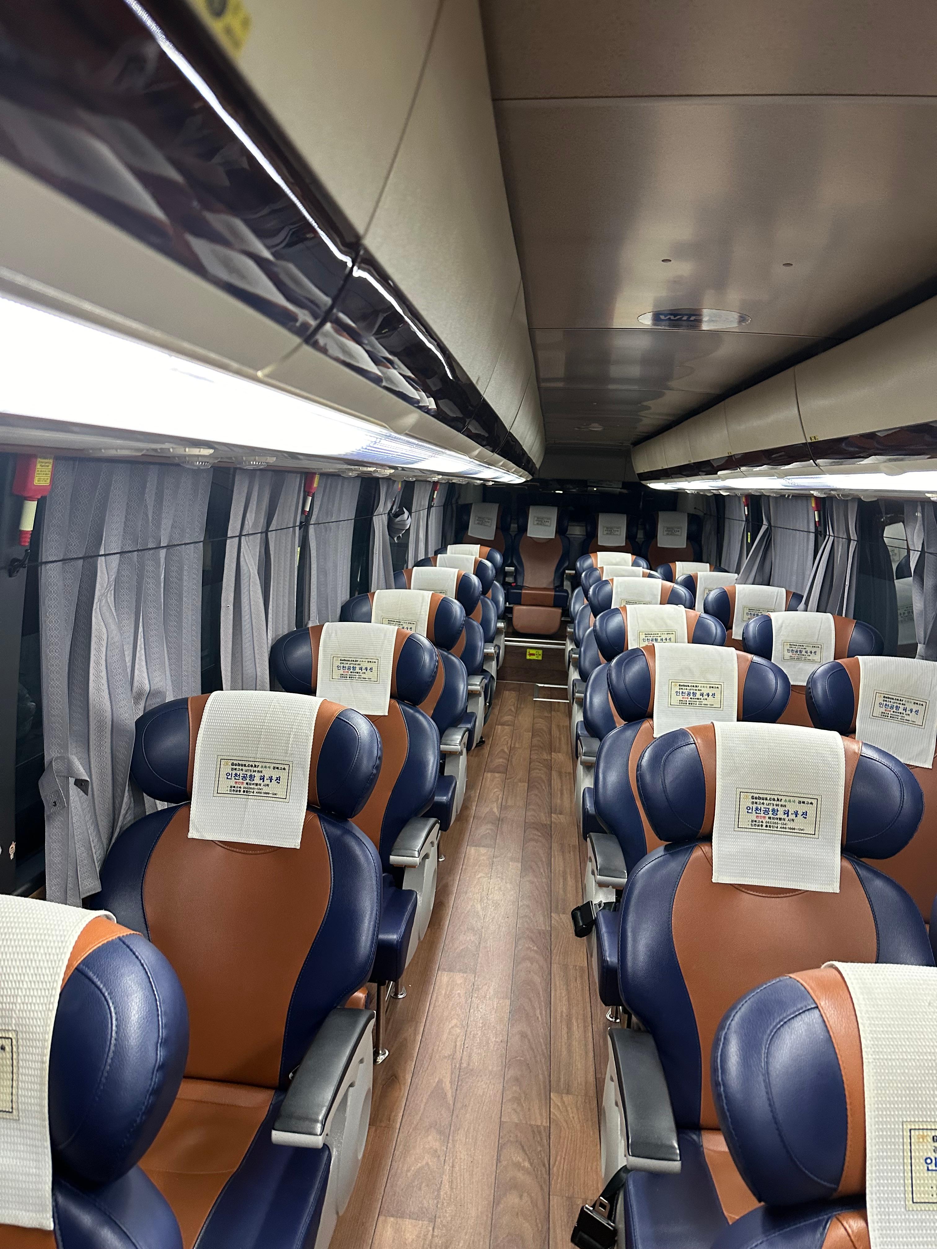 우등버스보다 더 좋은 버스는 프리미엄버스인데요. 2열 좌석도 중간에 커튼을 통해 옆사람과의 대면접촉을 하지 않는 다는 장점이 있습니다. 저는 좌석번호 9번으로 혼자 앉는 1열 좌석에 앉았습니다. 우등버스에서 혼자서 앉는 1열 좌석은 3열 , 6열, 9열, 12열, 15열, 18열, 21열, 24열, 28열이 있습니다.