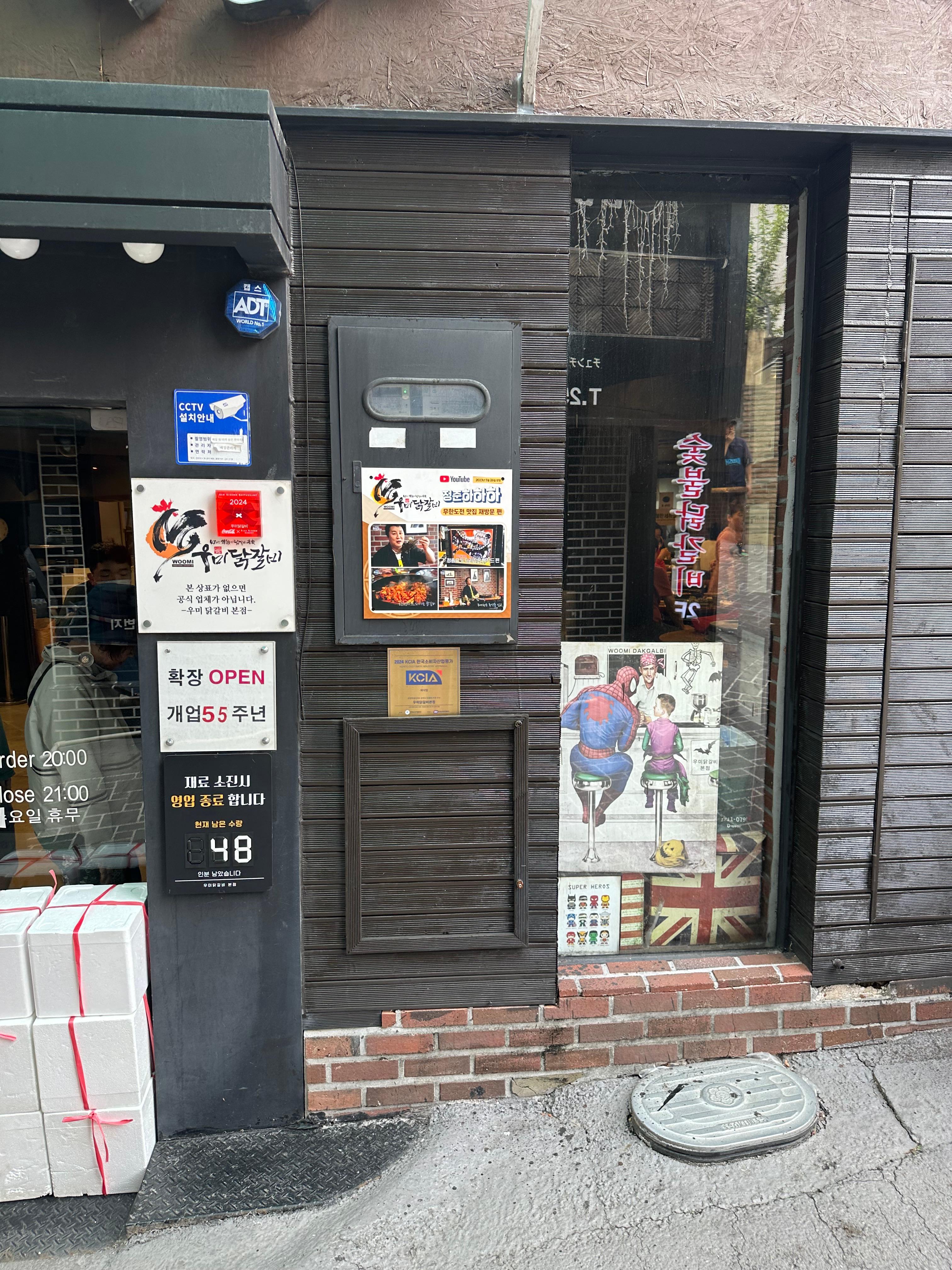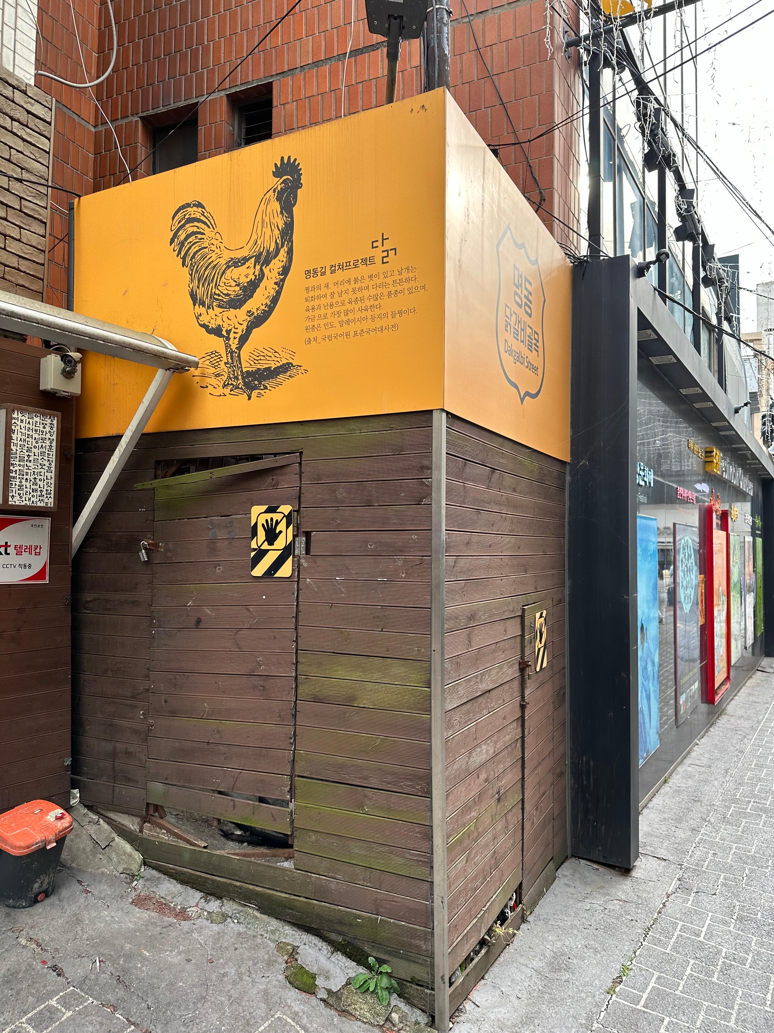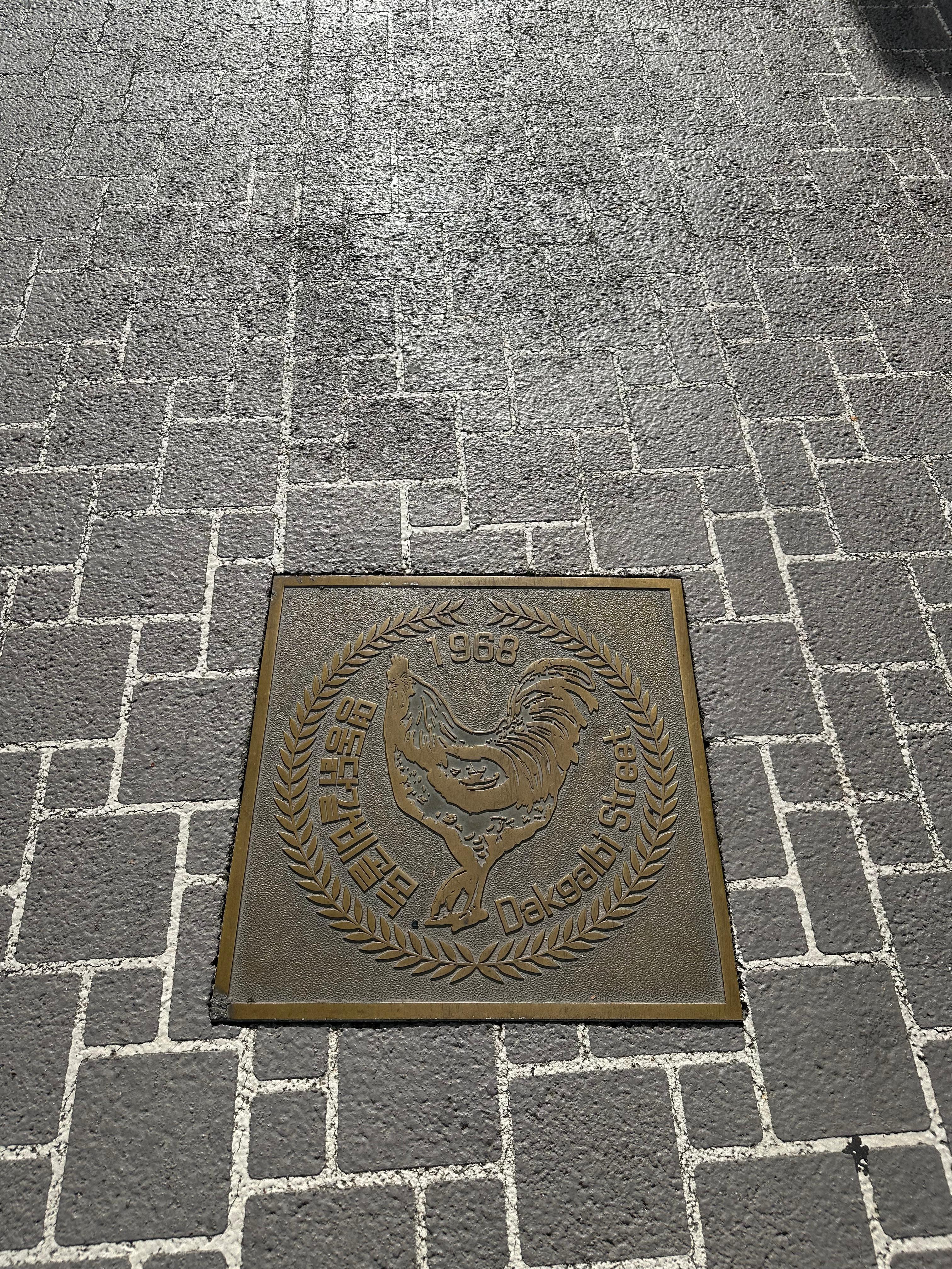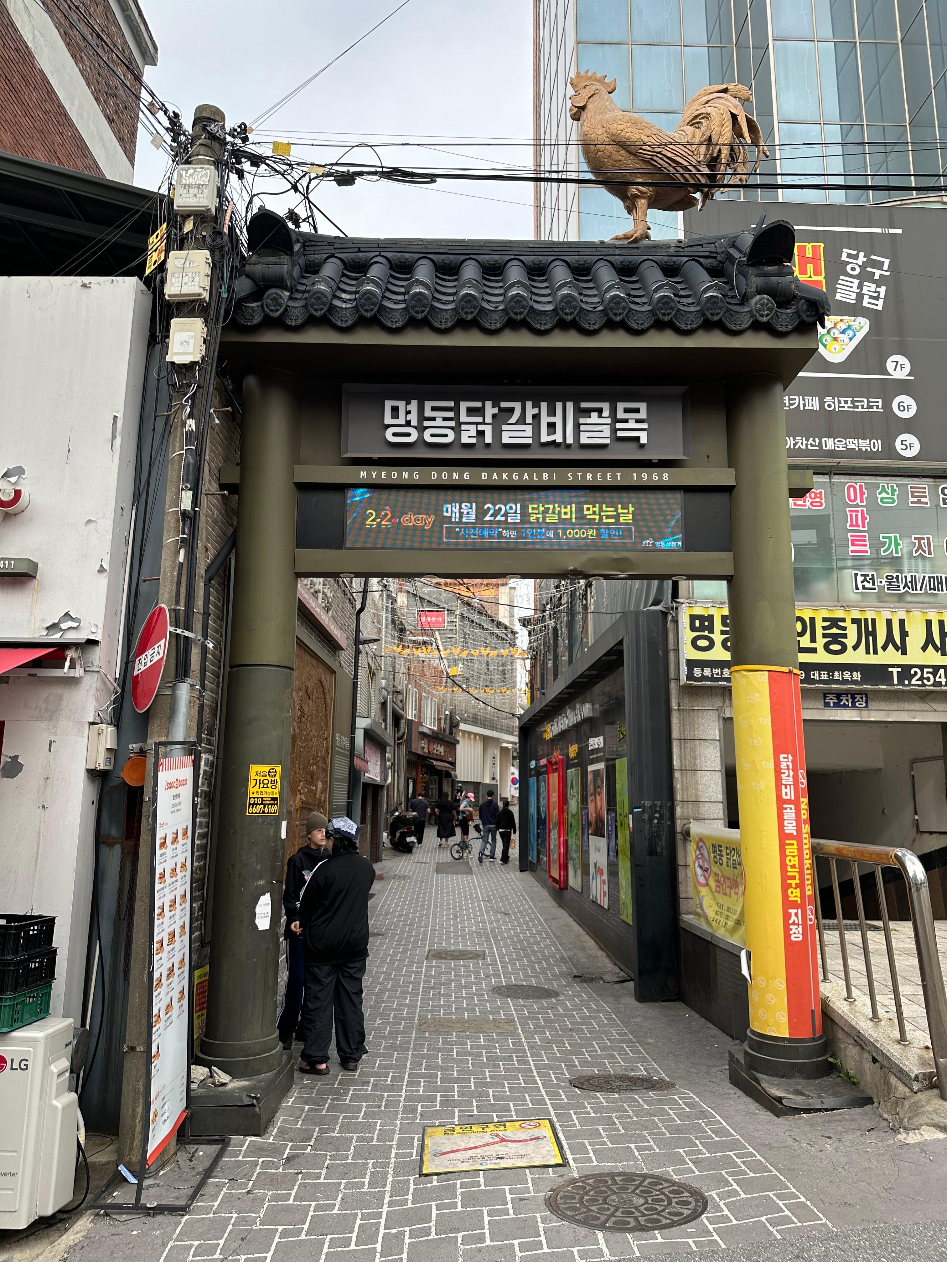 택시에서 하차한 자리에 바로 명동닭갈비골목이라는 간판을 볼 수 있고 닭갈비를 상징하는 황금색상의 닭 모형이 설치되어있어서 누가봐도