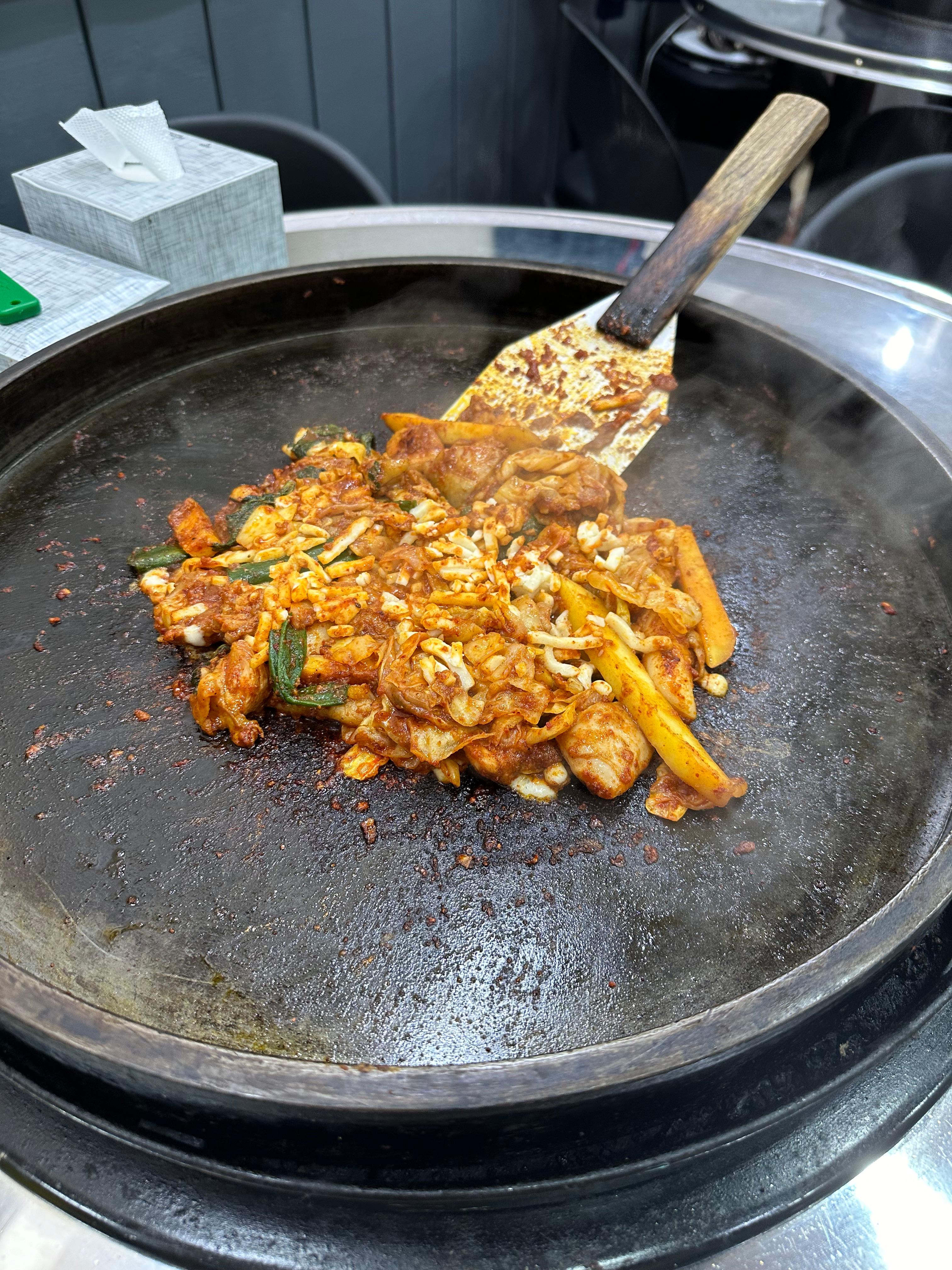 닭갈비가 맛있게 볶아지고 먹을 때가 된 순간에 그 때 치즈를 넣는데요. 치즈를 넣어서 치즈가 잘 녹을 시점에서 다시 한번 골구로 섞어서 치즈닭갈비를 완성하게 됩니다. 사실 닭갈비를 가장 빠르고 맛있게 먹는 것은 순수 오리지날 닭갈비 먹느넥 좋은데요. 닭갈비 자체가 약간 매운맛이 느껴지는데요.