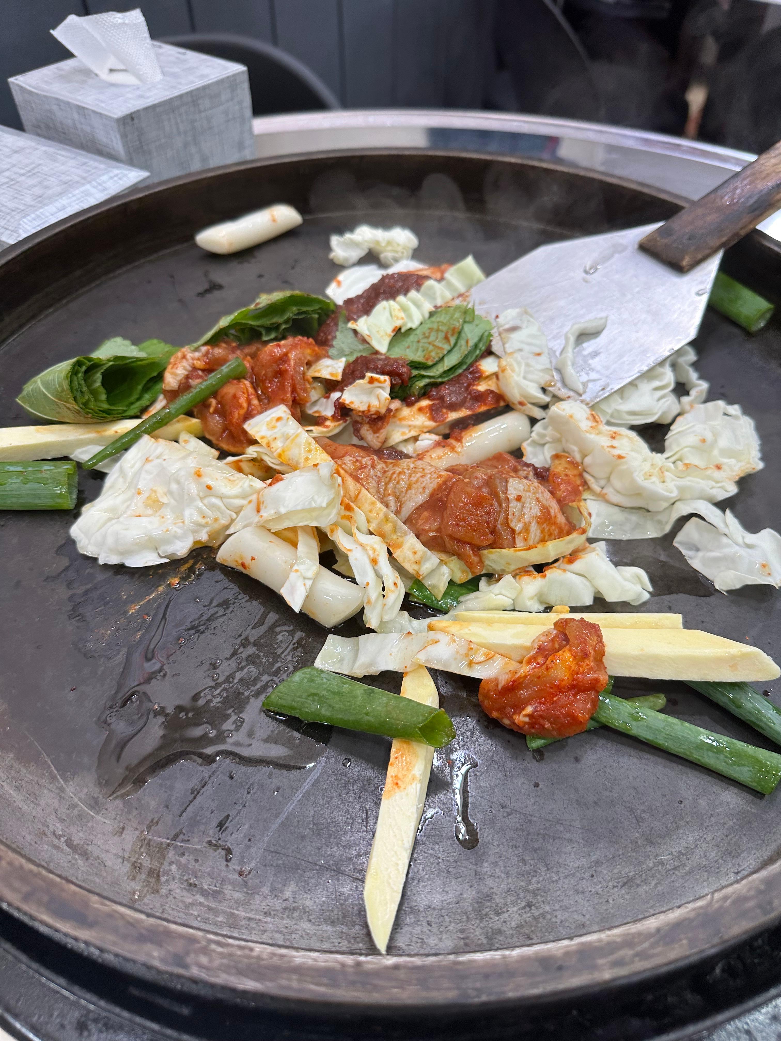 판에 올려두고 불을 켜놓는데요. 불에 판이 익을 때 닭갈비를 저어줄 경우 이렇게 빨갛게 양념에 의해 닭갈비가 볶아지는 것을 볼 수 있습니다. 치즈는 좀 더 익히고 구운다음에 넣고 있었습니다. 보기만 해도 정말 맛있어보이는데요.
