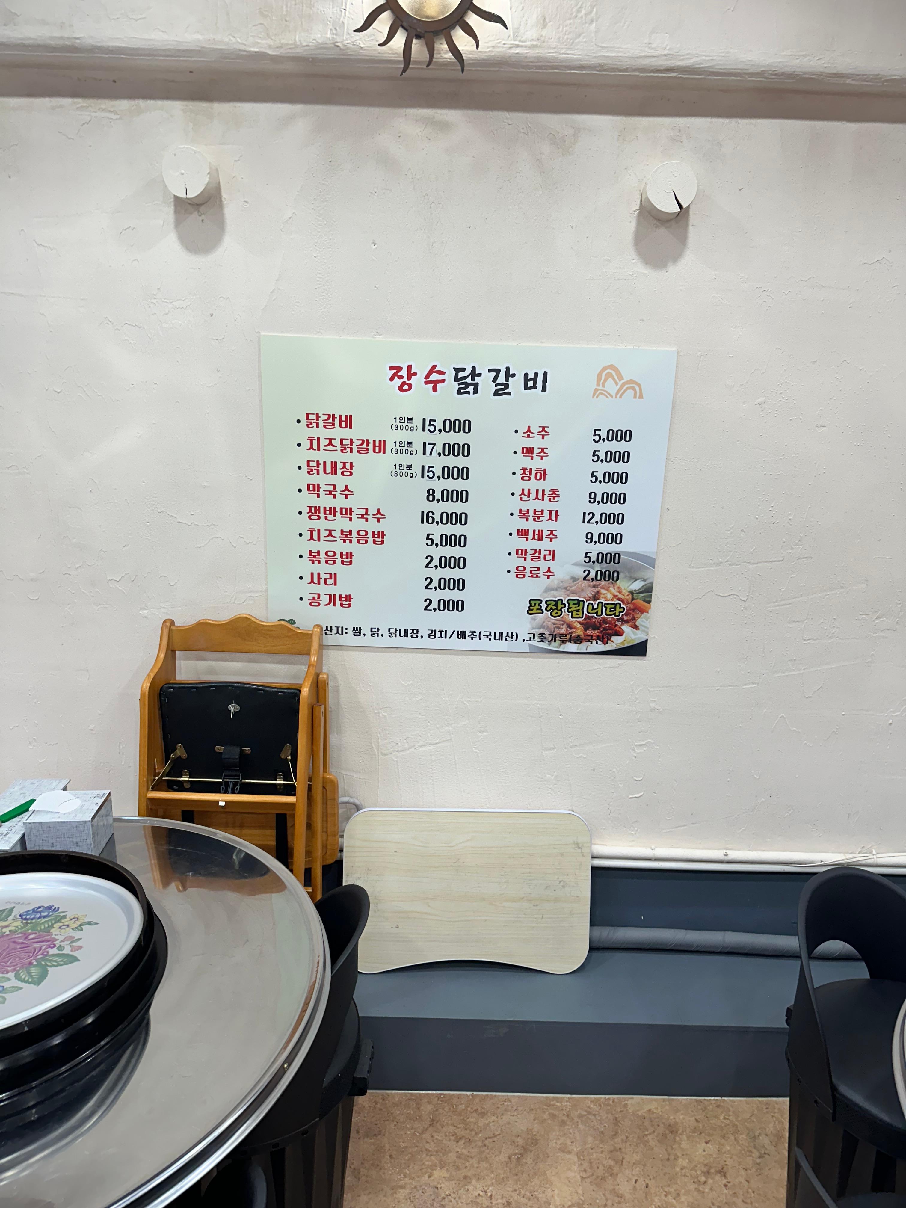 춘천 명동닭갈비골목안에 위치한 장수닭갈비집에 들어가서 자리를 잡고 메뉴를 고르기 시작했습니다. 닭갈비와 치즈닭갈비 중에 고민되었는데요. 특히 춘천 명동닭갈비 집들은 대부분 1인분도 가능한 집이었습니다. 작년 9월이전에도 혼자와서 먹은적도 있는데요 혼자오더라도 편하게 주문하고 먹을 수 있었습니다. 원래 닭갈비 집에는 숯불닭갈비도 있었는데 당시 춘천명동닭갈비에는 숯불은 메뉴판에 보이지 않았습니다.