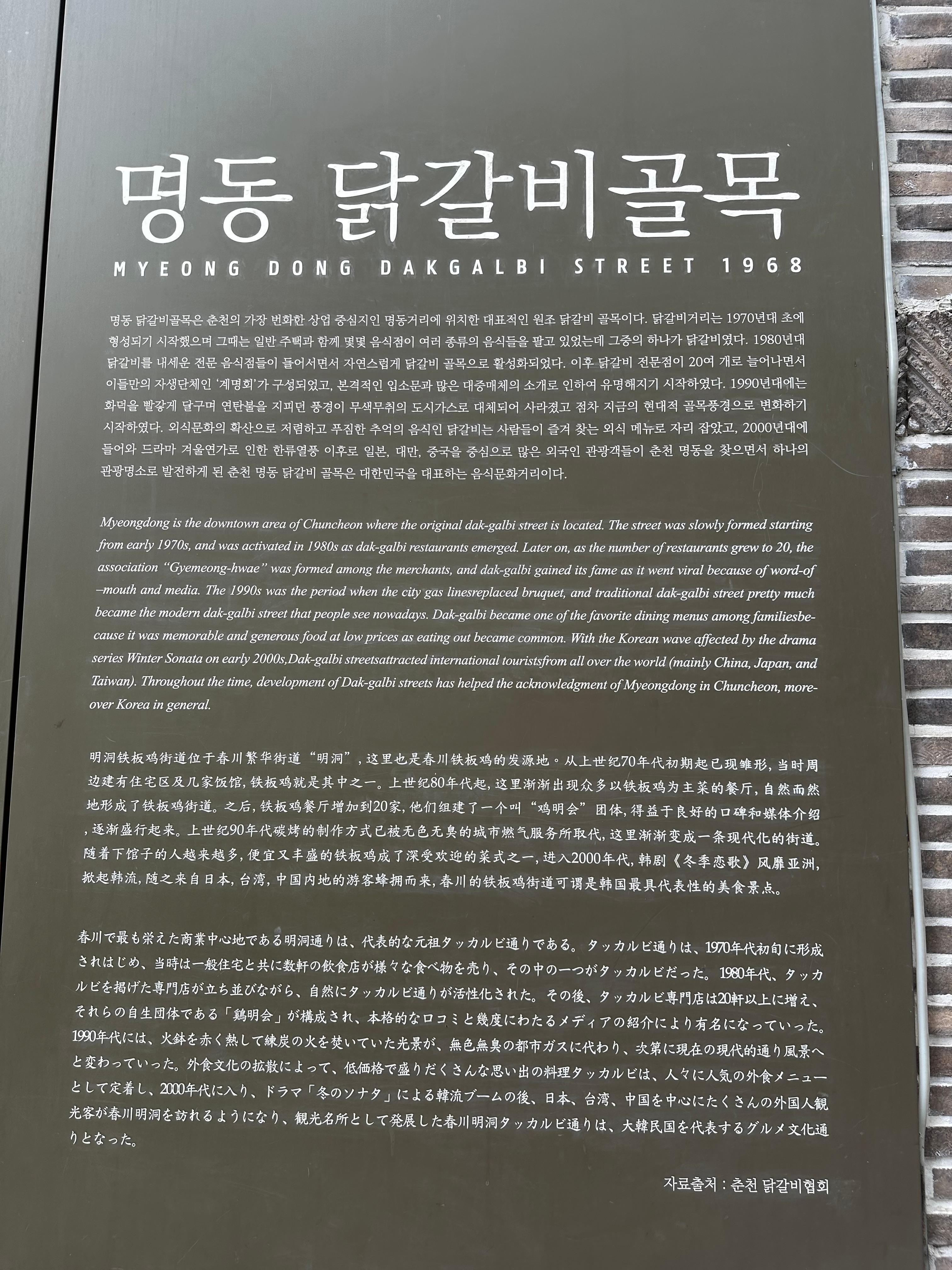 - 1970년대 초대에 형성되기 시작했으며 그때는 일반 주택과 함께 몇몇 음식점이 여러 종류의 음식들을 팔고 있었는 그 중 하나가 닭갈비였다.