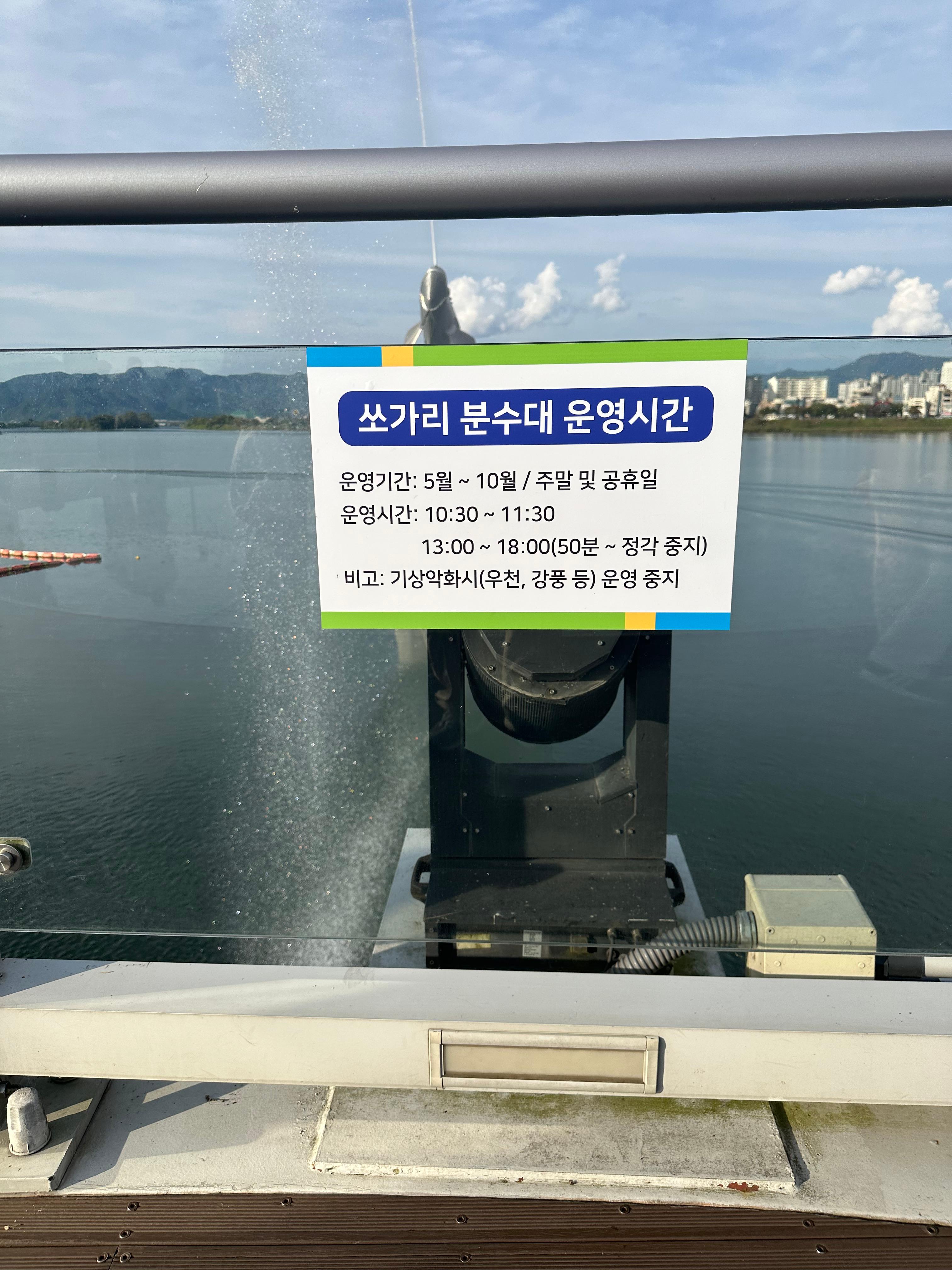 스카이워크 입구에서 보았던 삭도라는 것을 스카이워크 전망대 데크에서 볼 수 있습니다. 3호 삭도인 쏘가리 기초상이라는것인데요. 지금은 삭도의 역할을 하지 않기 때문에 쏘가리 분수대라는 이름을 갖고 있습니다. 쏘가리 분수대 위로 시원한 물이 나오는 것을 볼 수 있습니다.