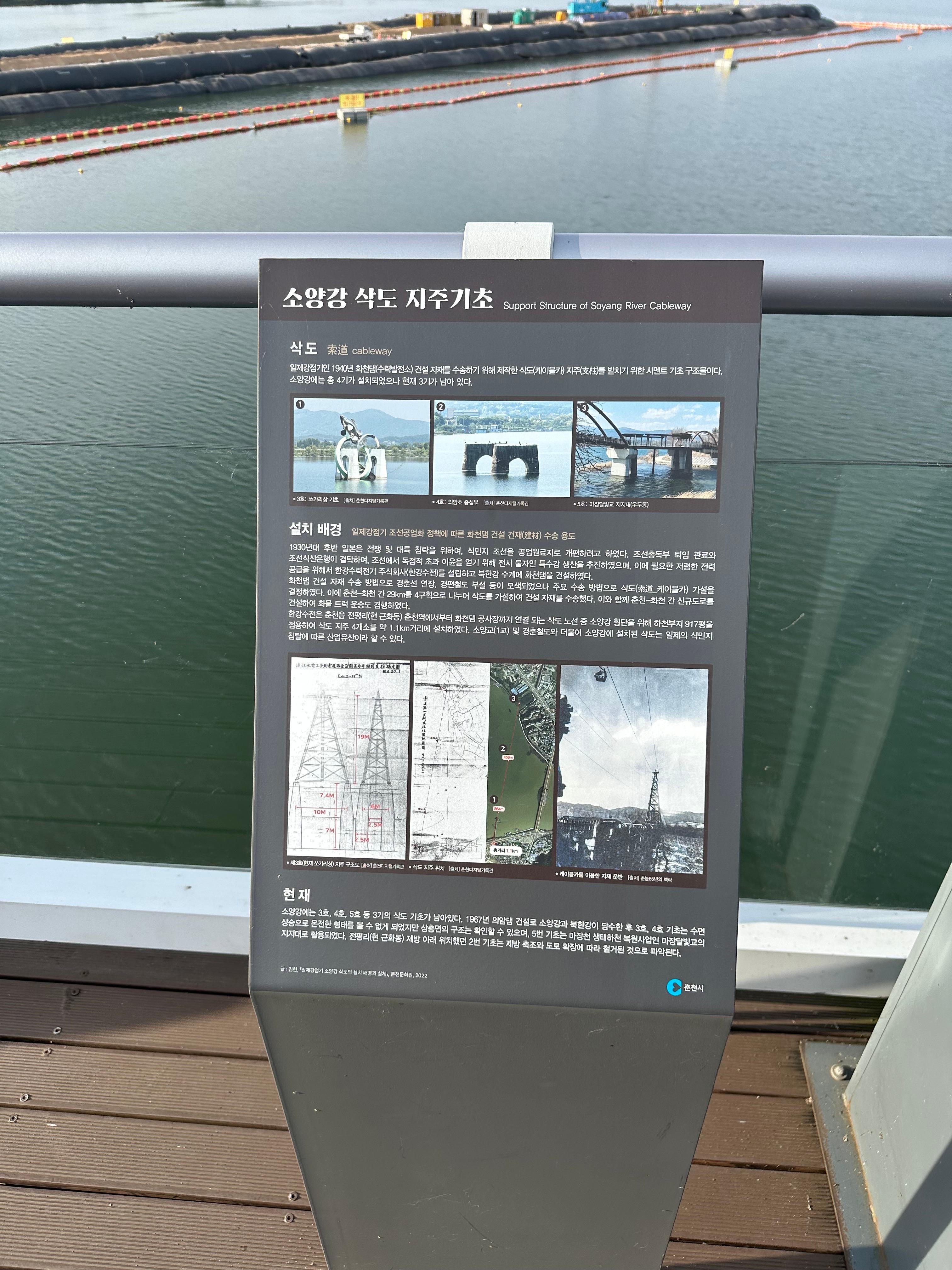 지금은 소양강에서 보이지 않고 사라지고 다리 기둥만 보이는데요. 소양강에는 일제 시대부터 지어졌던 삭도라는 다리가 있었습니다. 하지만 지금은 일부 기둥만 있고 멀리서 소양강 대교가 그 역할을 하고 있습니다.