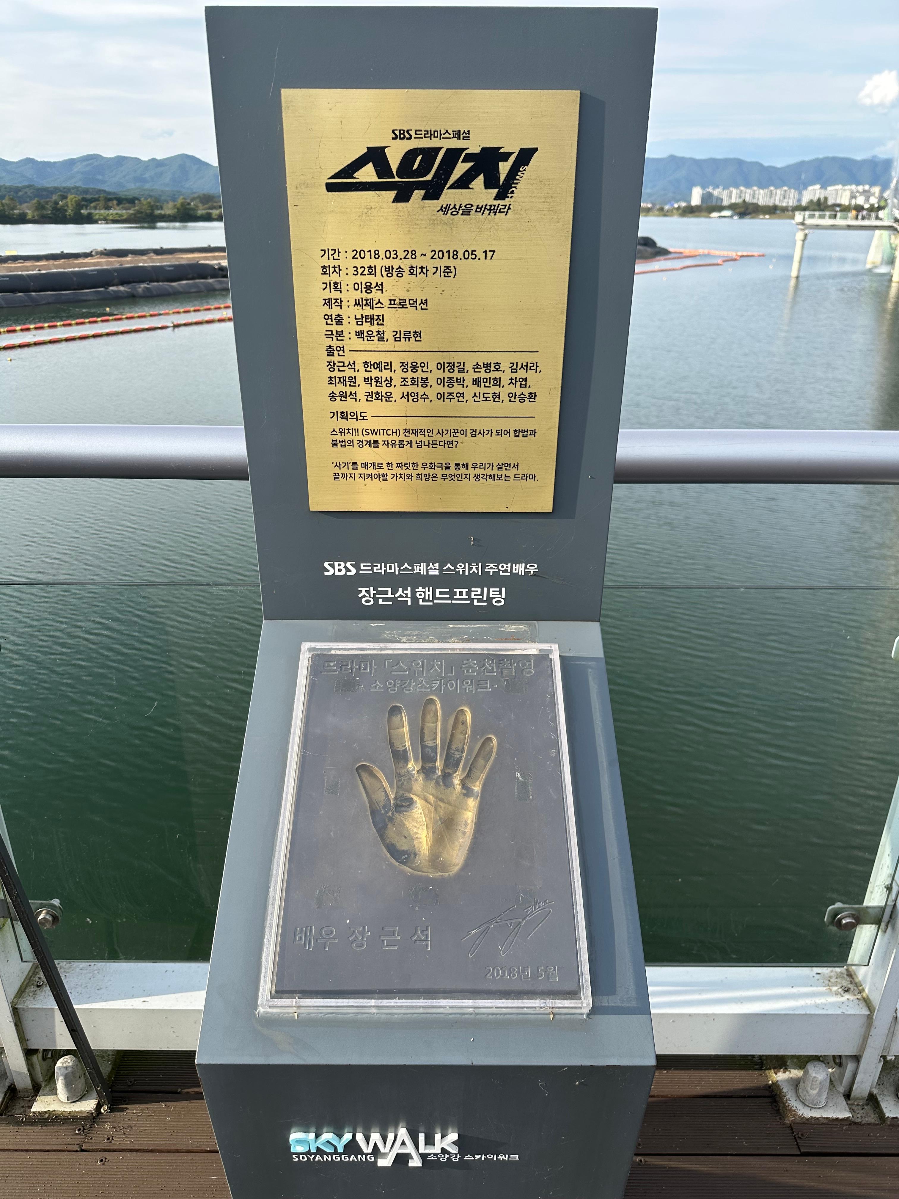 소양강 스카이워크에서는 2018년 3월 28일부터 5월 17일까지 SBS에서 방영했던 드라마 스페셜 스위치의 촬영장이기도 한데요. 배우 장근석의 핸드프린팅도 소양강 스카이워크에서 볼 수 있었습니다. 저도 소양강 스카이워크를 온 것은 2018년 10월이었는데요. 거의 7년만에 10년이 되기전에 왔었던것같습니다. 제가 처음 스카이워크에 오기 2-3달전쯤에 이곳에서 드라마 촬영도 있었습니다.