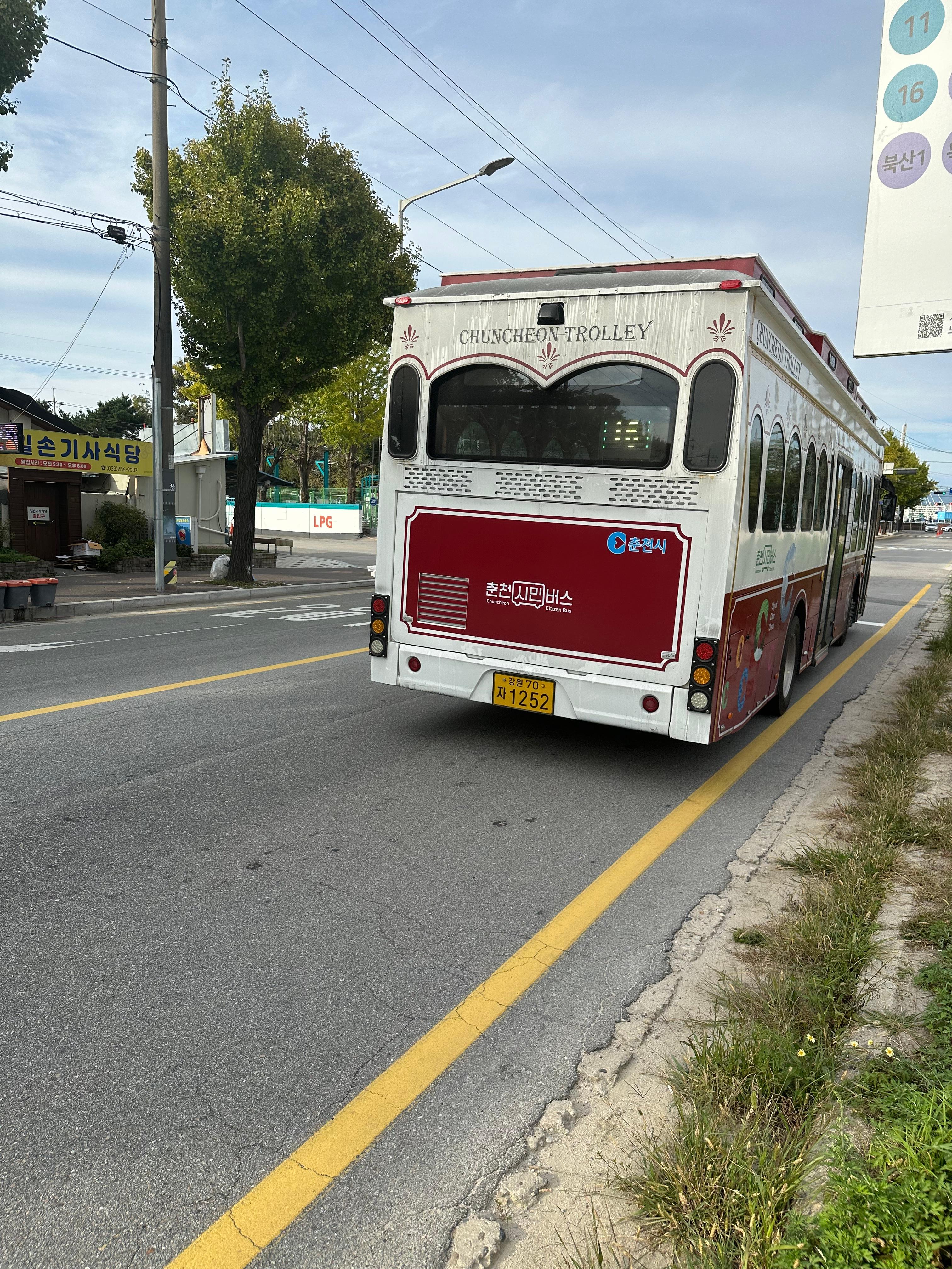 춘천명동닭갈비에서 스카이워크까지는 도보로 간다고 하면 갈 수 있는데요. 우선 춘천역까지 30분 정도 걷고 춘천역에서 다시 20-30분을 걸으면 갈 수 있습니다. 그래도 편도로만 거의 1시간이기 때문에 버스를 타는 것을 추천합니다. 하지만 명동닭갈비골목에서 버스 타러 가는데 트롤리버스가 보이는 것이었습니다. 처음에는 버스 위치를 잘몰라서 엉뚱한데서 트롤리 버스를 놓쳤는데요. 트롤리버스는 바로 1년전 가을에 다녀왔던 춘천삼악산호수케이블카까지 가던 16번 버스였습니다. 그 당시만 해도 16번 버스는 일반 버스였는데요. 하지만 16번 버스는 춘천 레고랜드까지 연장을 하고 관광객이 잘 찾아오지 않자 16번 버스를 트롤리버스로 교체해서 레고랜드까지 연장운행하고 있었습니다. 아무튼 16번 버스 한대 놓치고 지도 따라 정류장에서 10분정도 기달려 다음 16번 버스를 탑승했습니다. 16번 버스가 모두 트롤리는 아니고 일부는 일반버스였지만 운이좋게도 트롤리버스 한대 놓치고 다음에 온 버스도 트롤리 버스였습니다.