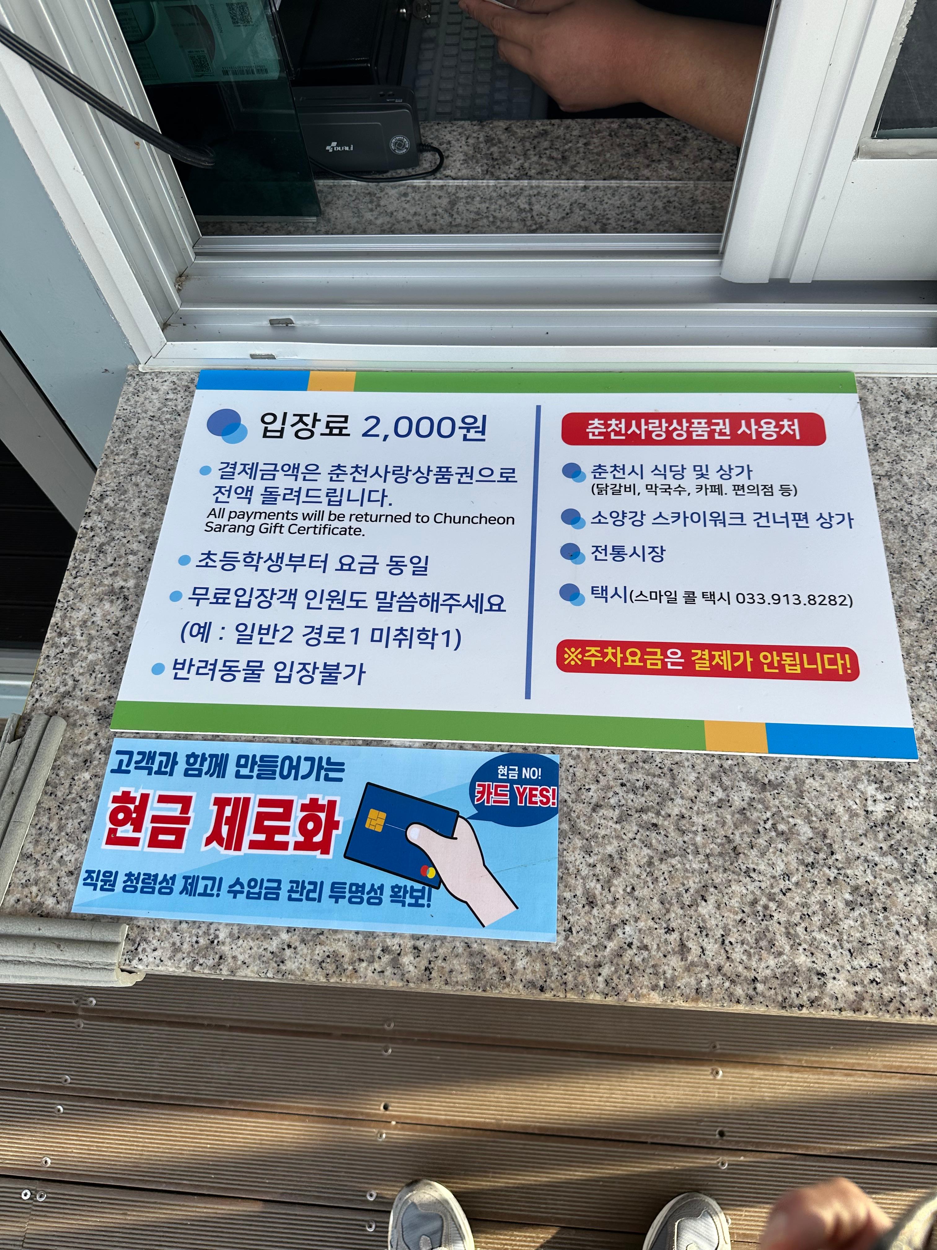 소양강 스카이워크는 무료 입장은 아니고 입장료가 있었습니다. 하지만 입장료는 부담되지 않는 금액이었습니다. 비싸지 않은데도 불구하고 소양강 스카이워크를 이용하면 지역 상품권을 받을 수 있는데요. 지역상품권을 이용해서 대형마트가 아닌 중소시장에서 이용 할 수 있었습니다.