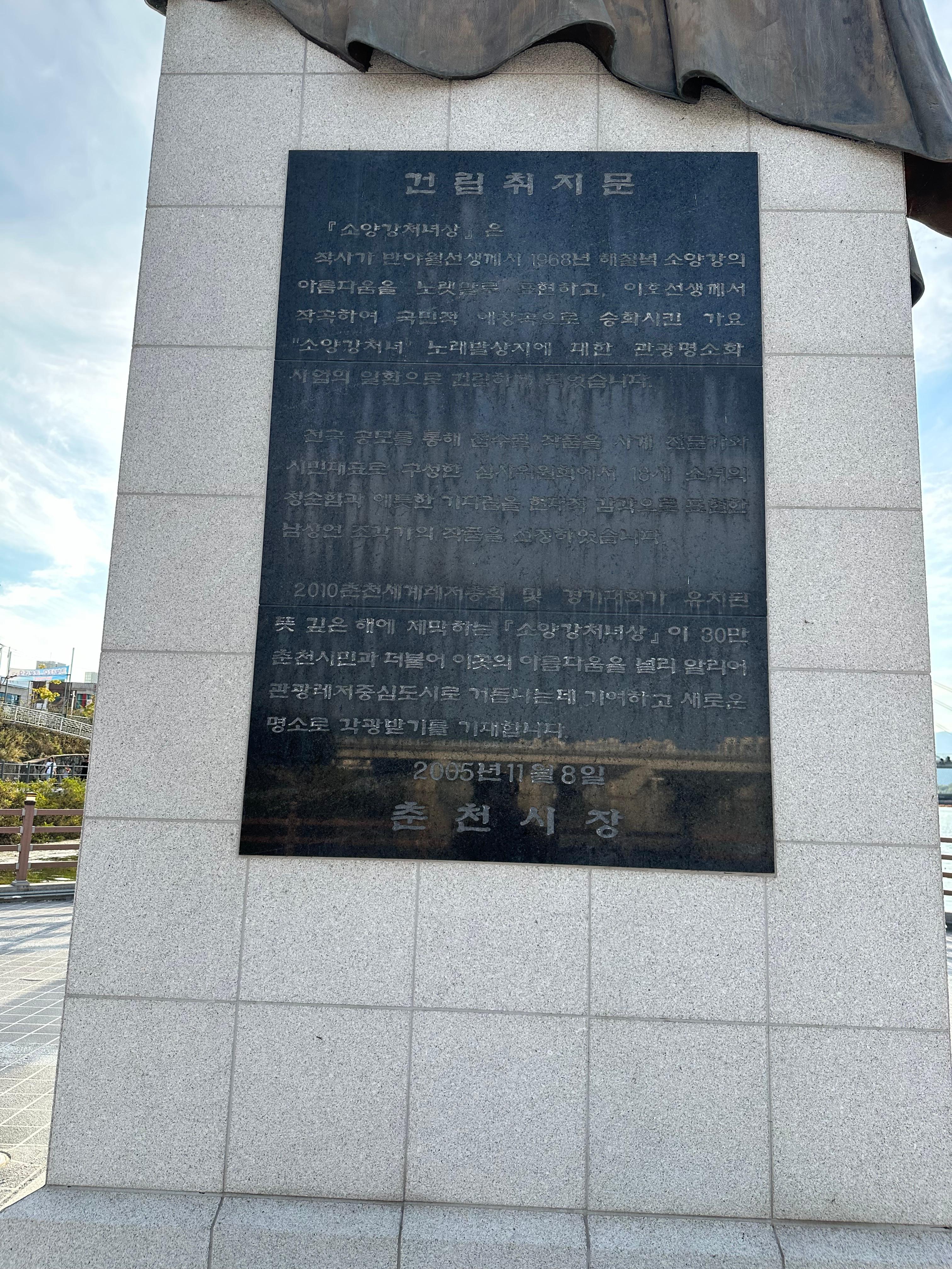 소양강 따라서 소양강 처녀상 아래로 내려가는 계단이 있었구요. 소양강 처녀상은 2005년 11월 8일에 춘천시장에 작사가 반야월 선생께서 1968년 해질녘 소양강의 아름다움을 노래말로 표현하고 이호선생께서 작곡하여 국민적 애창곡으로 승화시킨 가요 소양강처녀 노래발상지에 대한 관광명소화 사업의 일환으로 건립하게 되었다는 내용입니다.