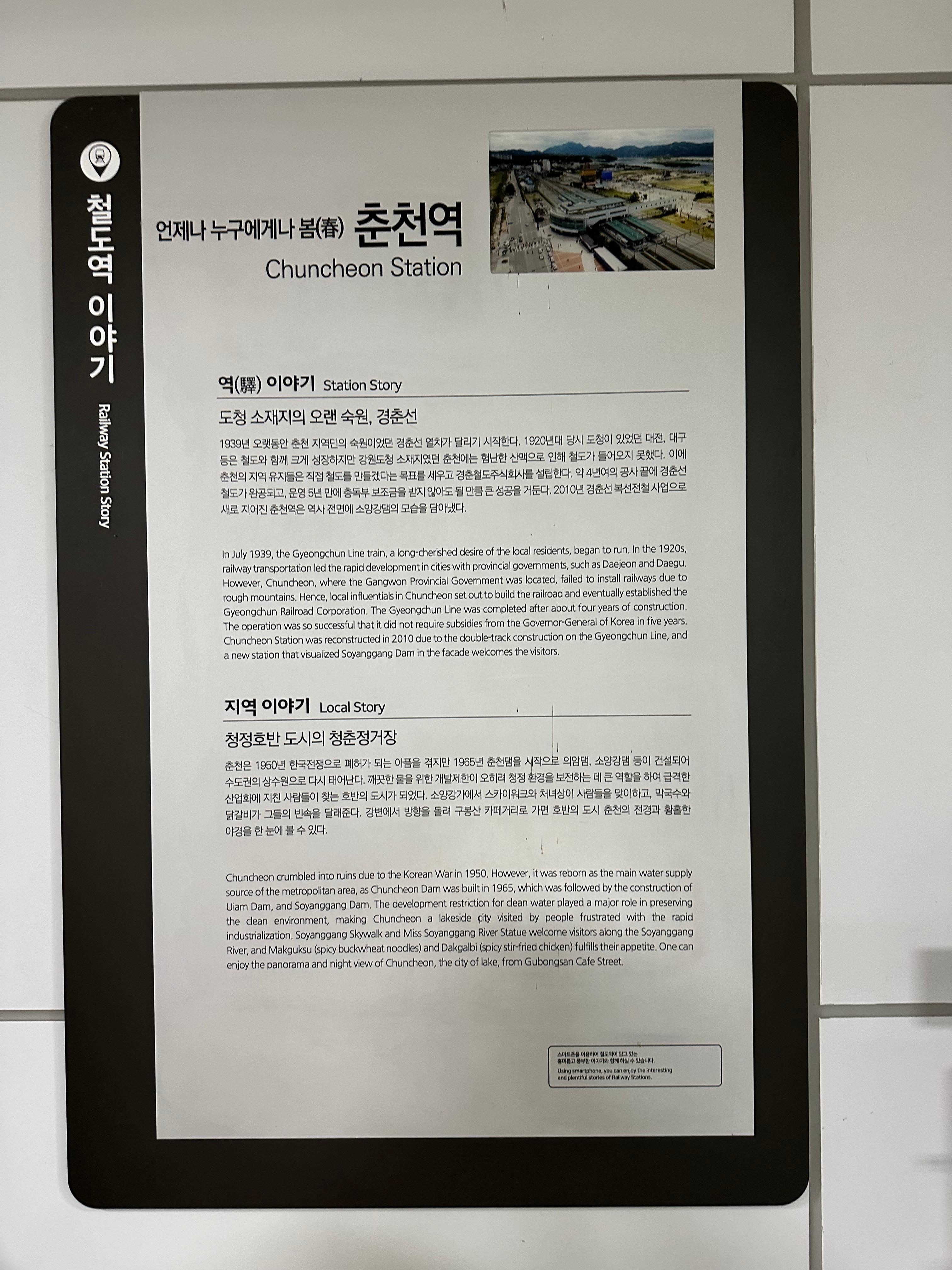 기차 역에 갈 때마다 그 지역의 기차역에 담긴 다양한 역사 이야기를 볼 수 있습니다. 춘천역도 제가 다녔던 목포, 순천, 전주, 강릉, 부전, 경주역만큼 역사가 깊은역인데요. 우리나라 경춘선의 종점이 바로 춘천역입니다. 특히 강원도는 산이 많아 기차가 다니기 힘든 구조였는데요. 춘천 역시 구조상 기차가 쉽게 들어올 수 없었다고 합니다. 하지만 지역 주민들이 힘을 합쳐서 만든 곳이 바로 경춘선 철도라고도 합니다.