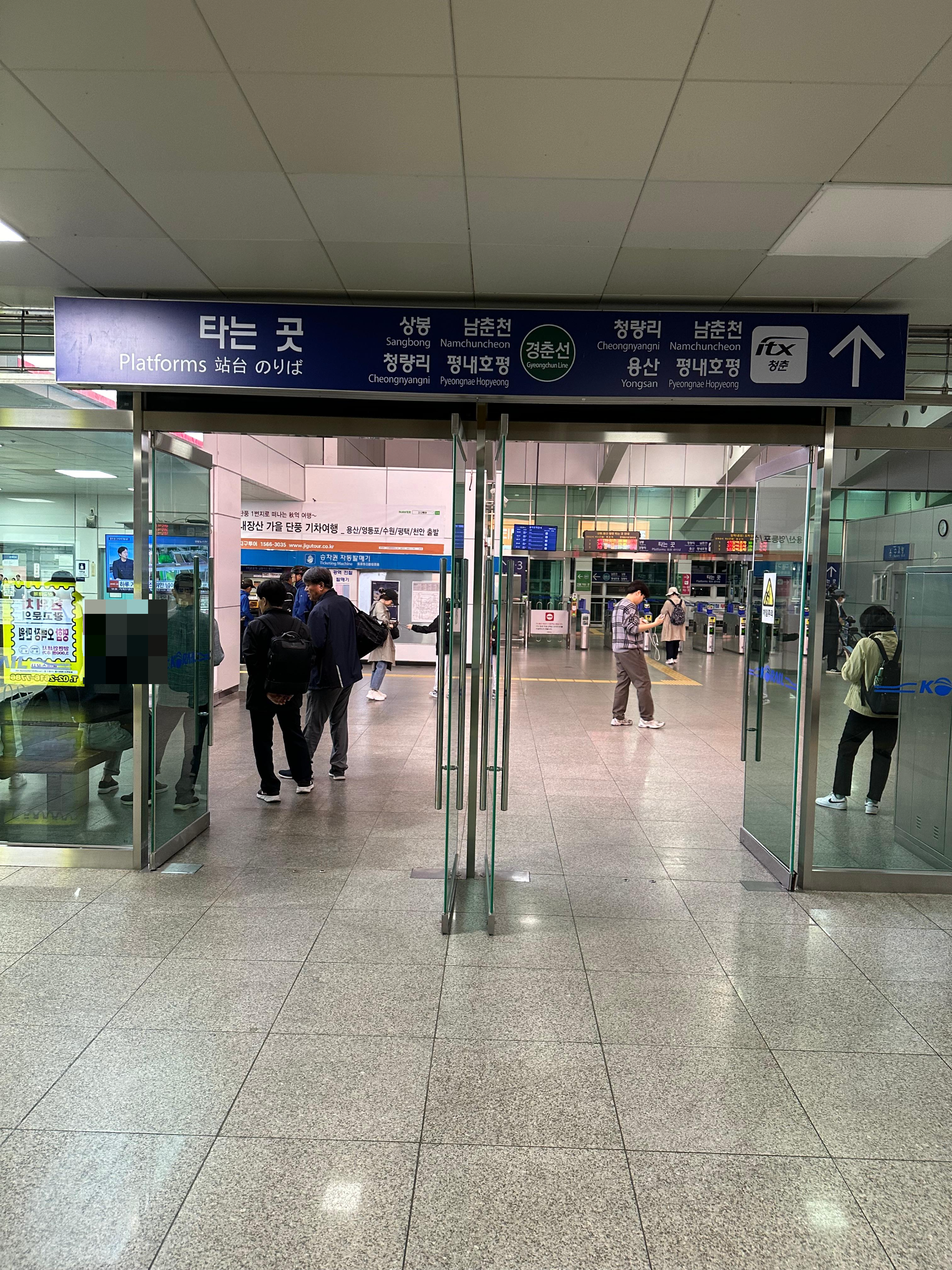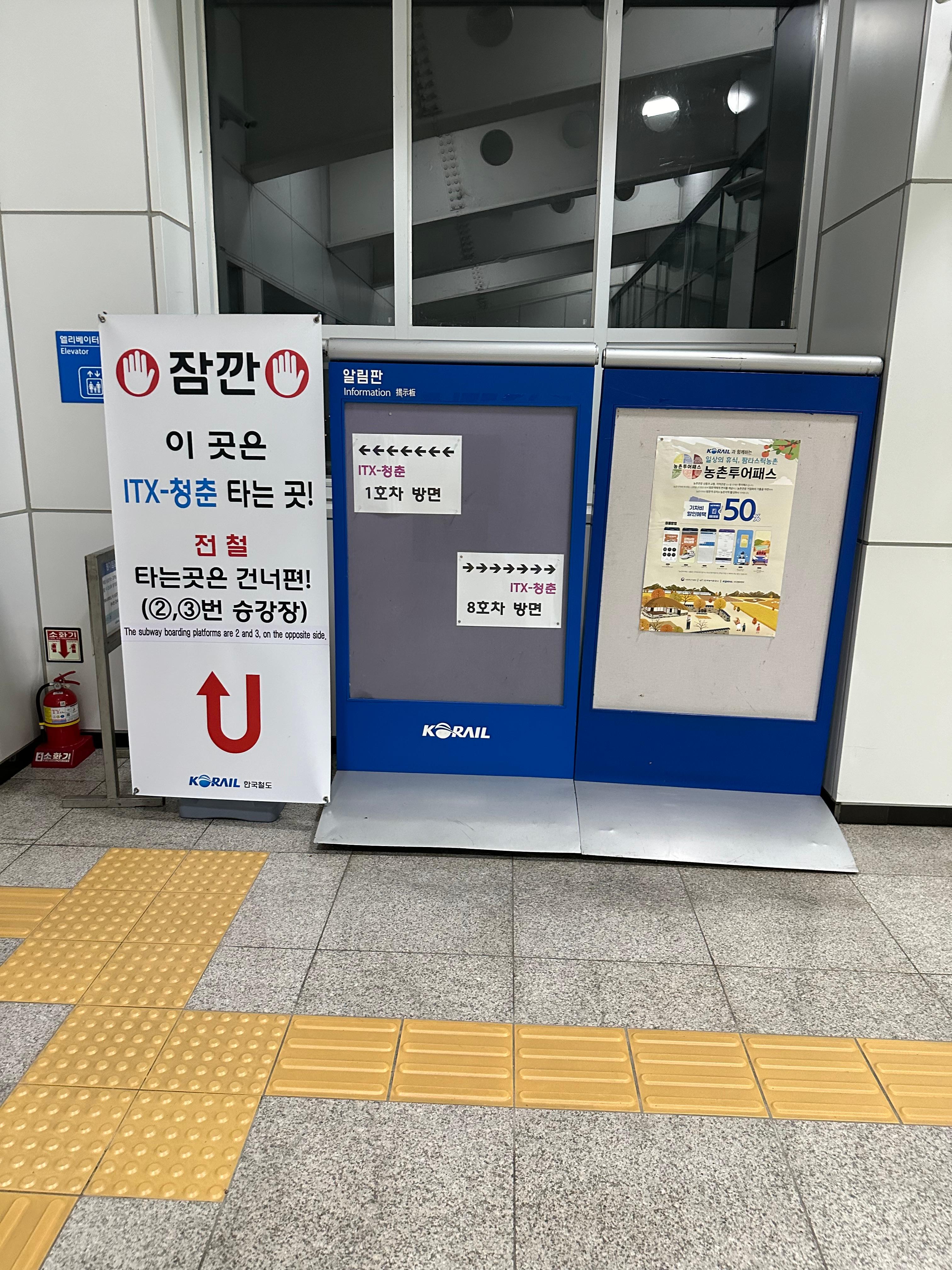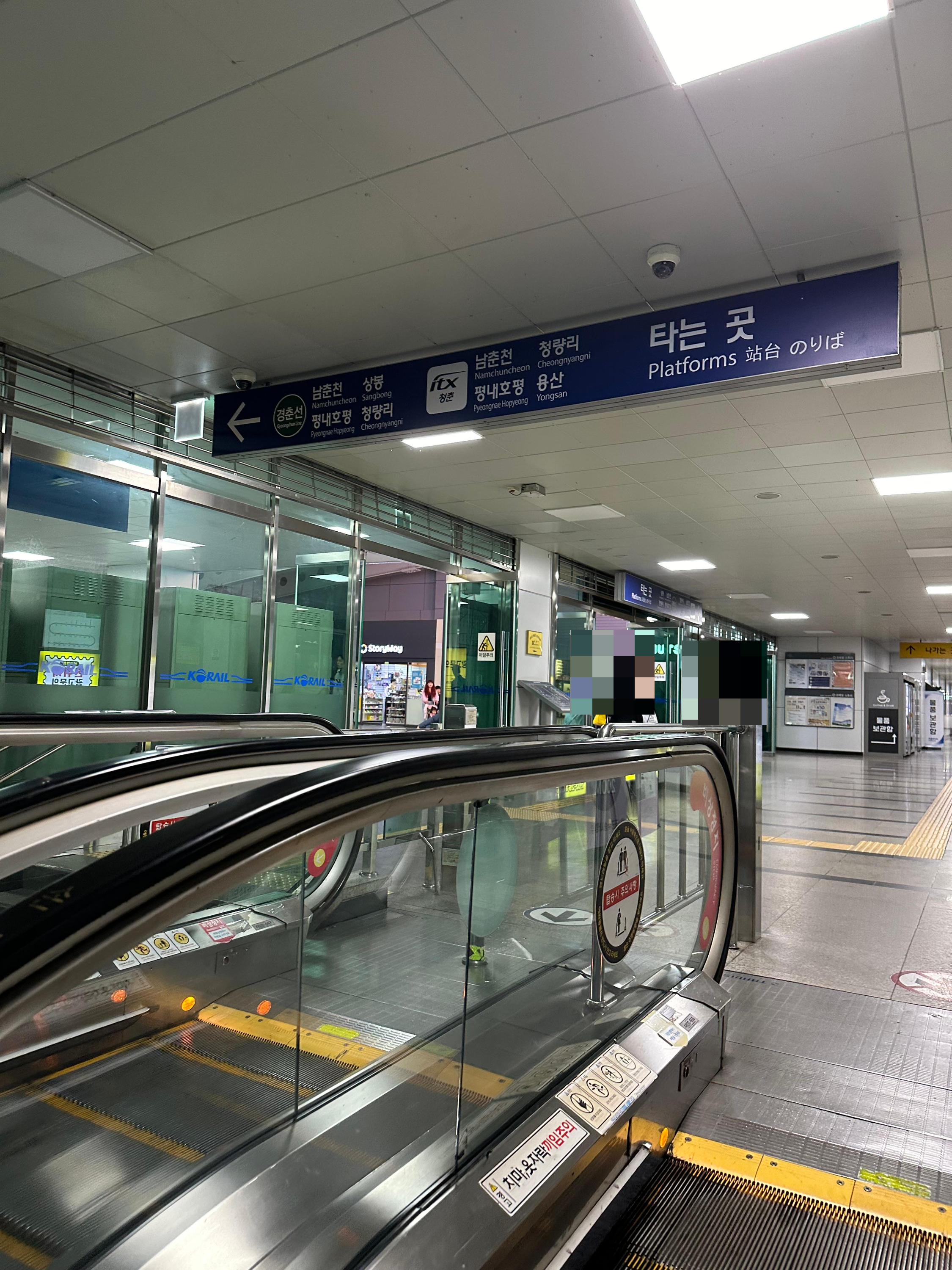 저는 코레일 앱을 통해서 용산으로 가는 ITX 청춘열차 티켓을 예매했기 때문에 대합실에는 있느 승차권 자동발매기를 통해서는 발급하지 않아도 되었습니다. 춘천역 대합실의 경우 건물 3층 높이이며 내부는 그렇게 넓지 않았습니다. 특히 요즘에 지어지는 기차역의 경우 과거에 비해 계단과 에스컬레이터를 통해 갈 수록 지어진 특징을 볼 수 있는데요. 과거에는 계단없이 역으로 들어가서 바로 역 건널목을 통해서 승강장에서 기다릴 수 있었습니다.