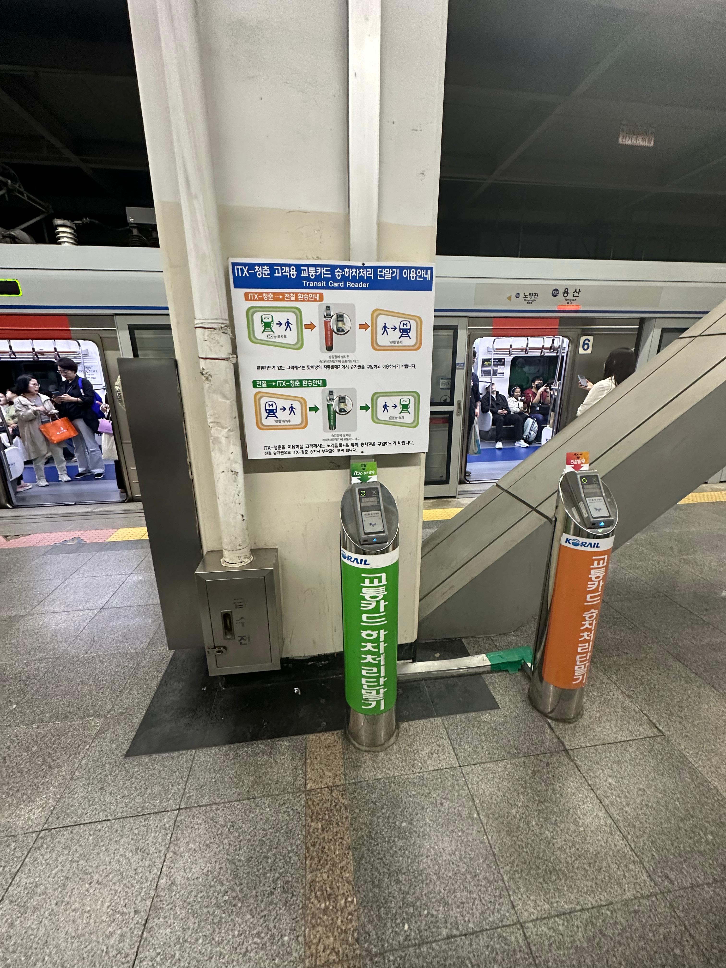 용산역에 도착한 ITX 청춘열차 바로 맞은편에는 인천으로 가느 동인천급행열차 플랫폼이 있는데요. 그래서 ITX 청춘열차 승하차 하는 곳에는 수도권 광역전철로 쉽게 환승할 수 있도록 단말기가 설치되어있습니다. 그래서 ITX 청춘열차 내려서 바로 맞은편에 동인천으로 가는 급행열차를 보다 쉽게 탈 수 있는데요. 굳이 대합실까지 올라가지 않더라도 하차한 플랫폼 주변에 환승단말기가 있으니 인천 가시는분들은 내려서 단말기 찾아서 찍고 바로 타시면 좋을 것 같습니다.