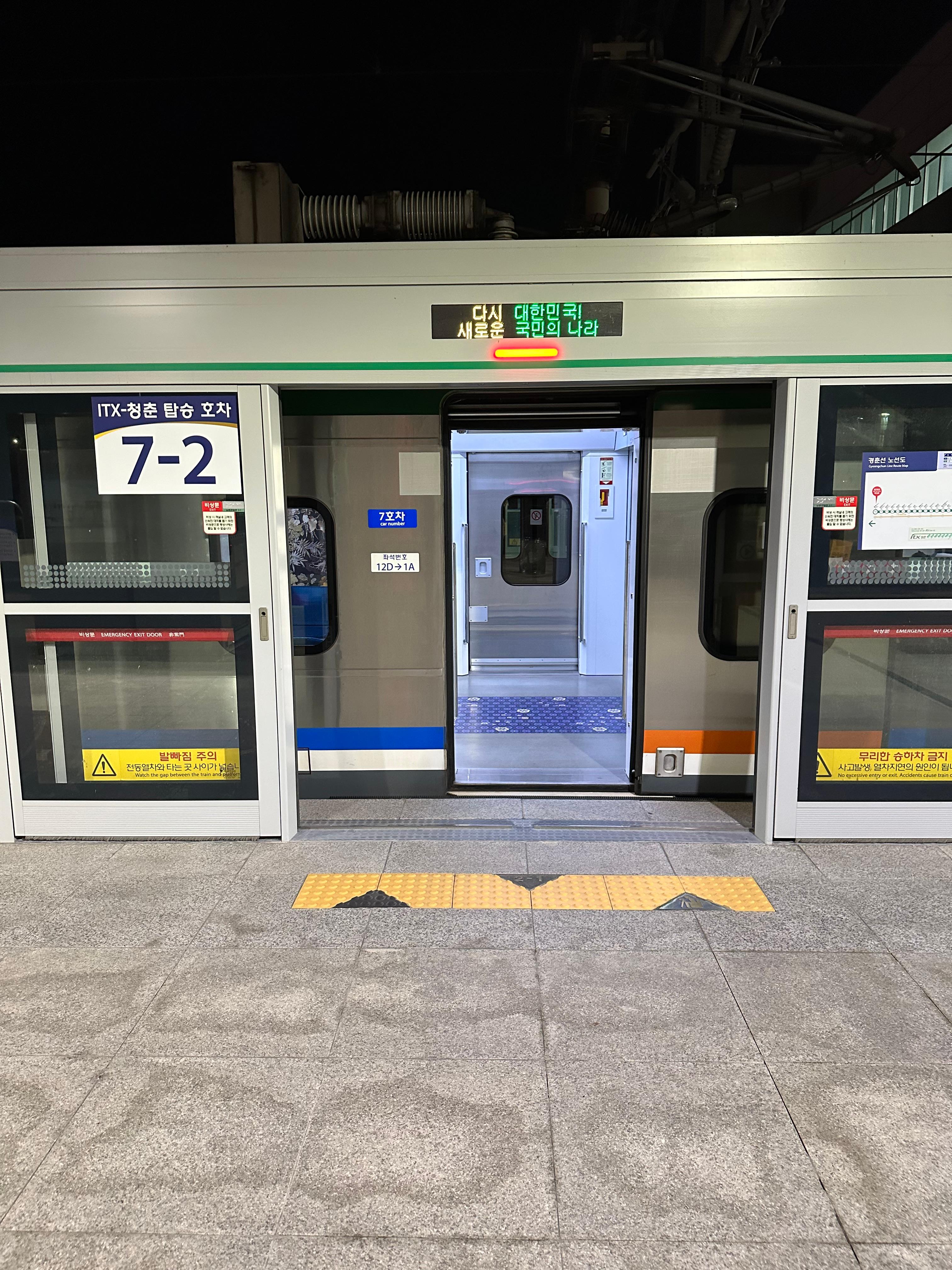 저는 시간 맞춰서 19시 정각이 조금 안되기전에 춘천역 게이트를 통과합니다. 춘천역 뿐만 아니라 최근 지어지는 역사의 경우 특히 중부내륙선과 중앙선의 경우 전 역사가 고상홈 플랫폼에서 탑승할 수 있는 것을 볼 수 있습니다. 그리고 게이트 역시 일반열차도 전철과 같은 게이트를 통과할 수 있는데요. 다만 일반열차의 경우 아직까지는 교통카드 환승이 되지 않아 코레일앱이나 승차권이 QR코드를 게이트 위쪽에 태그를 하면 출입할 수 있습니다. 19시 정각에 출발하는 ITX 청춘열차는 정각에 맞춰서 스크린도어가 열리면서 탑승이 시작 되었습니다.
