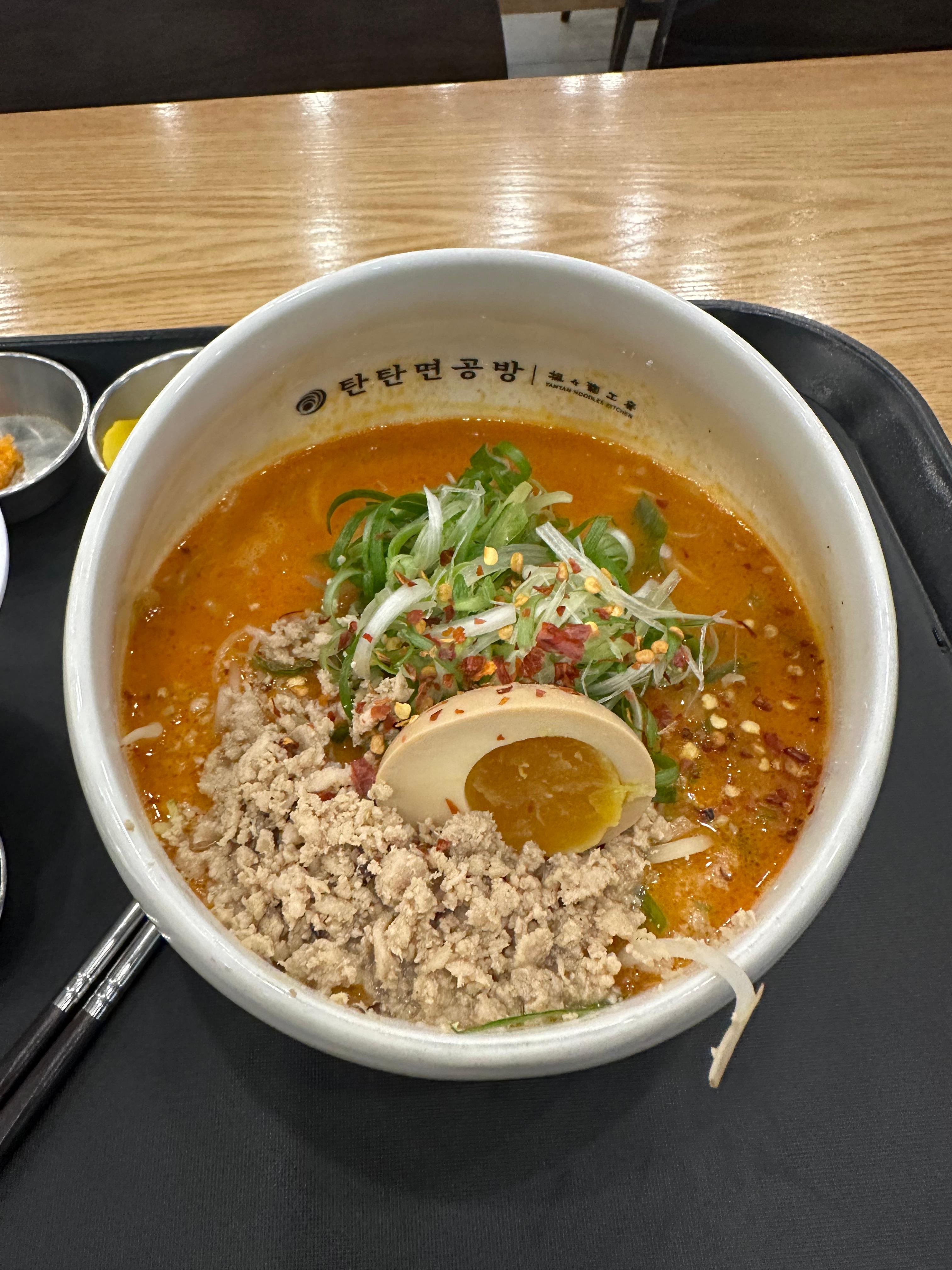 탄탄면 위에는 대파와 계란이 들어가 있고 얼큰했는데요. 음식의 색상은 빨갛게 되어있어서 매워보이지만 돈사골 육수로 달달한 맛을 느낄 수 있었습니다. 특히 탄탄면 라면 그릇은 항아리처럼 생겨서 무겁기는 하더라도 뭔가 면을 더 쉽게 먹을 수 있는 장점을 가지고 있습니다.