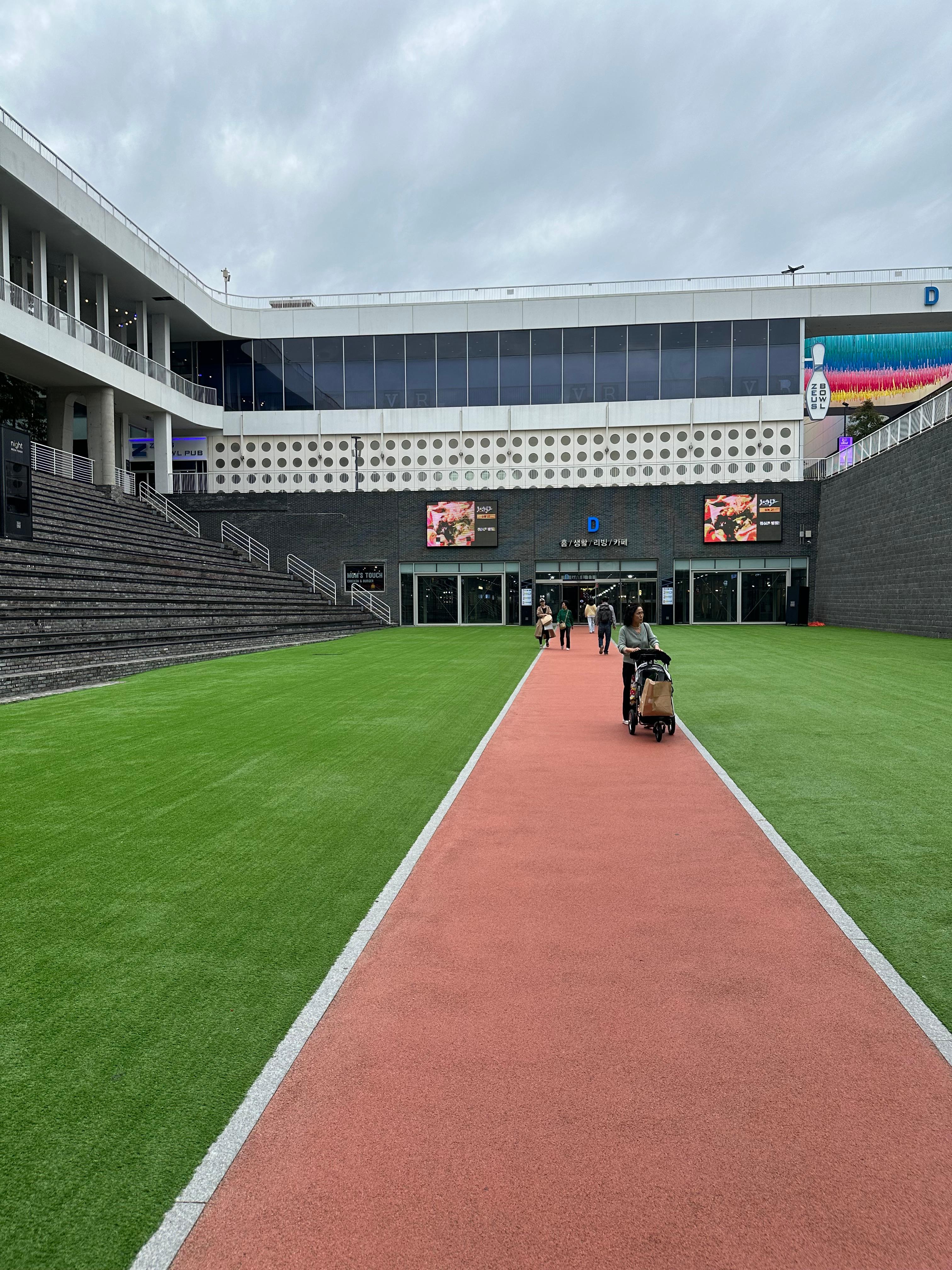 C동에서는 잠시 지하를 빠져나와 너울가지공원이라는 것으로 나오는데요. 넓은 야외 잔디 광장이 나옵니다. 이날은 평일 월요일로 조용했지만요. 특히 주말 낮시간에 오면 이곳 C동과 D동 지하상가를 이어주는 너울가지공원에서는 다양한 축제도 하는 것을 볼 수 있습니다.