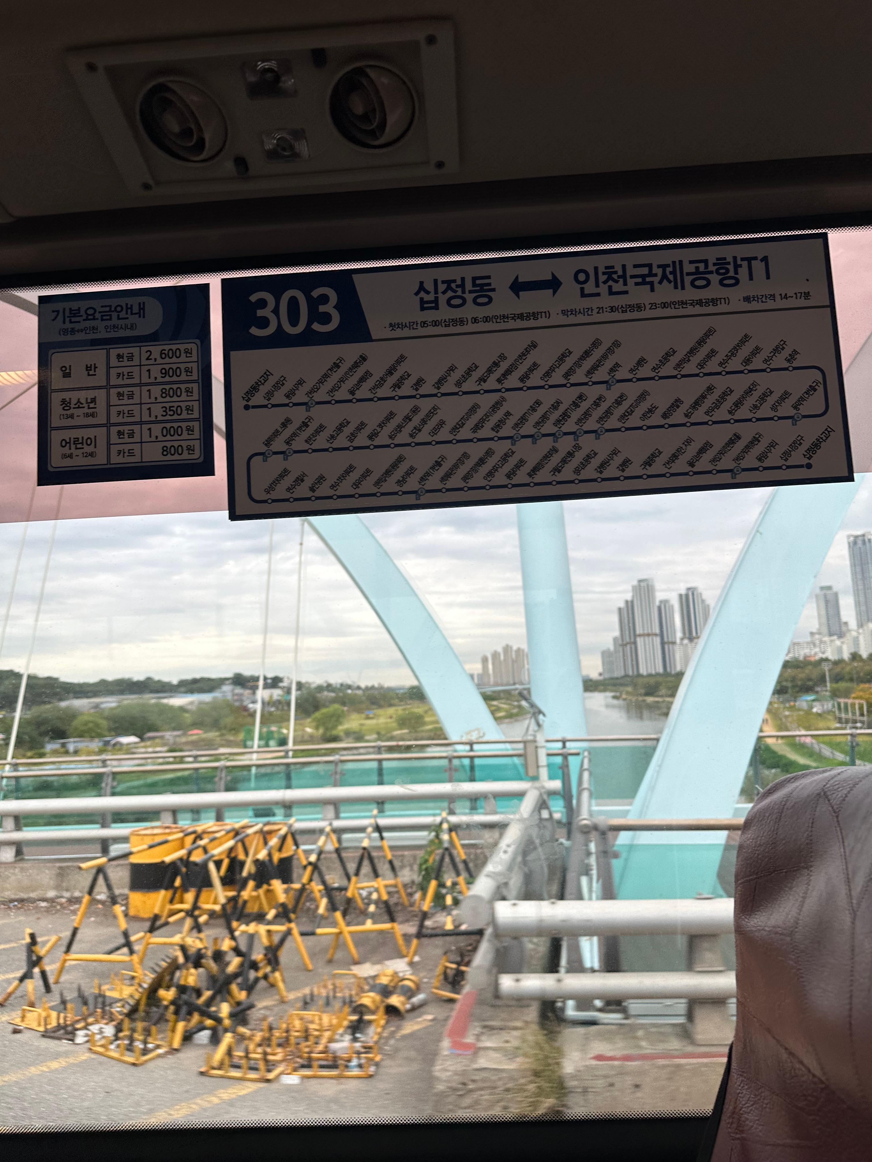 저는 송도이안주상복합 아파트인지 오피스텔인지 모르지만 앞에서 얼마 기다리지 않아 303번 시내버스를 탔습니다. 시내버스 색상이긴 하지만 아무래도 인천대교라는 고속도를 달리기 때문에 좌석버스 시트로 구성되어있었구요. 당연히 좌석에 안전벨트도 있었습니다. 안산과 서울에서는 1500원정도의 버스 요금을 내고 탈 수 있는데요. 303번 역시 시내버스이기는 하지만 인천공항을 가기 때문에 거리비례제와 기본요금이 서울과 수도권에 비하면 조금 더 비싼 것을 볼 수 있습니다. 인천공항을 가기 위해서는 303번 외에도 다양한 노선이 있는데요. 320번, 303-1번, 303번 330번 노선이 있습니다. 해당 노선중에는 제가 다녔던 테크노파크 IT센터와 연세대에서도 오는 노선이 있습니다. 따라서 네이버지도나 카카오맵을 통해 좀더 최적화된 경로로 환승없이 빠르게 올 수 있습니다. 또한 일부 노선은 인천공항2터미널까지 가는 노선도 있습니다. 제가 탔던 303번은 인천국제공항 1터미널까지만 운행했습니다.