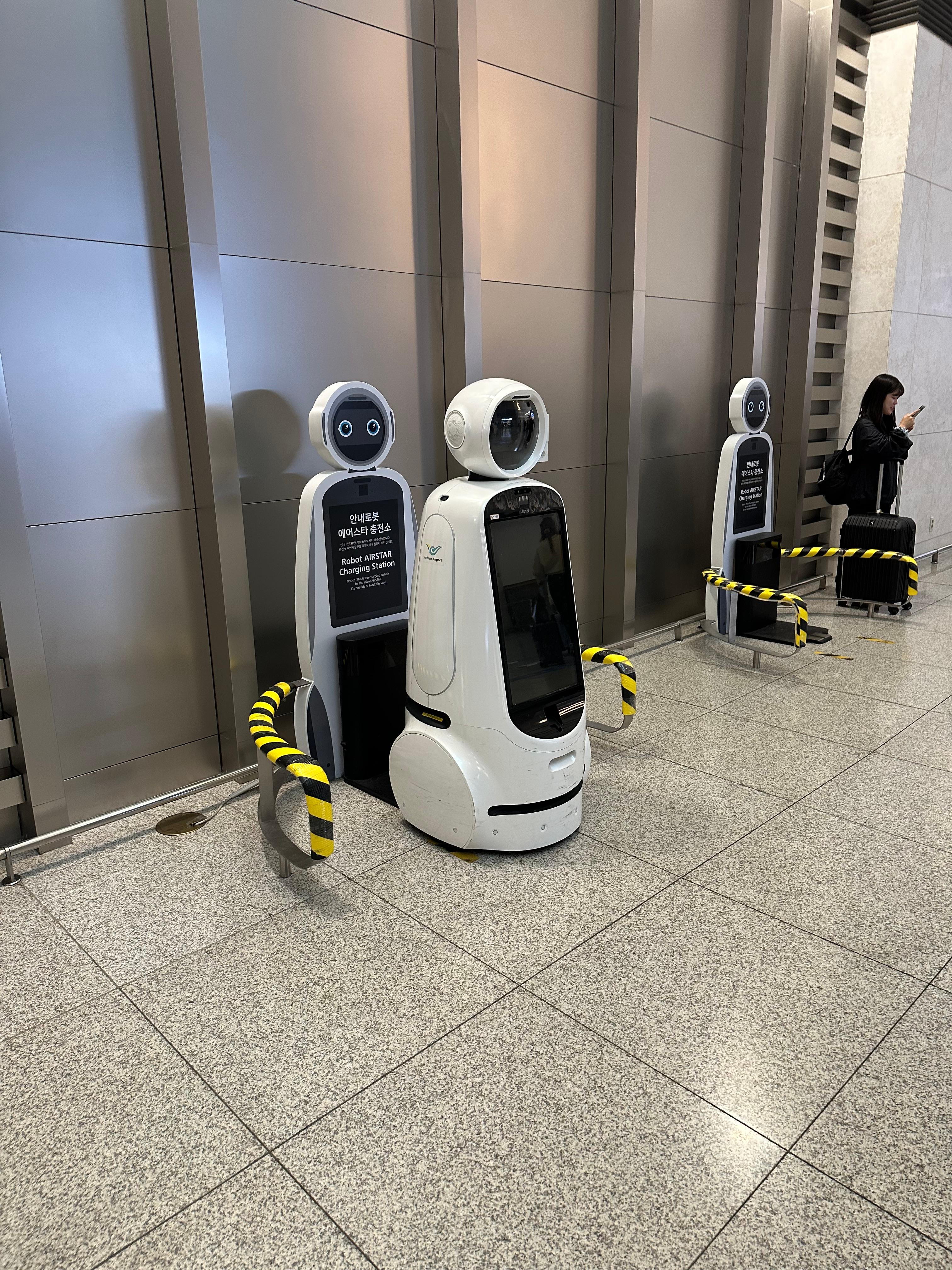 인천국제공항 제1여객터미널만 보더라도 김포공항에 비해 넓은 대기공간과 대합실을 볼 수 있는데요. 특히 국제선 공항이기 때문에 김포공항에 비하면 승객들이 끌고다니는 캐리어도 정말 더 큰것을 볼 수 있는데요. 그래서 짐을 옮길 수 있는 카트도 정말 많이 있고 카트의 크기도 큰 것을볼 수 있습니다. 또한 인천공항에는 이렇게 안내 로봇 에어스타가 사람들을 피해 움직이는 것을 볼 수 있는데요. 돌아다니는 안내 로봇을 터치 할 경우 공항 안내를 받을 수 있스빈다. 무인이기 하지만 충전을 통해 움직이는 것 같습니다. 인천공항 한쪽에 안내로봇 에어스타 충전소가 있었습니다.