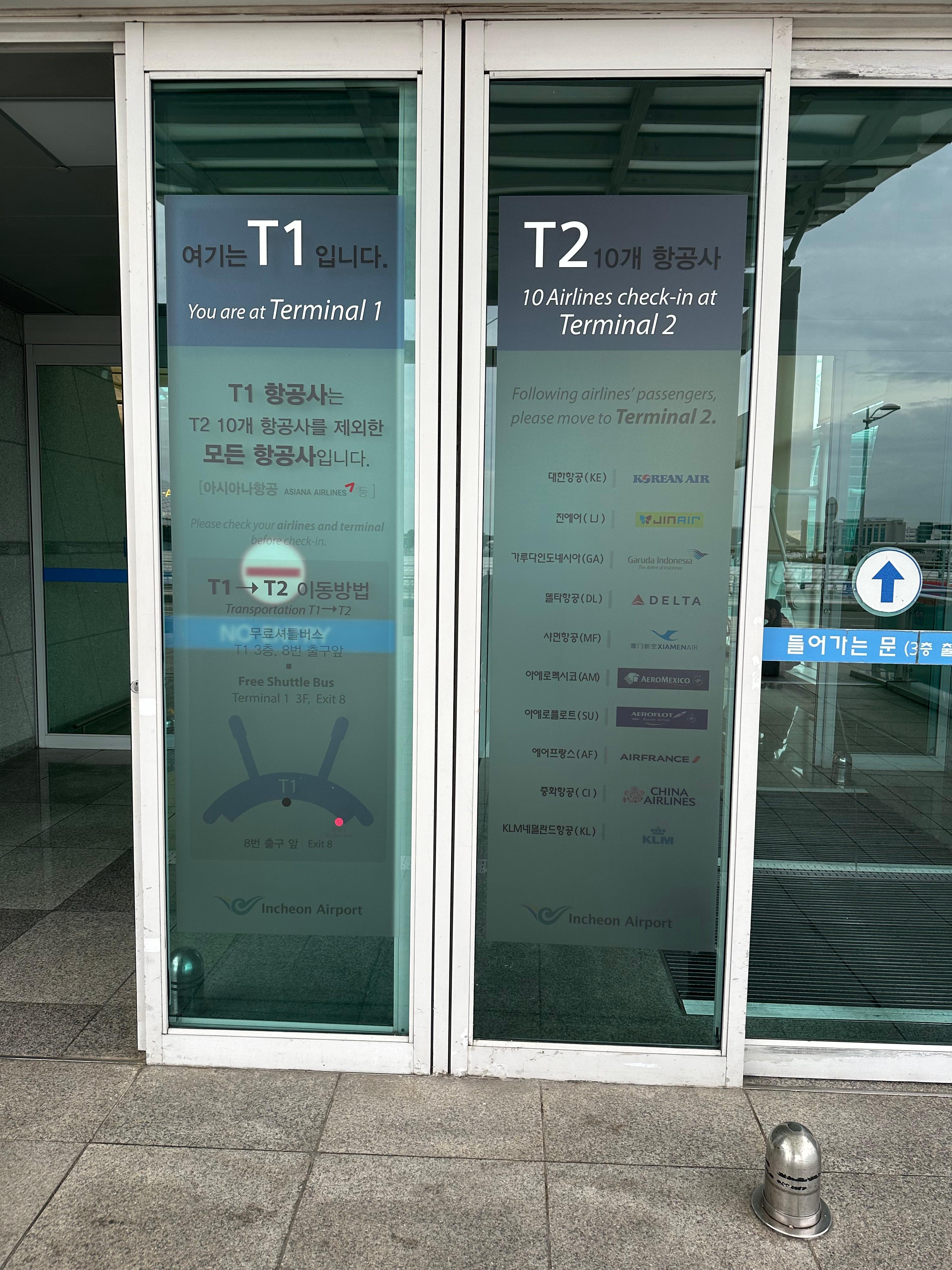 - 인천공항 제1여객터미널(T1)에서는 제2터미널(T2)로 갈 수 있는 무료 셔틀버스가 3층 8번출구 앞에서 이용할 수 있습니다.