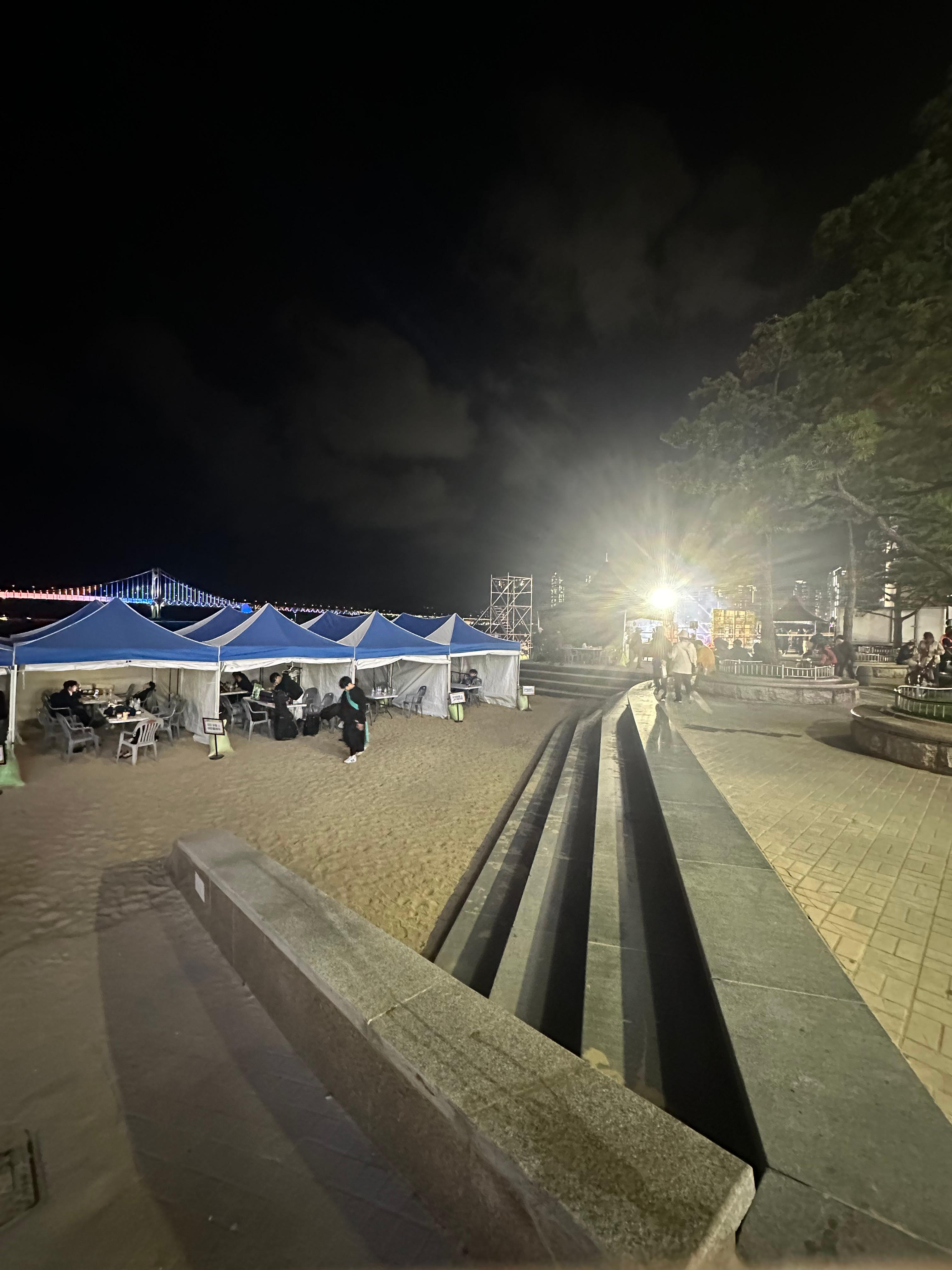 그렇게 아름다운 광안대교 따라 광안리 해수욕장을 걷다보니 멀리서는 광인리 해변공원이 보였습니다. 그리고 광안대교에서의 아름다운 불빛이 지속되는 것을 볼 수 있었습니다.