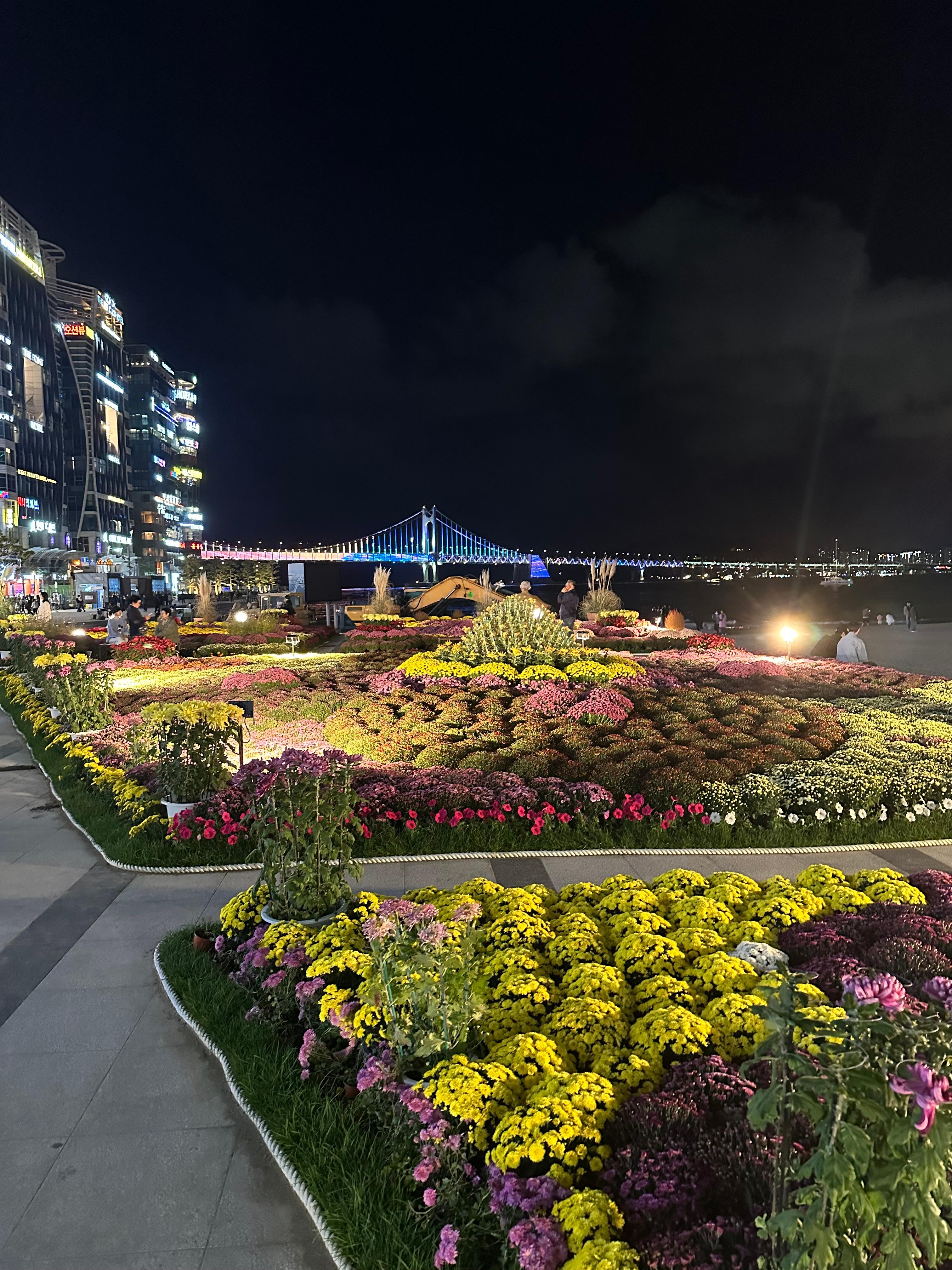 광안리 민락 해변 공원이라고 해서 다양한 꽃들을 볼 수 있었습니다. 주간에 왔다면 낮시간에 보여지는 아름다운 색상의 꽃을 볼 수 있을텐데요. 하지만 야간에는 멀리 보이는 광안대교에 힘입어 야간이 꽃 전시회를 볼 수 있습니다.