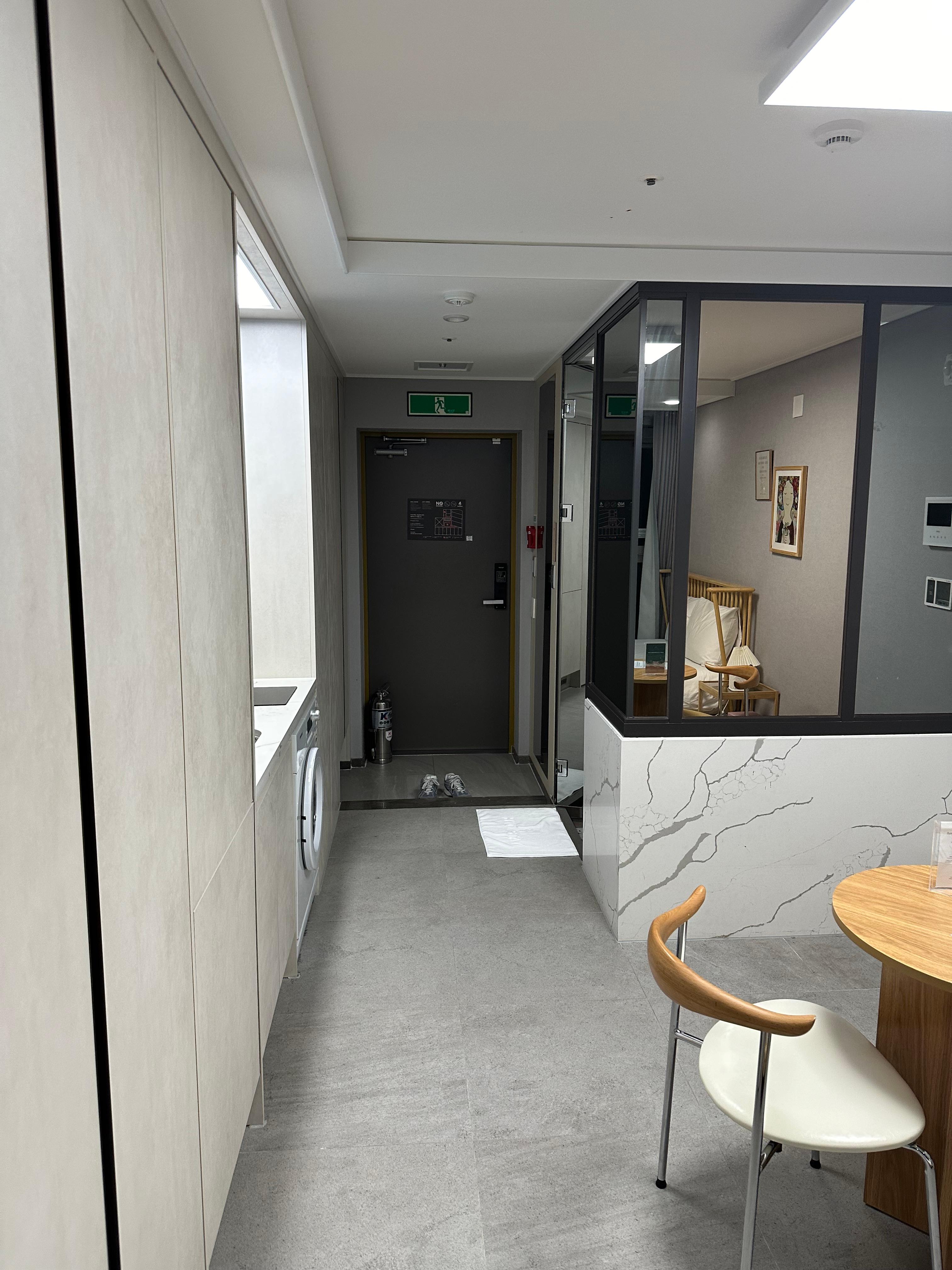 광안리는 주거보다는 관광객이 더 많아서 그런지 효이스테이 더 광안이 있는 지웰에스테이트 더 테라스 마지막층인 20층에는 별도의 프론트가 있어서 직접 체크인을 할 수 있었습니다. 그동안 에어비앤비 이용할 때는 에어비앤비 앱에서 채팅을 통해 호실 정보를 안내 받고 바로 들어갔는데요. 이번 효이스테이 에어비앤비의 경우 호텔처럼 직원 대면을 통해 객실안내를 받고 들어갔습니다.