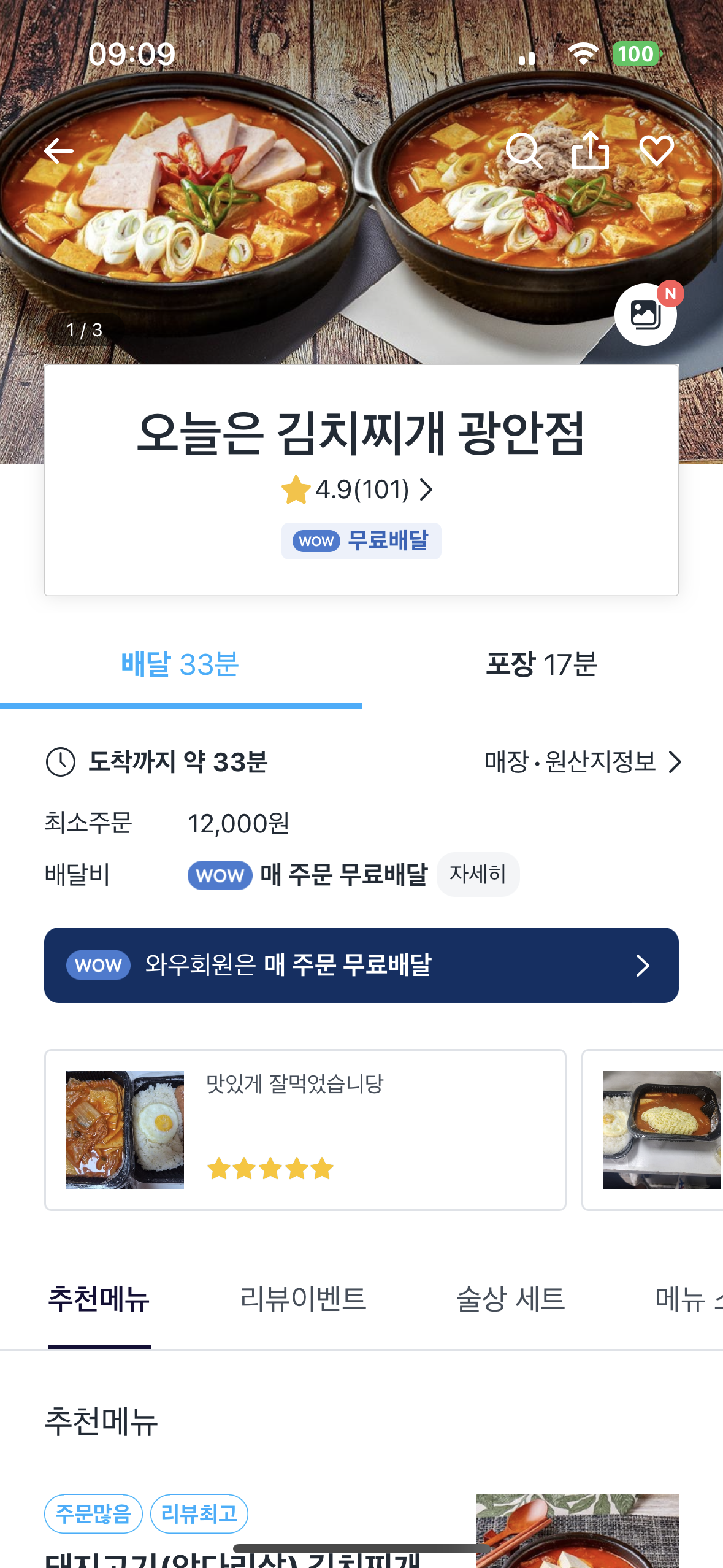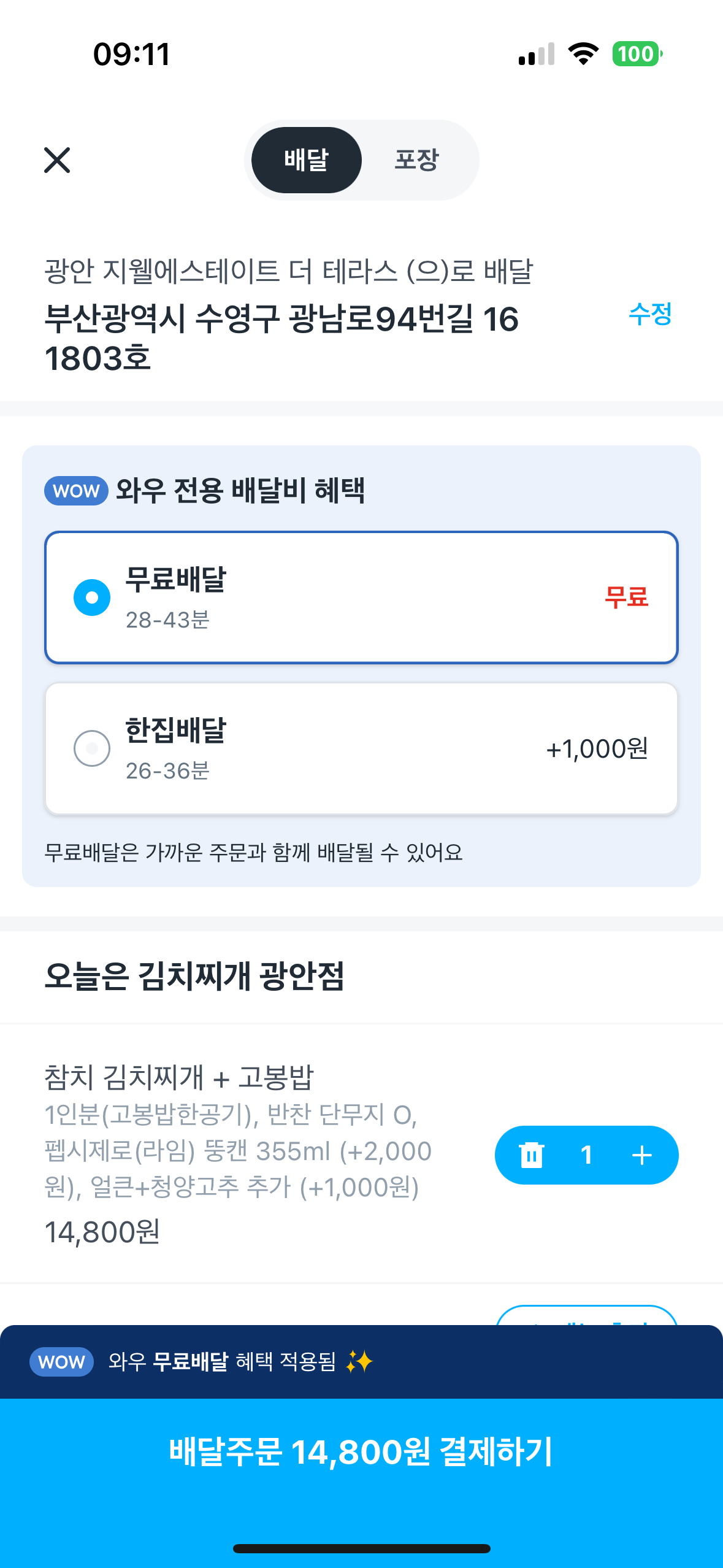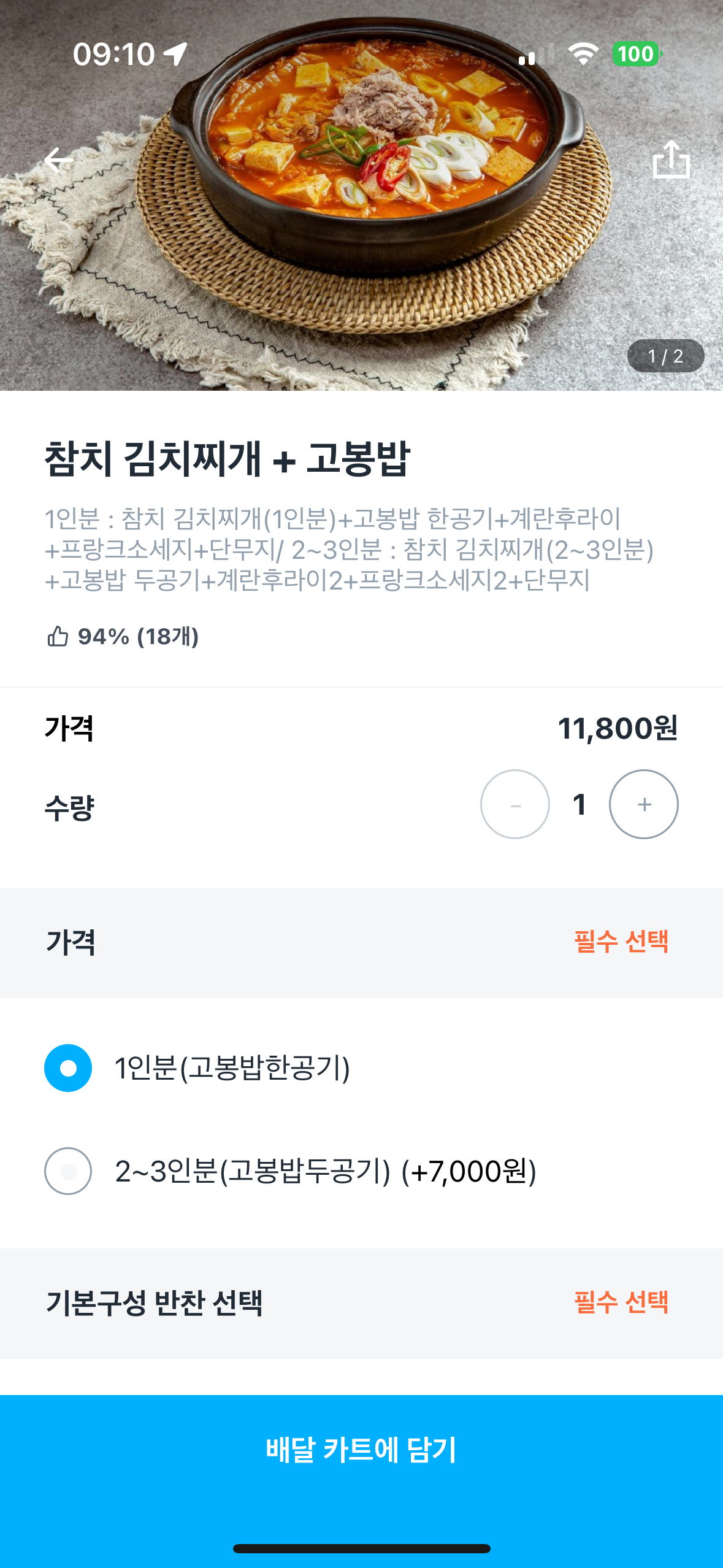 쿠팡이츠도 아직은 배민에 비해 후기수나 이용자가 많지는 않지만 숙소안에 키오스크에 비하면 좀 더 객관적으로 이용할 수 있는것 같습니다. 숙소와 가까운 오늘은 김치찌개 광안점에서 참치김치찌개에 공기밥이 나오는 가성비 메뉴를 선택후 주문을 했습니다.