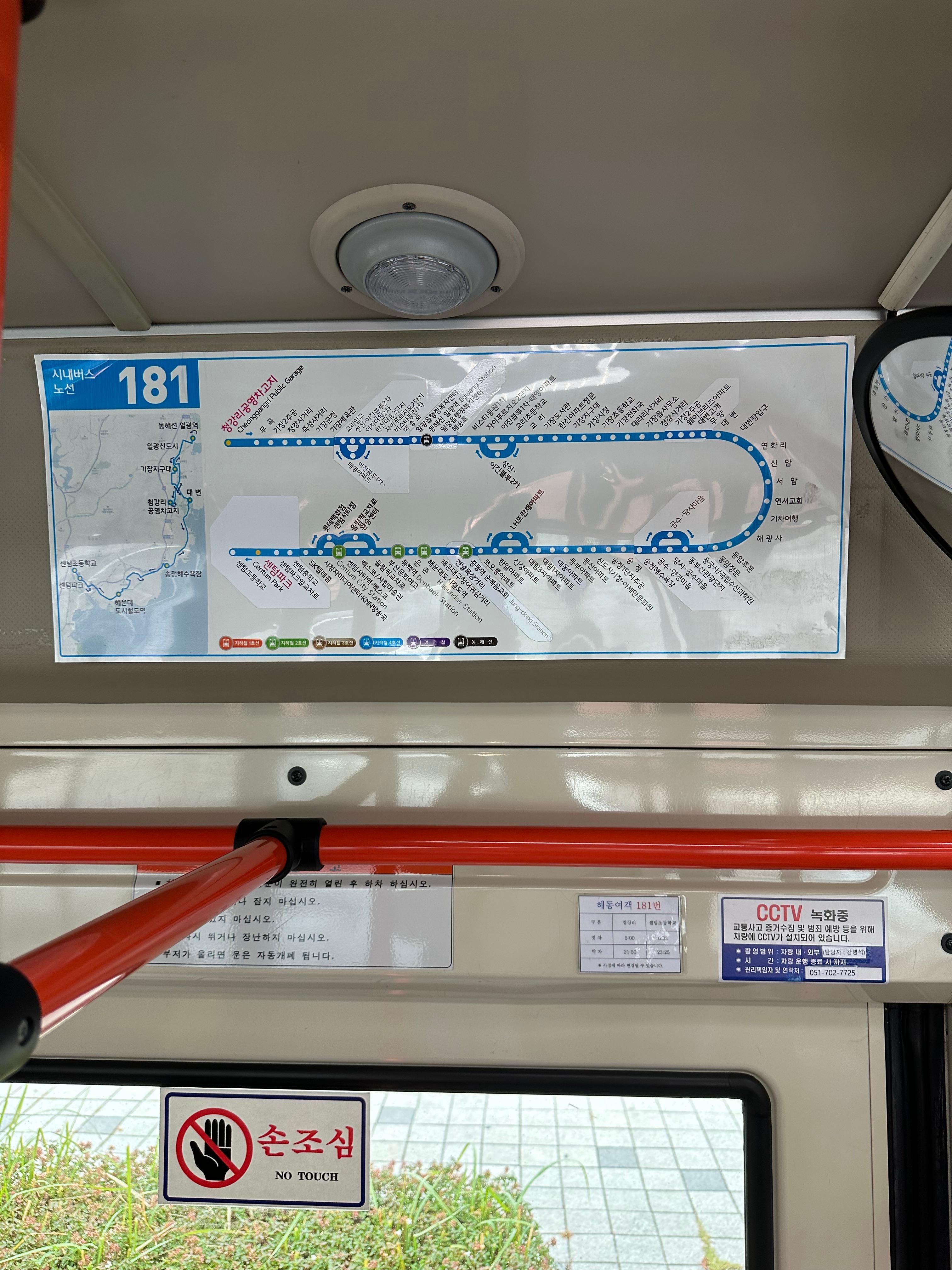 181번 노선은 부산 센텀시티를 출발해서 부산 동부권의 종점인 기장까지 가는 노선인데요. 저는 181번 노선을 타고 30분 정도 소요되어 해동용궁사가 있는 국립수산원 정류장에서 하차했습니다. 안내방송에서는 국립수산원, 해동용궁사 모두 나오고 있습니다.