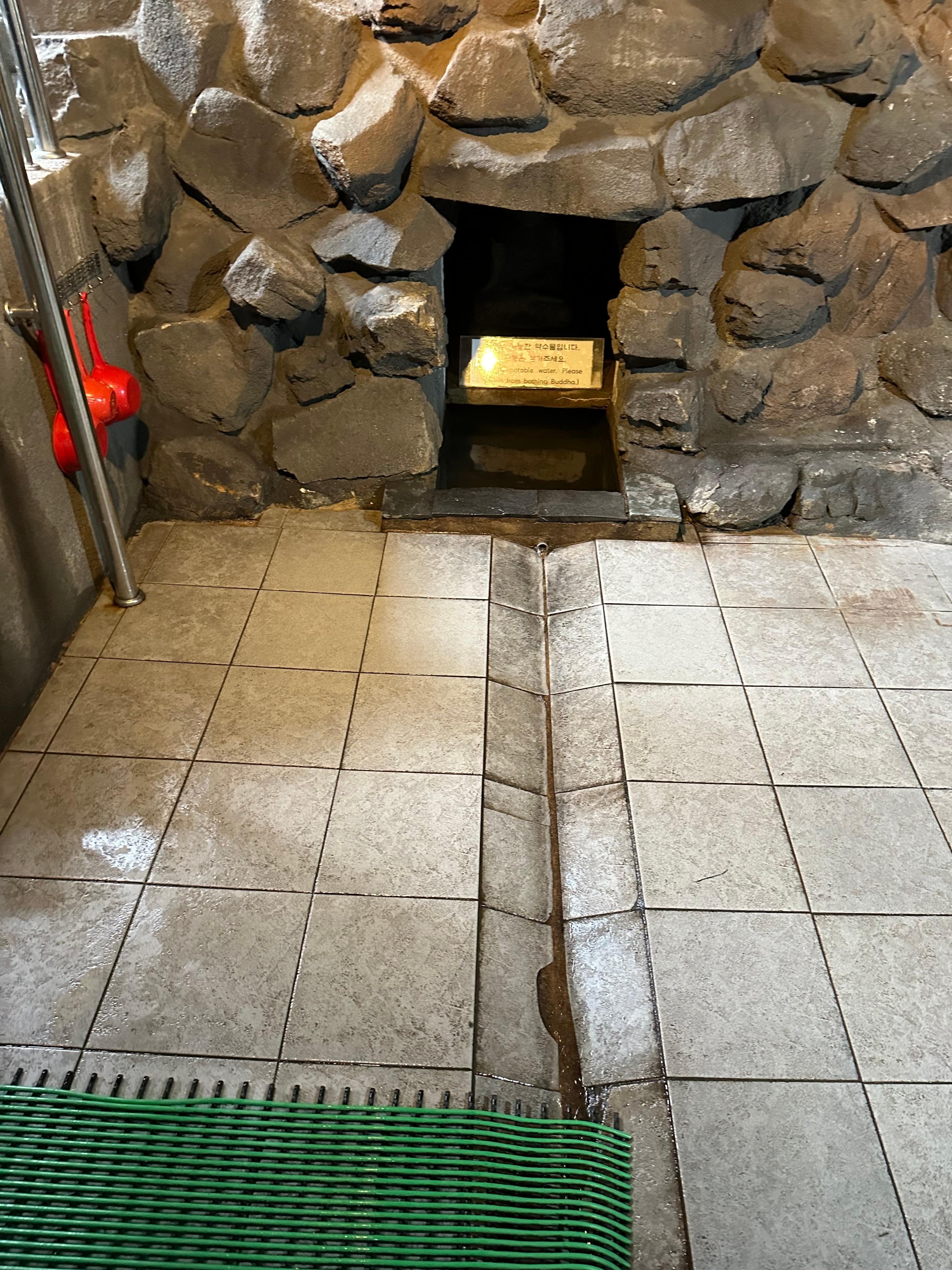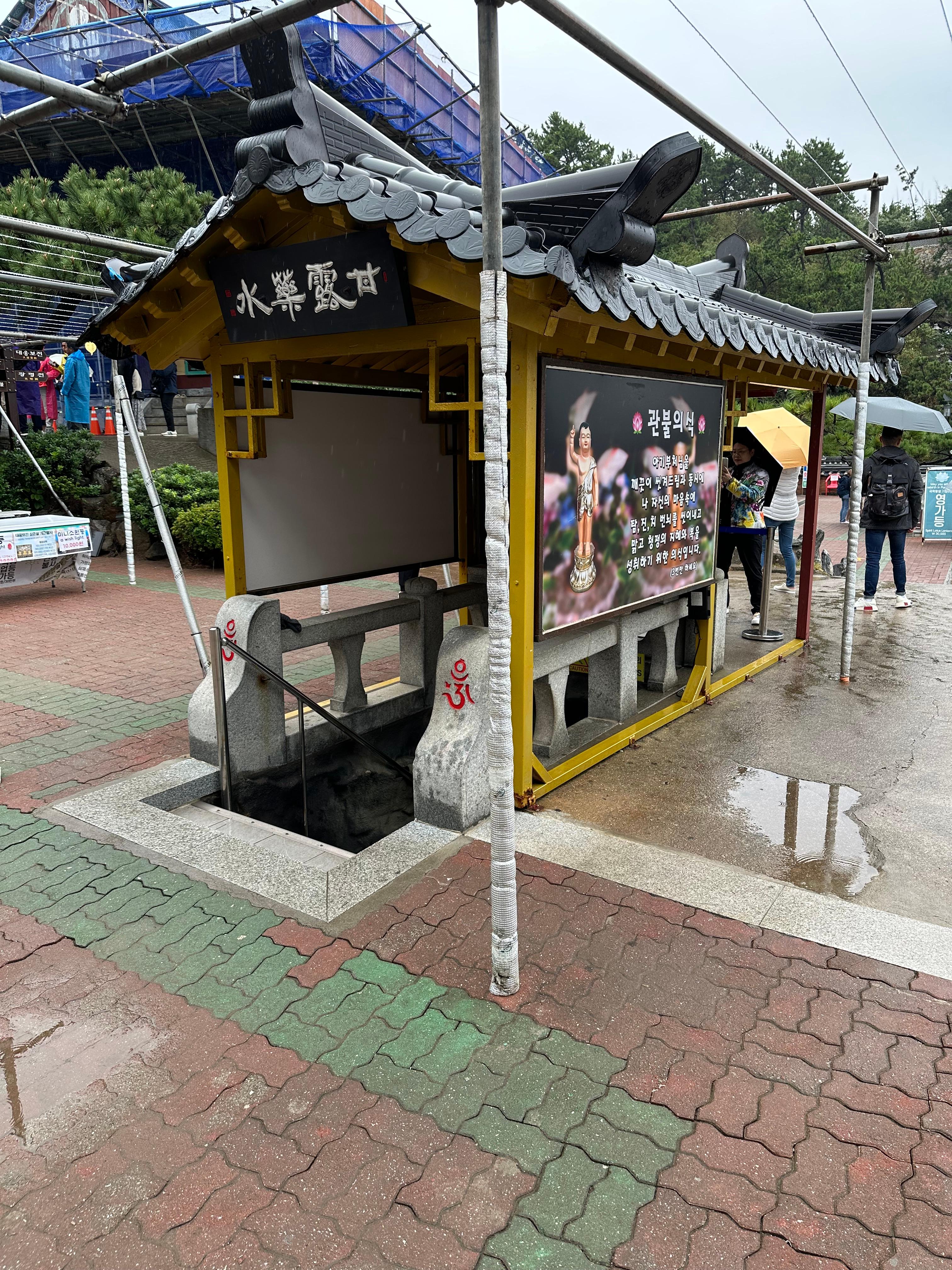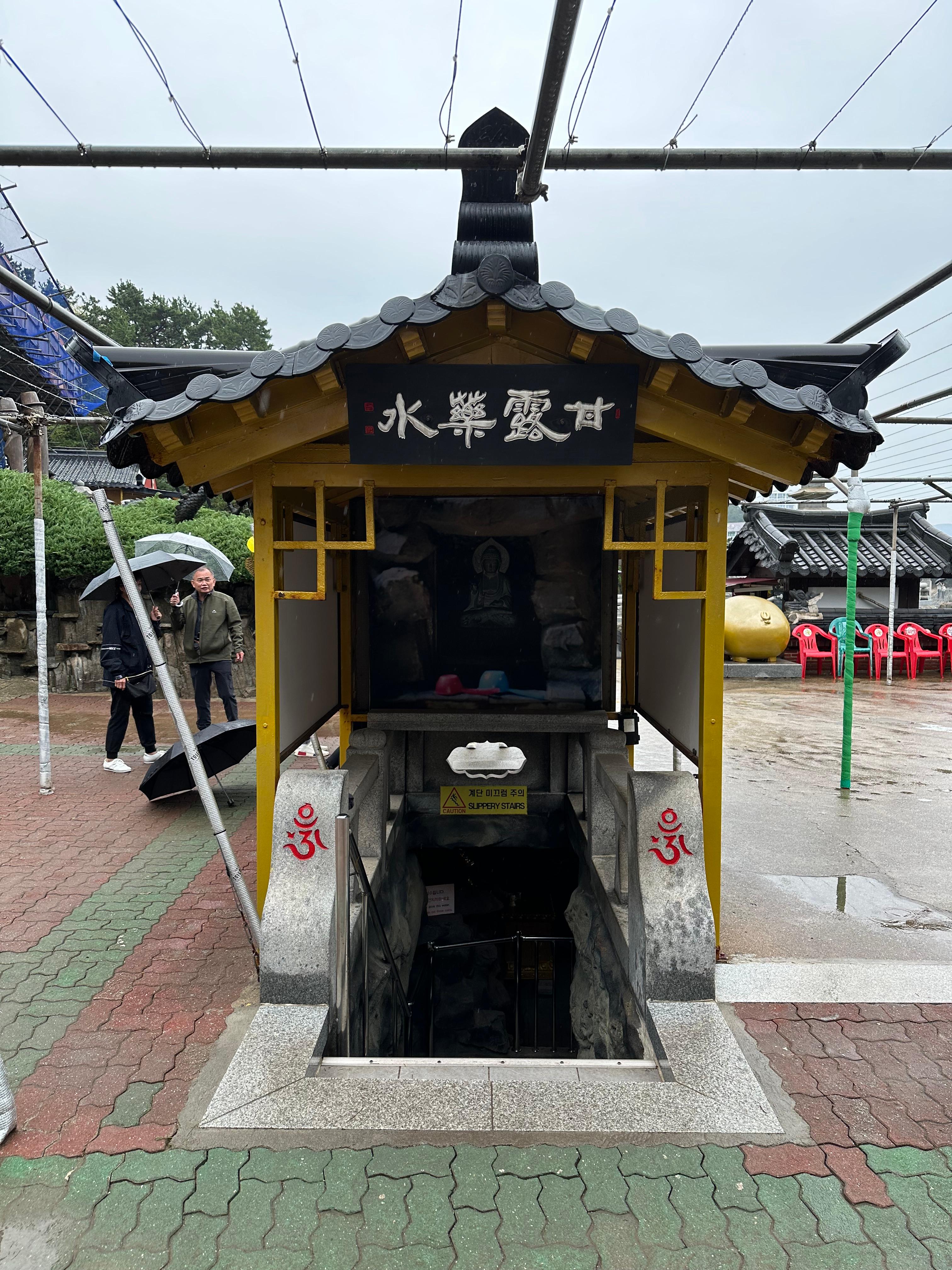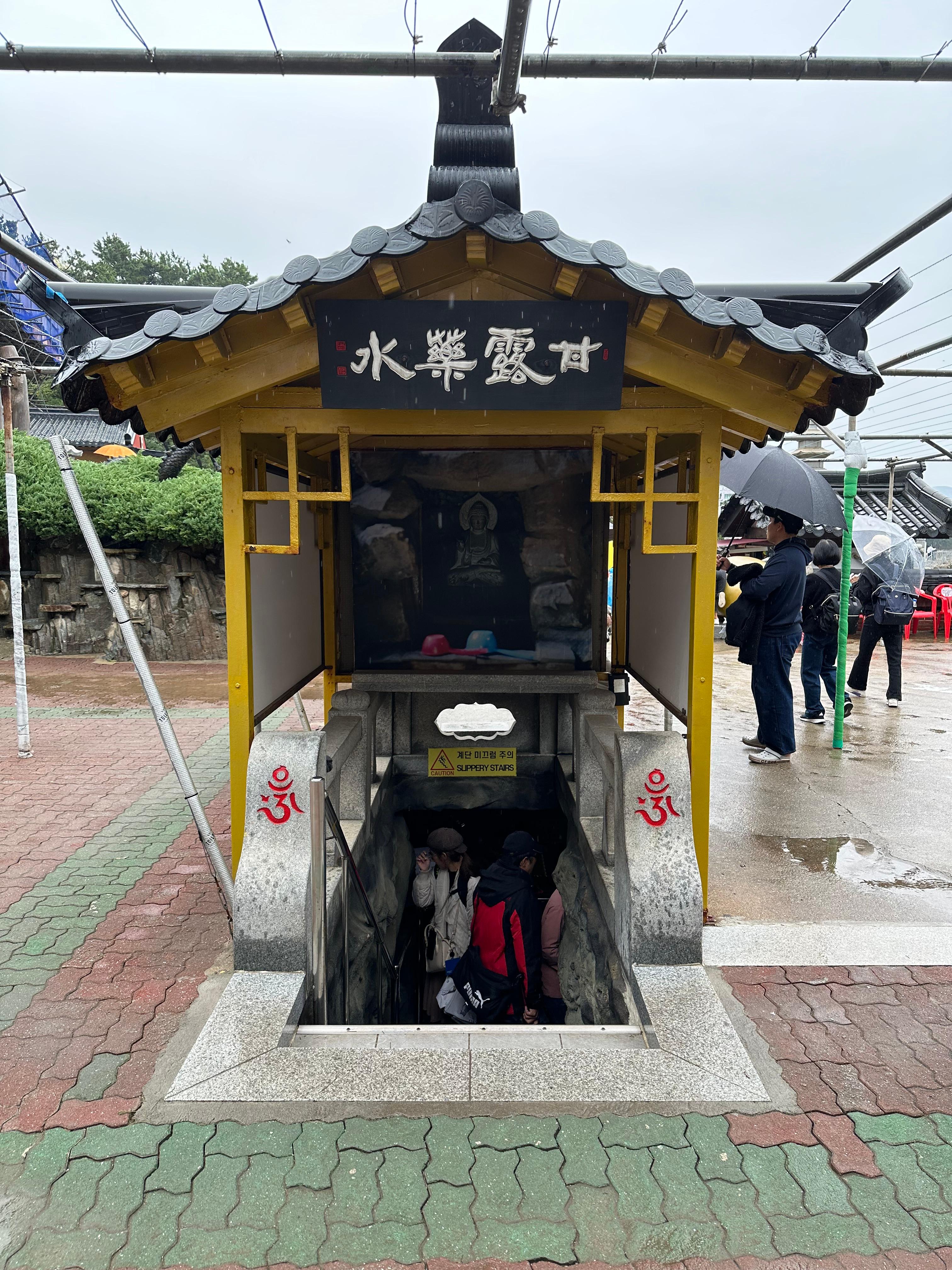작은 기와집 하나만 있고 들어가는 입구는 잘 보이지 않았습니다. 해수관음대불 올라가고 내려가는 계단 보다 더 좁았습니다. 그래서 이미 올라오거나 내려가는 사람이 있으면 조금 기다렸다가 이용해야 했습니다. 안에 들어가면 바가지를 이용해서 지하 식수 약수를 마실 수 있었습니다.
