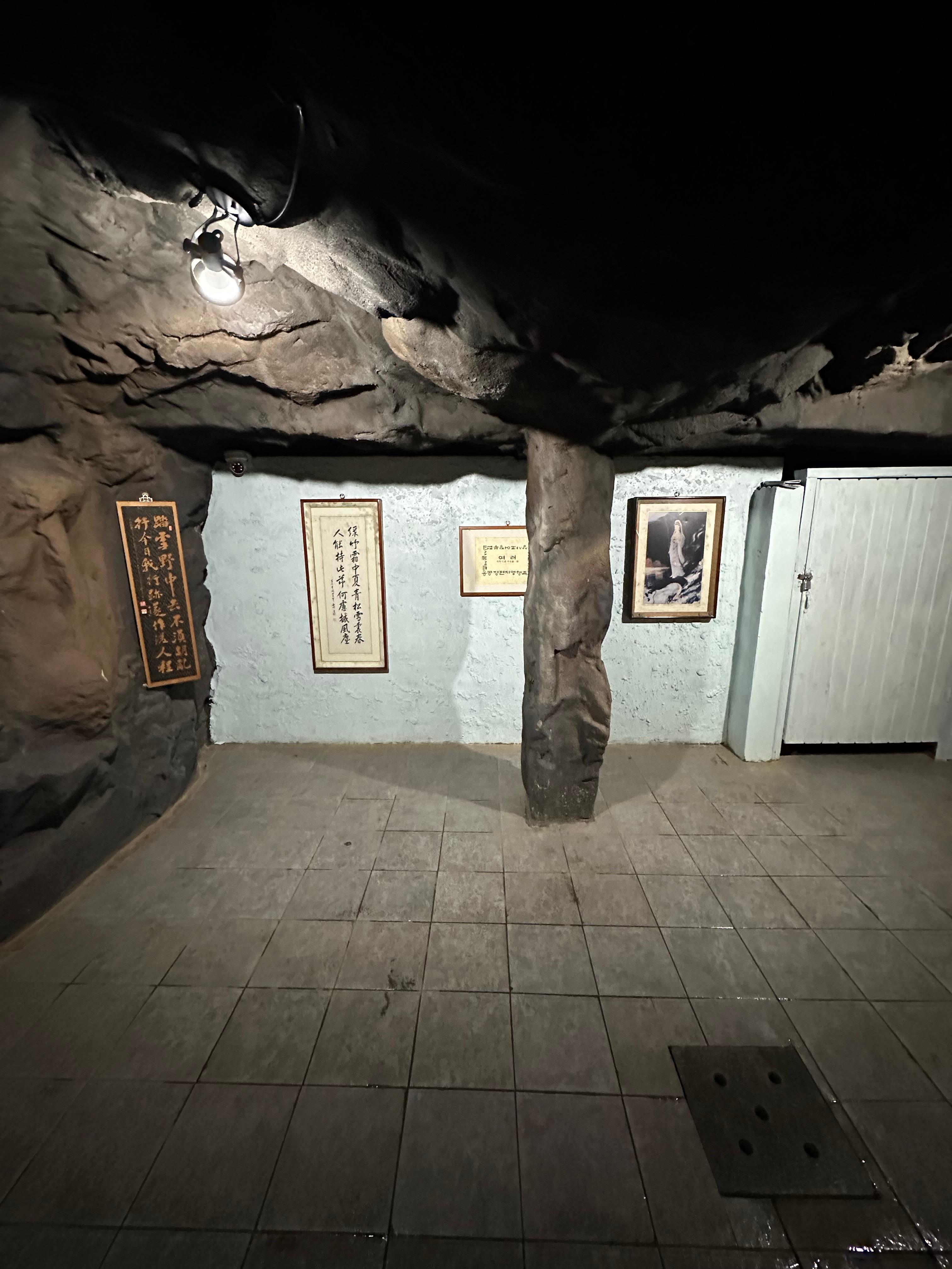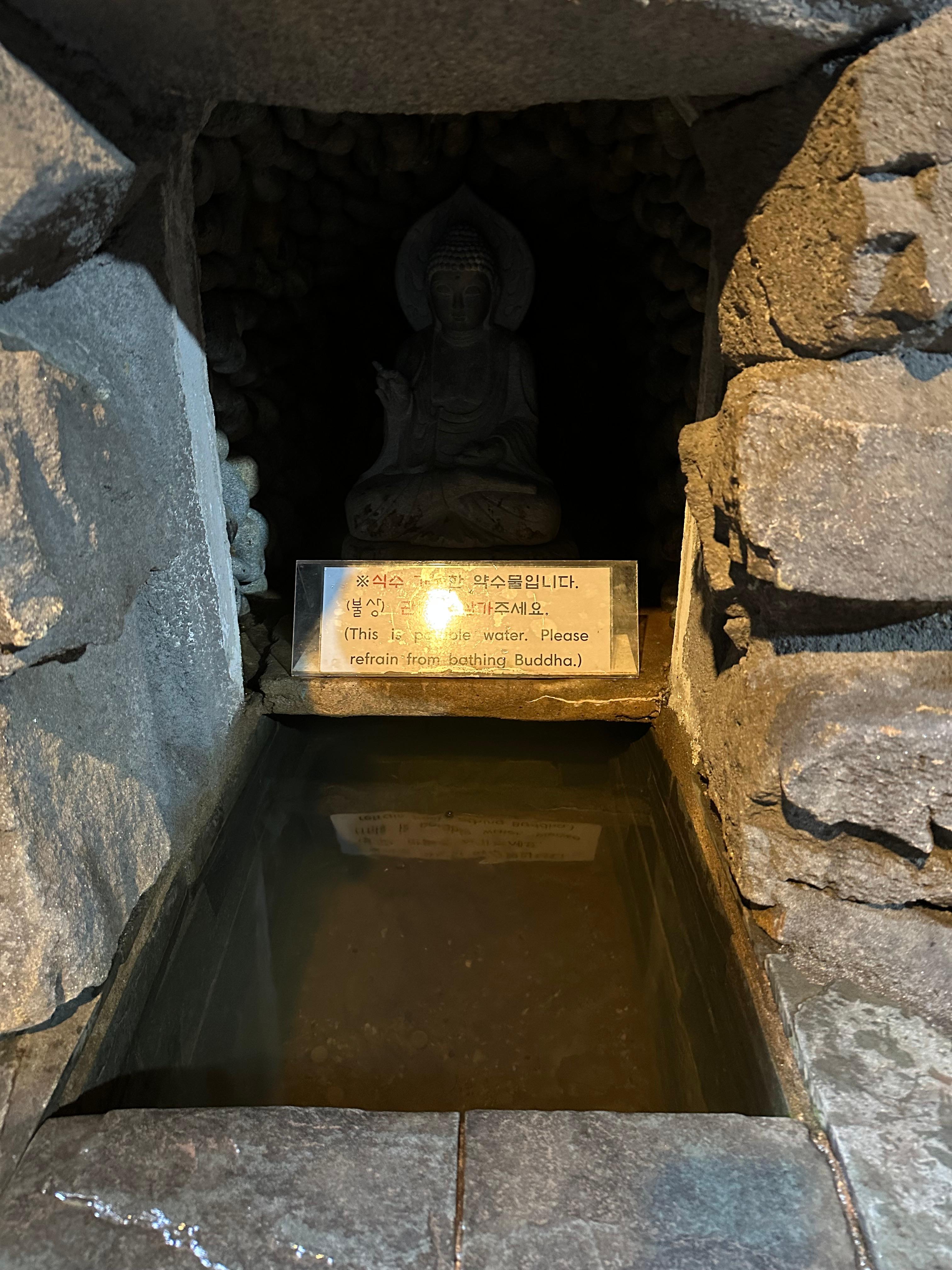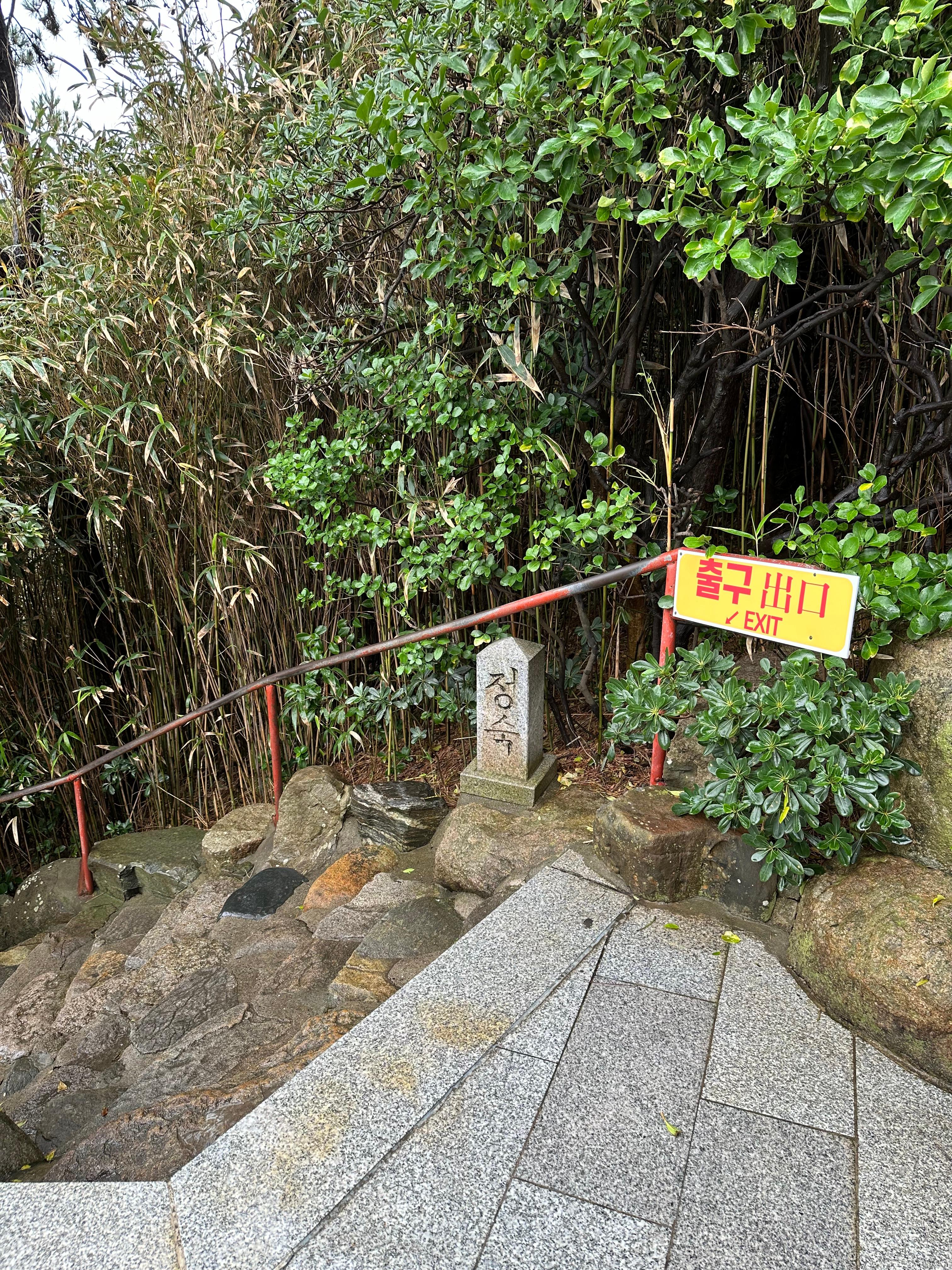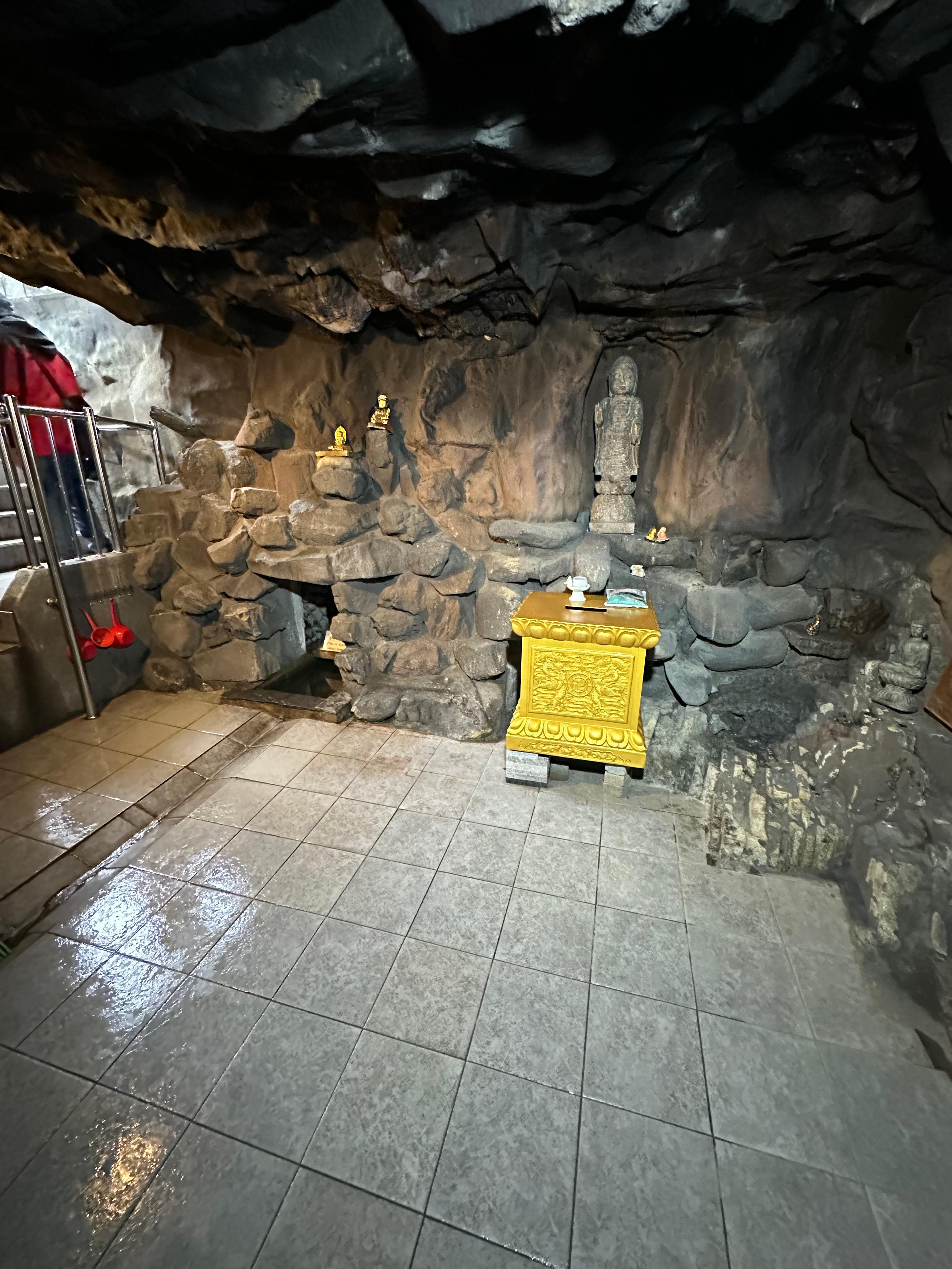 작은 기와집 하나만 있고 들어가는 입구는 잘 보이지 않았습니다. 해수관음대불 올라가고 내려가는 계단 보다 더 좁았습니다. 그래서 이미 올라오거나 내려가는 사람이 있으면 조금 기다렸다가 이용해야 했습니다. 안에 들어가면 바가지를 이용해서 지하 식수 약수를 마실 수 있었습니다.