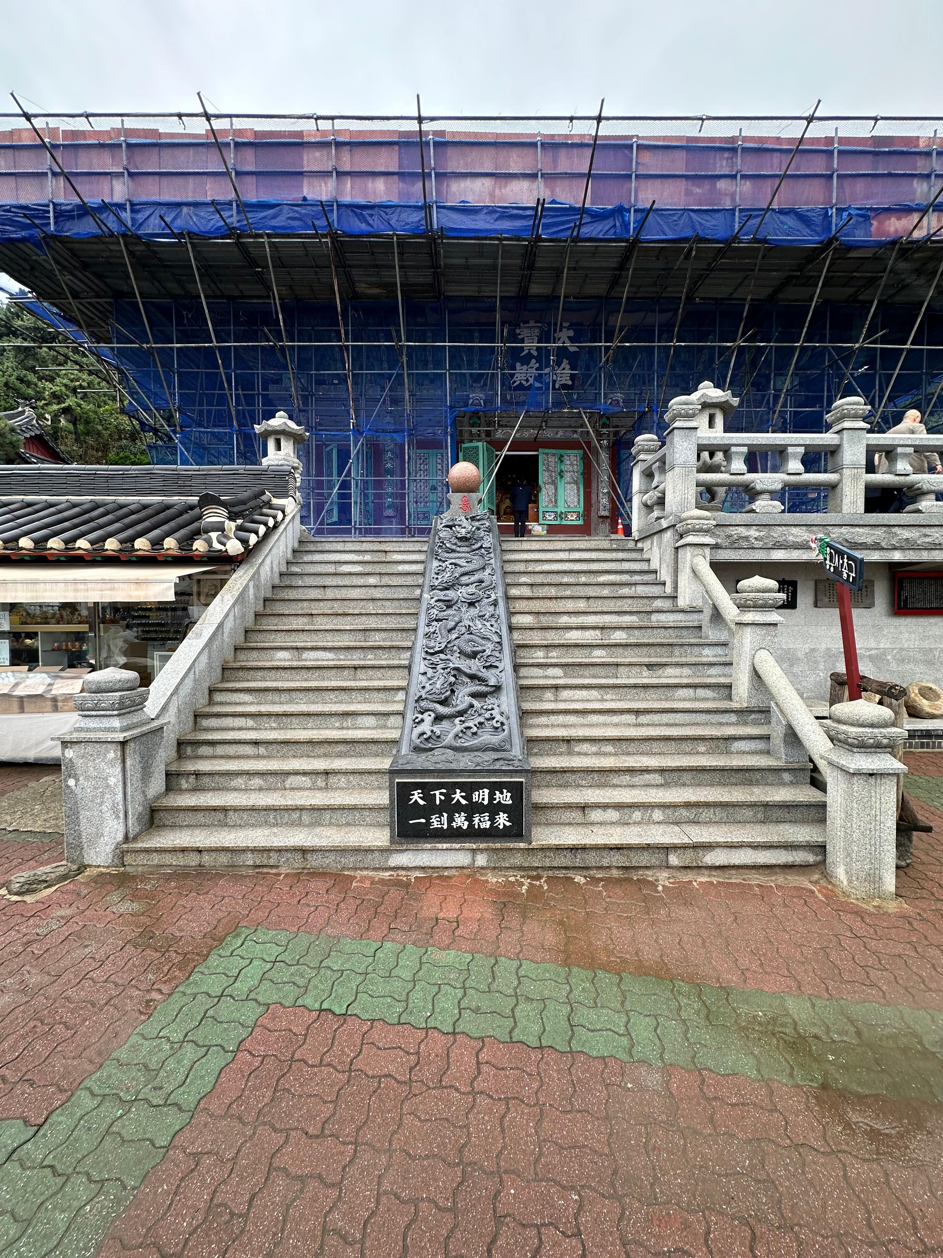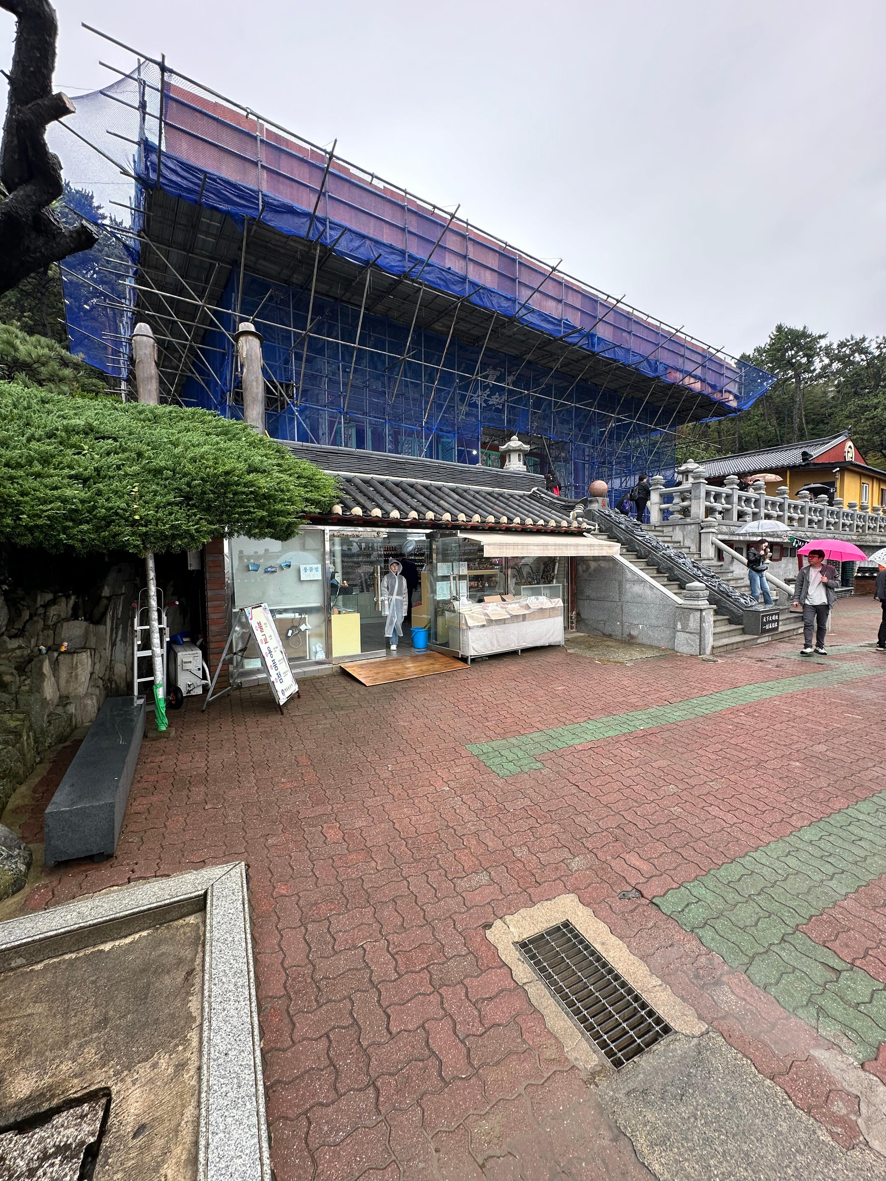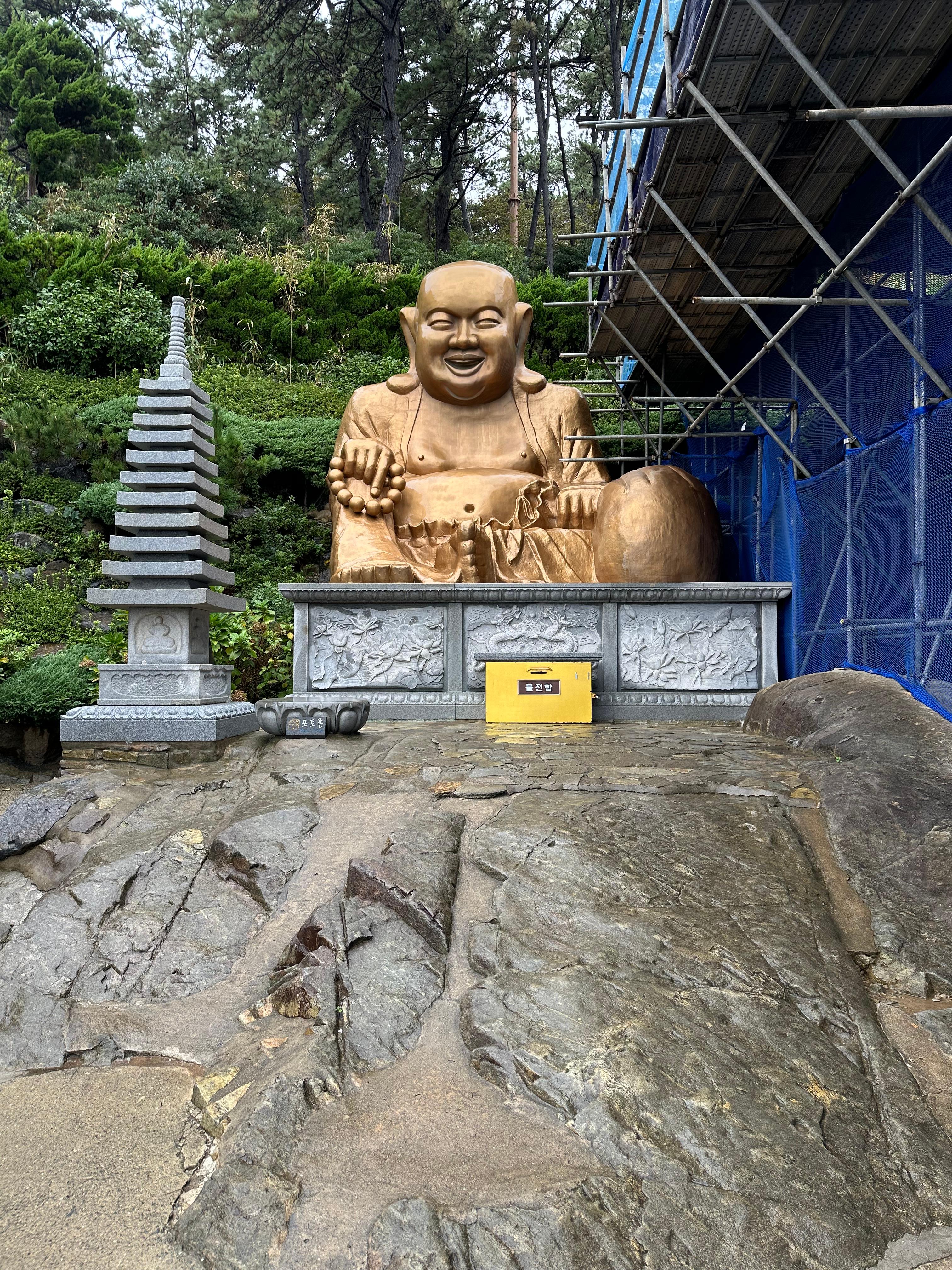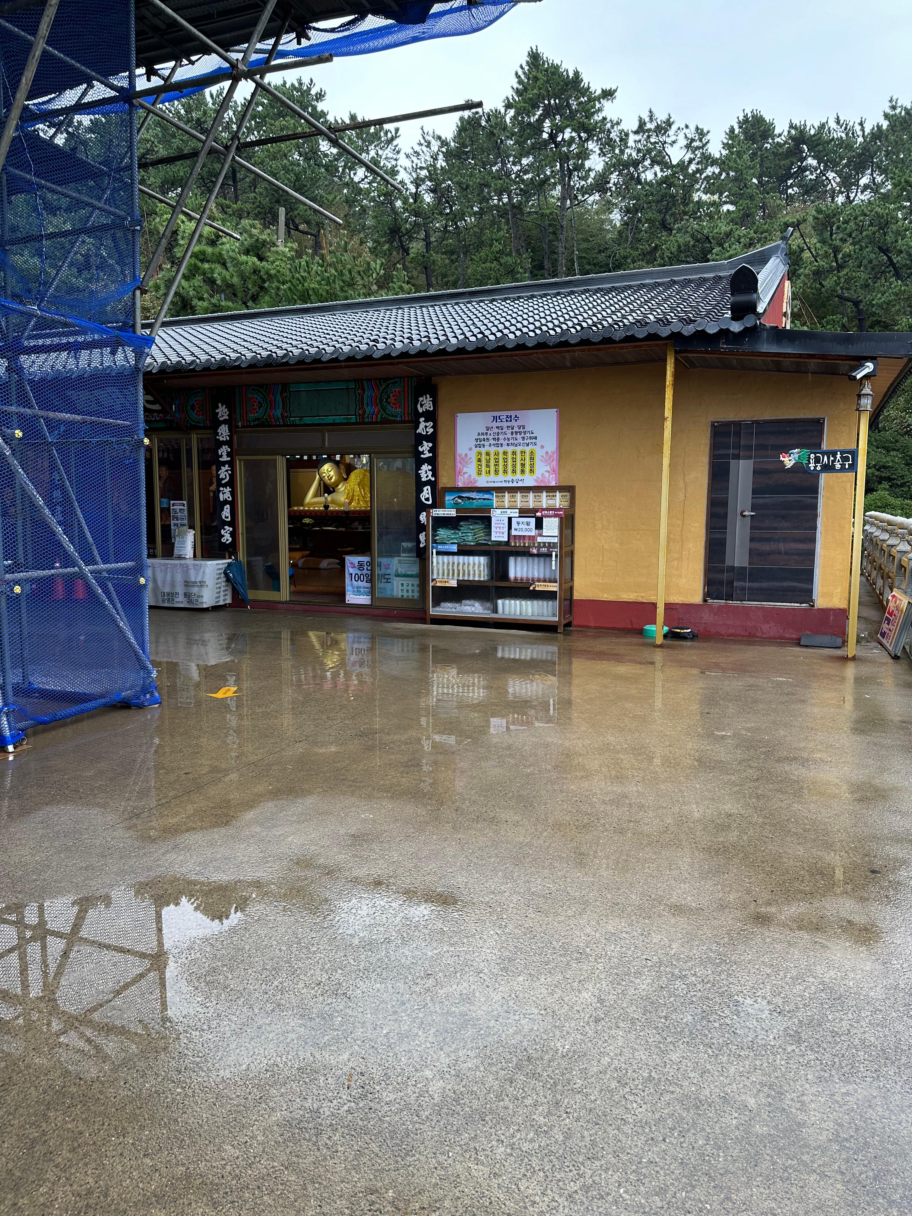 하지만 비가 오는날에 오더라도 조금 관람하기는 힘들더라도 해 뜬 날보다 좋은 모습을볼 수 있었습니다. 보수공사중인 대웅보전의 색다른 모습도 담을 수 있어서 아쉽지만 또 다른 경험을 하게 되어 좋았습니다. 방생하는곳 동암마을에서 보았던 황금 하트가 해수관음대불에서도 볼 수 있었습니다.