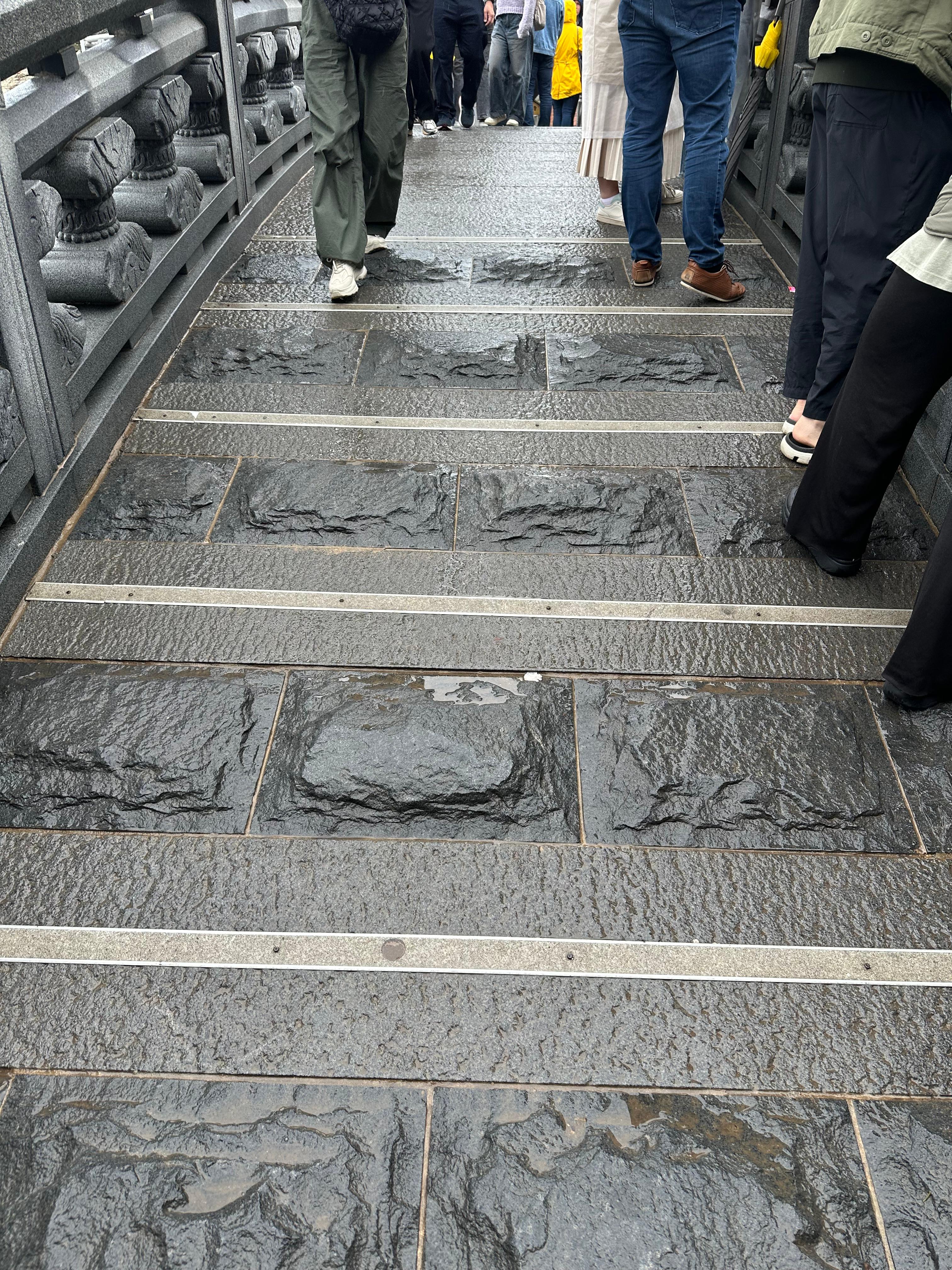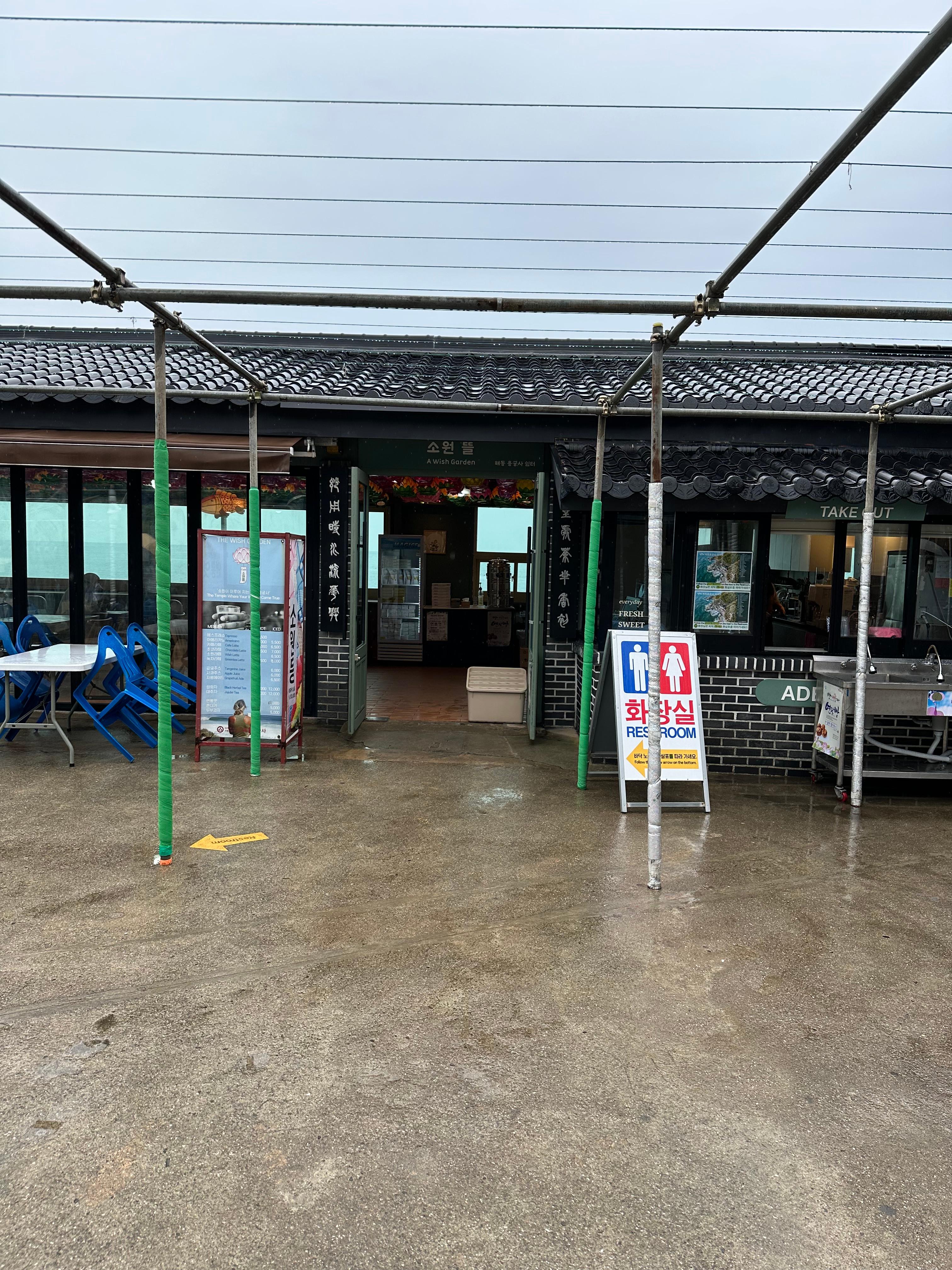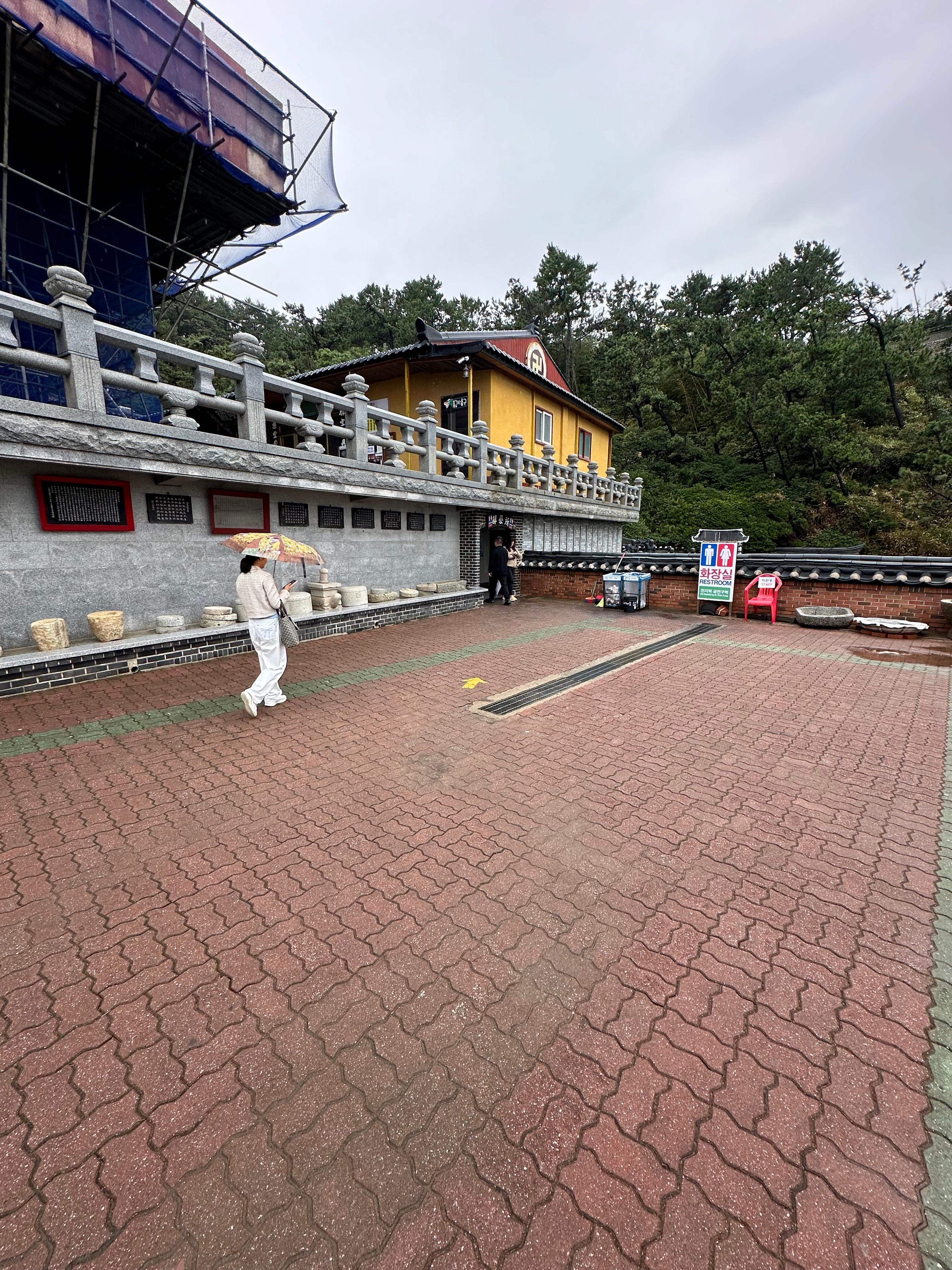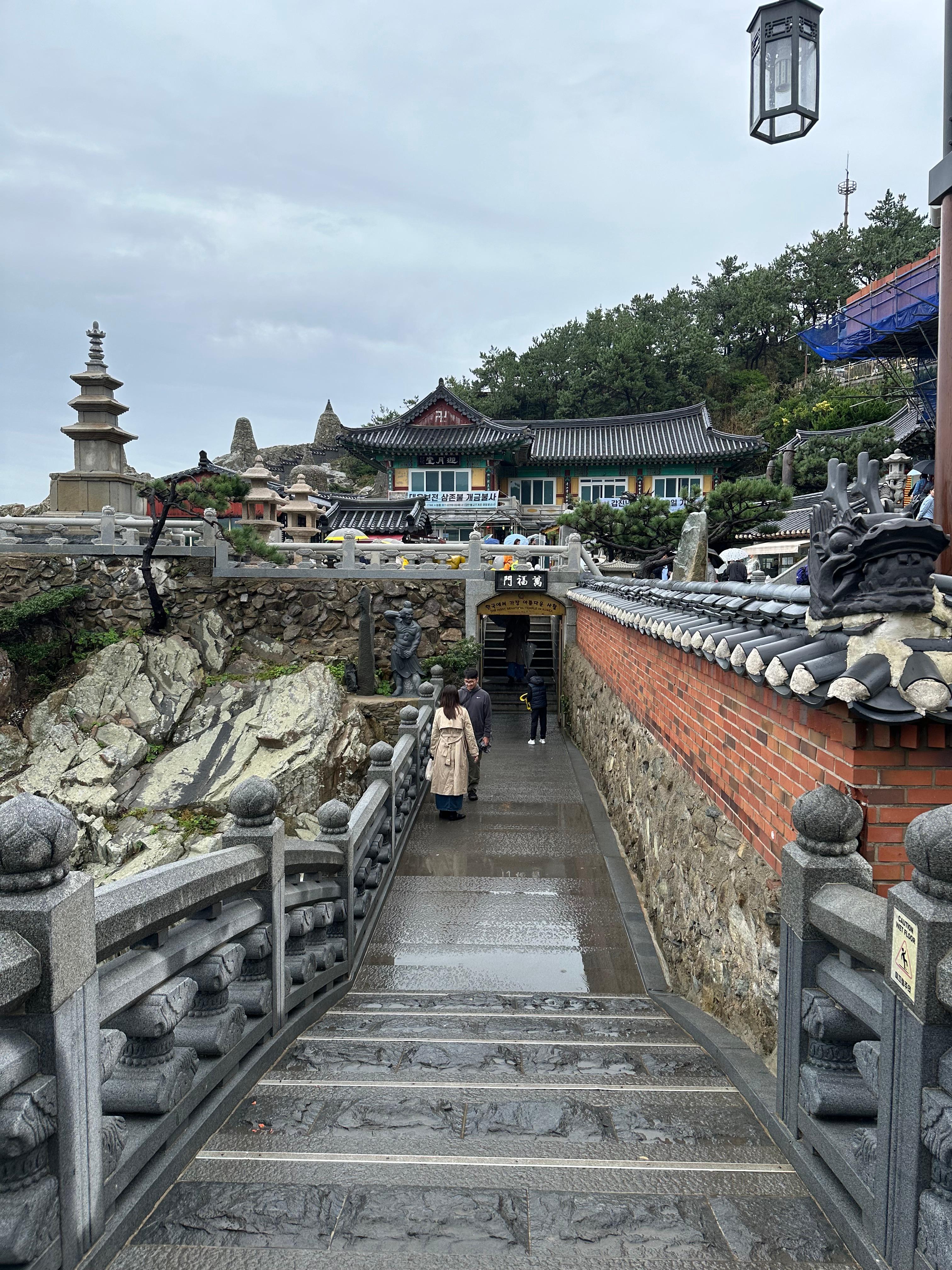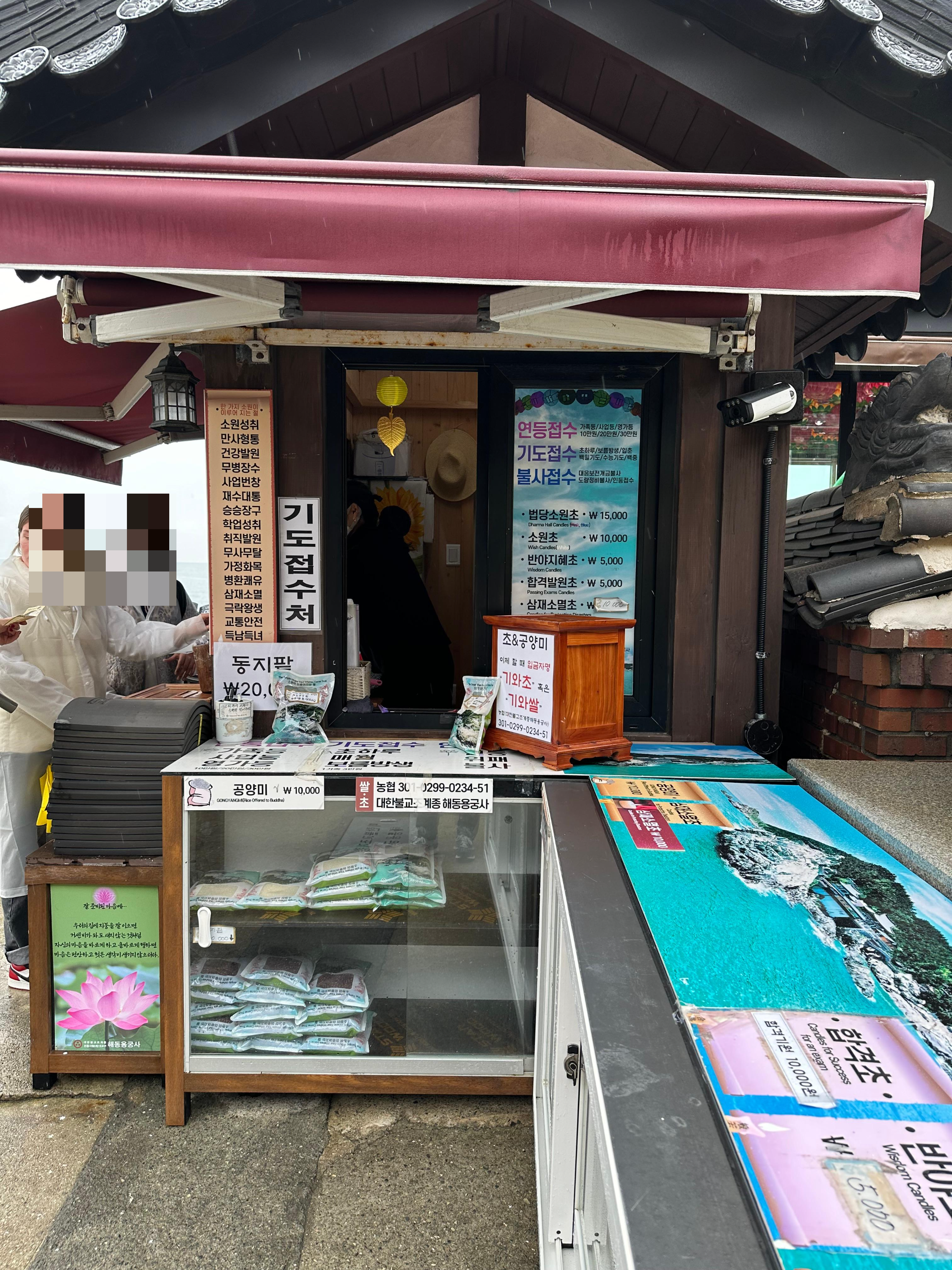 저는 원통문을 지나 해수관음대절을 올라왔던 계단 반대편을 통해 내려가기 시작했습니다. 사찰은 스님들이 수행을 하는 곳이다보니 정숙이 중요한데요. 하지만 해동용궁사처럼 관광지로 유명해진곳은 정숙이 어렵지 않을까 싶습니다. 그래도 정숙이라는 글자를 통해 관광객들이 주의하는 모습을 볼 수 있었습니다. 비가 와서 계단이 정말 미끄러웠지만 손잡이를 잡고 천천히 내려갔습니다. 이전 포스팅에서 말씀드렸지만 해동 용궁사의 길 바닥은 비가 오면 정말 미끄럽습니다. 입구에서 108계단으로 내려가는 도중에 잘못했으면 미끄러져서 넘어질뻔했는데요. 이런 바위길은 특히 비오는 날 산행은 피하거나 조심해야 할 것 같습니다. 특히 신발이 오래되면 더 미끄러지기 쉬운것 같습니다. 비오는 날 여행도 좋지만 당시 신발과 옷차림도 중요한 것 같습니다. 해수관음대불 계단을 따라 대웅보전으로 내려갔습니다. 대웅보전 근처에는 음료와 커피를 마실 수 있는 사찰 카페도 있었습니다.