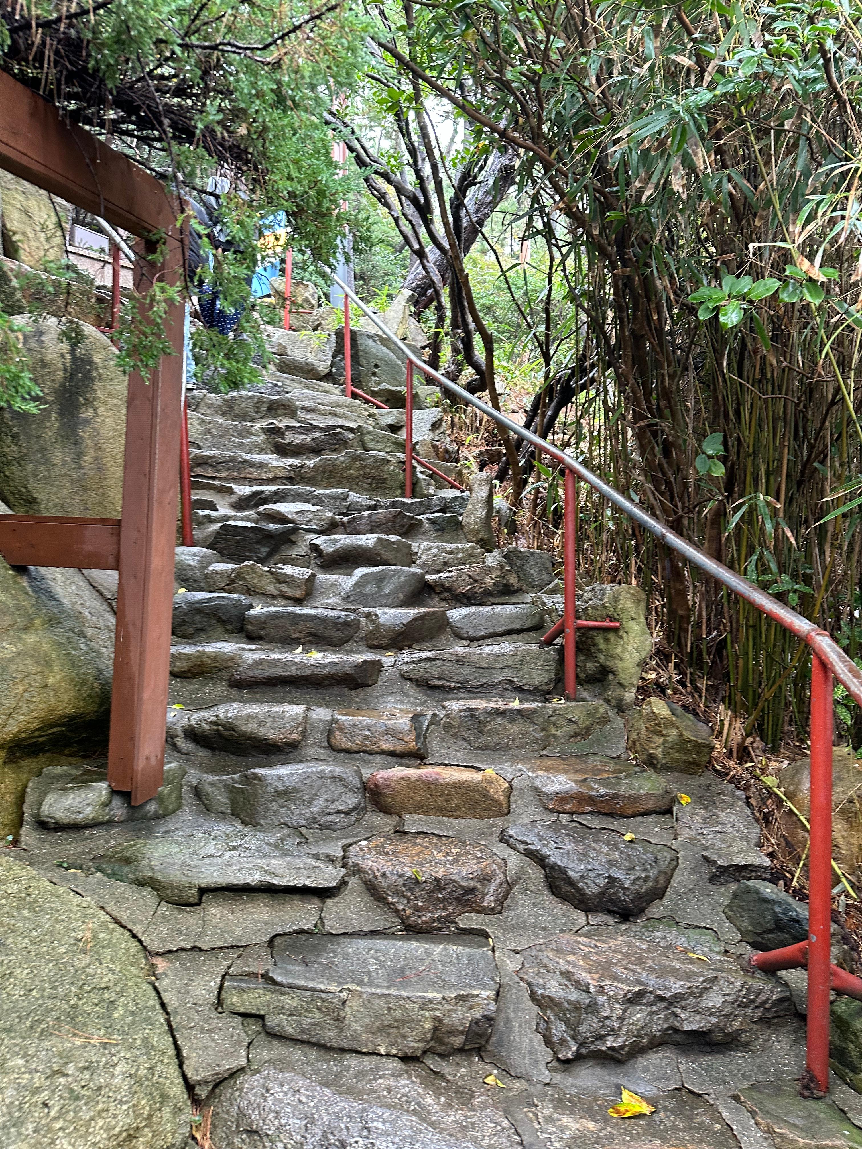 해동 용궁사 위에서 바라보는 남해안의 풍경은 정말 멋진데요. 대웅보전에서 바라보는 것도 멋졌는데요. 좀 더 높은 전망대 위에서 바라본다면 더 멋있습니다. 해동용궁사 뿐만 아니라 여행을 하면 멋진 풍경을 보기 위해서는 조금 힘들더라도 높은 전망 정상 위까지 올라가야 하는데요. 정상위에서 바라보는 풍경은 가슴이 뚫리는듯한 느낌을 받을 수 있습니다. 특히 그곳이 바다라면 더욱 그런데요. 여수 향일암의 경우 너무 언덕위에 있어서 바다만 보였다면 해동용궁사는 바다 바로 위에 있어서 남해안과 부산 기장의 풍경을 제대로 느낄 수 있었습니다. 대웅보전 원통문을 지나 해수관음대불로 올라가기 천천히 오르기 시작했습니다. 해수관음불로 올라가는 계단은 비좁았습니다. 특히 비가 와서 길이 미끄러웠는데요. 해수관음대길로 가는 길은 오른쪽으로 올라가는길과 왼쪽은 하산 하는 계단이 있었습니다. 계단이 좁아 천천히 내려가기 시작했습니다.