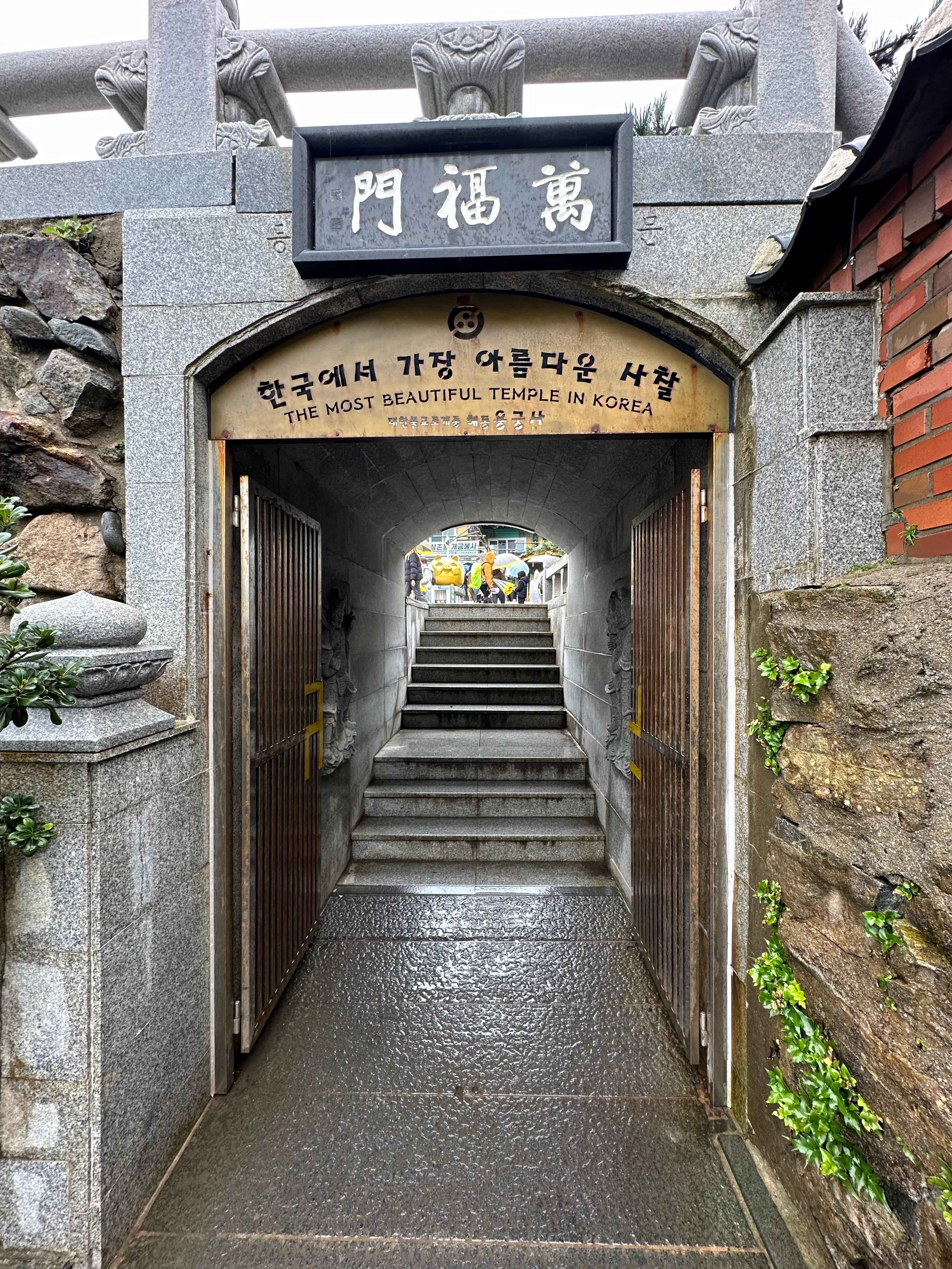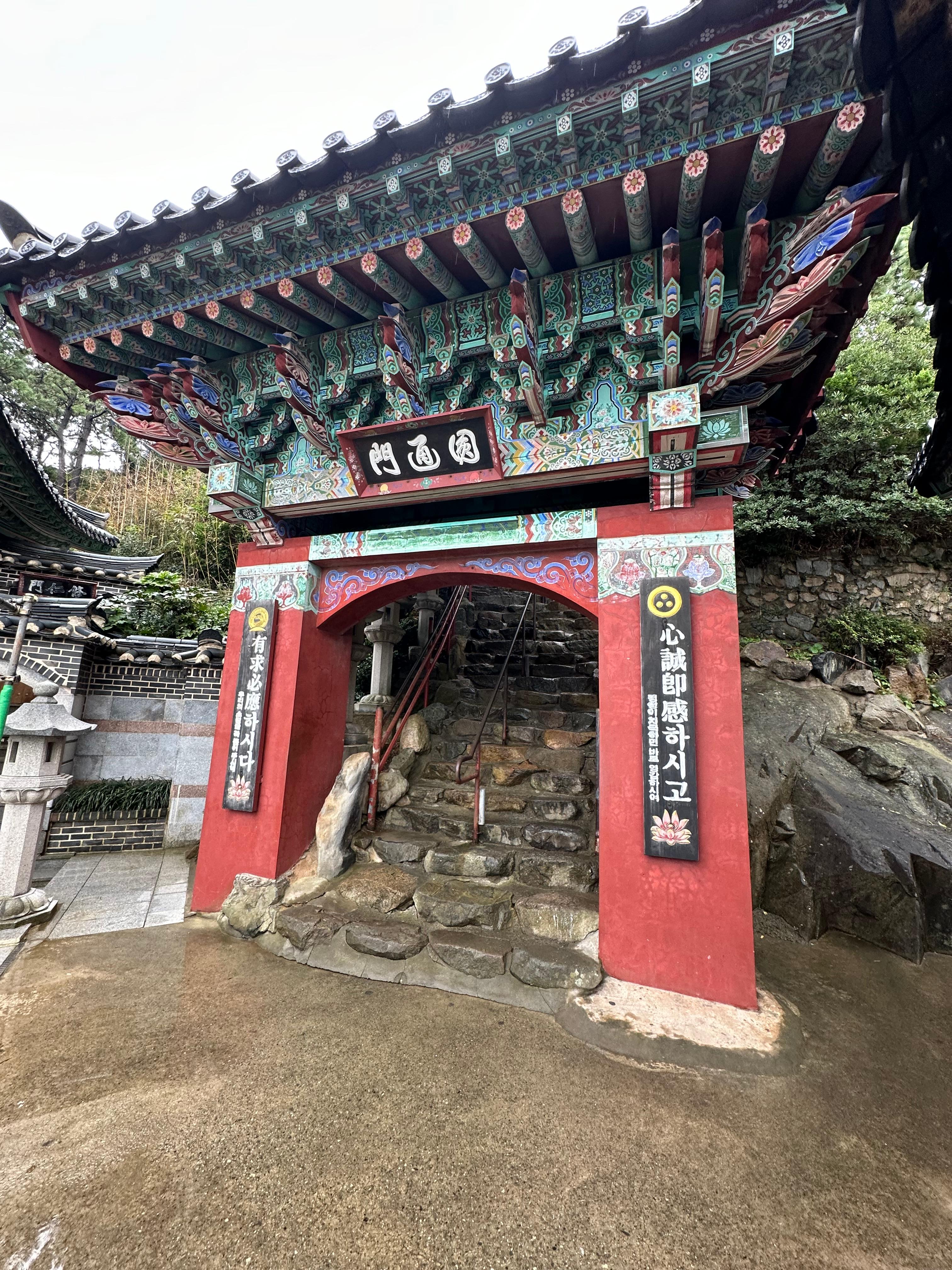 행운의 동전정을 지나면 해동용궁사의 메인이라고 볼 수 있는 대웅보전으로 가는 문을 만날 수 있습니다. 마치 바다 밑으로 들어가는 듯한 문의 인상을 느낄 수 있었습니다. 해동용궁사는 여수 향일암과 다르게 바다 위에 산 언덕이 아니라 바로 바다 위에 있는데요.