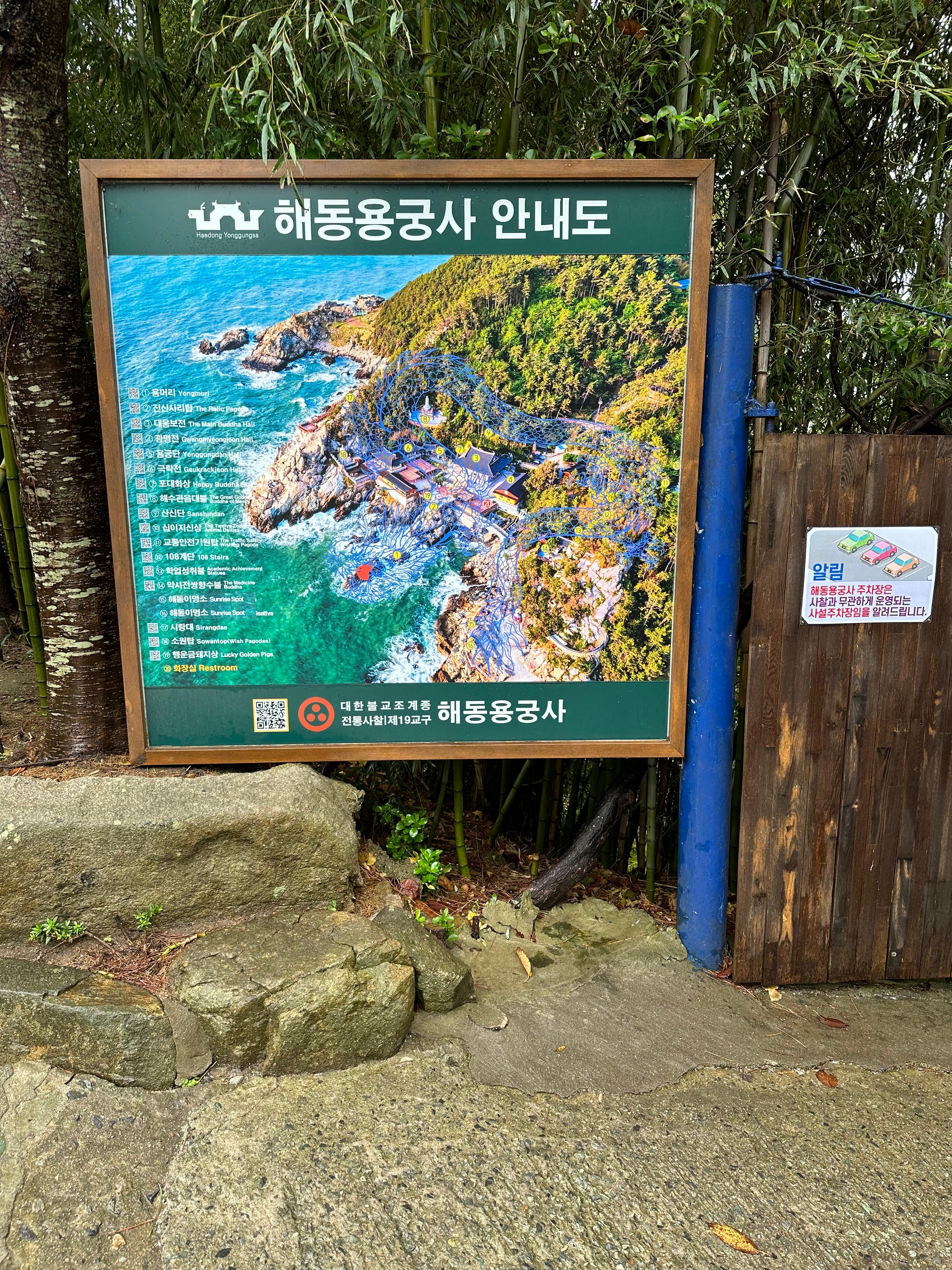 그렇게 입구에서부터 시작해서 출구로 나오기까지 해동용궁사의 관람을 모두 마쳤습니다. 다시 입구에 돌아오니까 해동용궁사라는 붉은 글씨에 강렬함을 느낄 수있습니다. 붉은 글씨 속 강렬함만큼 국내 아름다운 사찰 바다절 해동용궁사의 아름다움 역시 강렬하고 좋았습니다. 입구에는 해동용궁사 안내도가 있었는데요. 비가 오지 않았다면 안내도 만큼 더 자세히 보지 않았을까 싶습니다. 운전할때도 비가오면 시야가 좁아진다고 하잖아요. 여행할때도 비가오니까 우산에 의해 시야가 가려지지니까 팔도 아플 뿐 아니라 의외로 10년전에 봤던것도 더 쉽게 놓쳤던 것 같습니다.