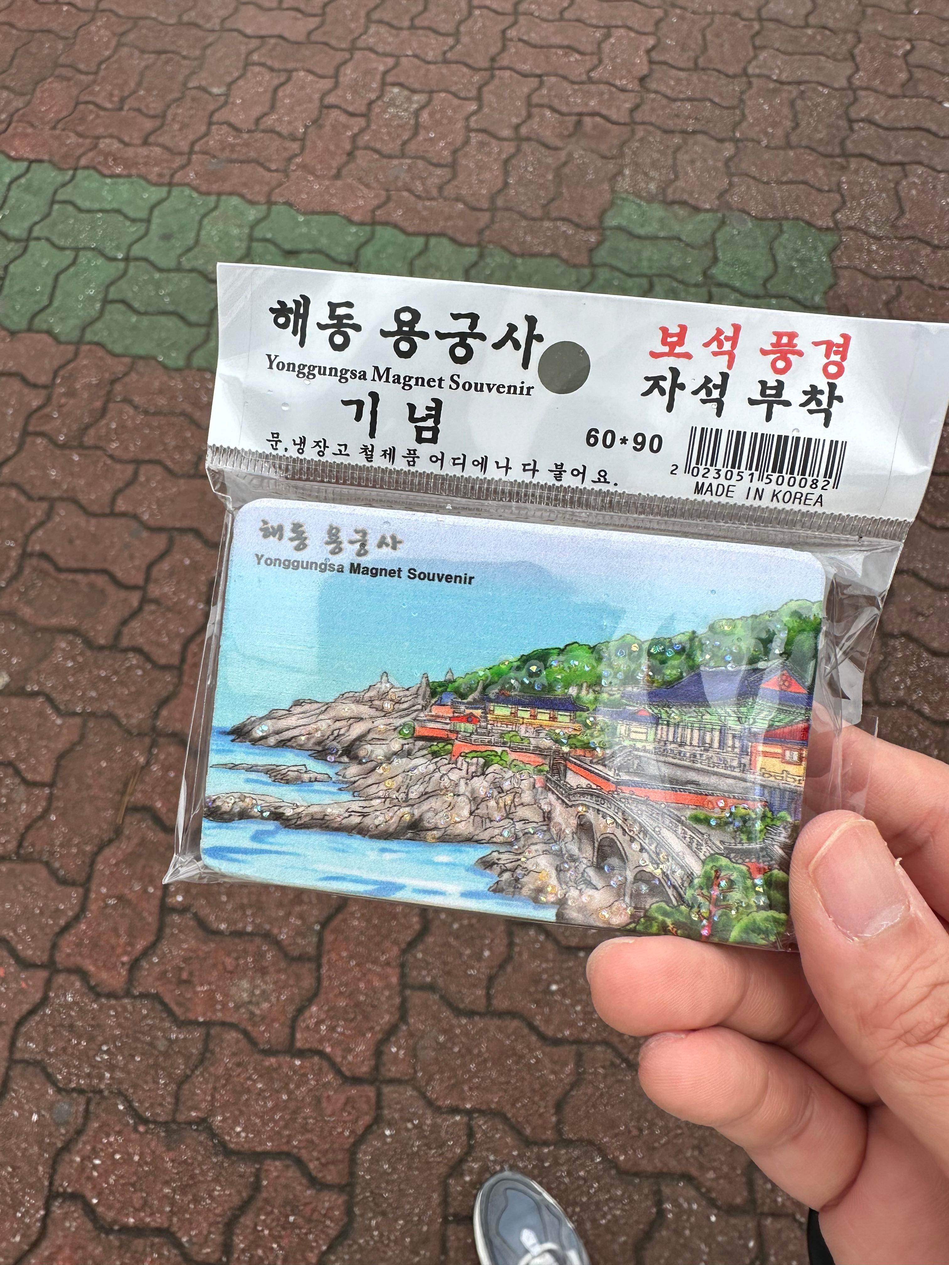 해동용궁사의 메인 관람 코스인 대웅보전, 해수관음대불, 신비한 약수에서 물을 마시고 저는 출구쪽으로 발을 옮겼습니다. 10년만에 찾은 해동용궁사이지만 그래도 기념품을 사야하지 않나 싶어서 기념품을 샀는데요. 해동용궁사가 보이는 자석 부착 기념품을 샀습니다. 자석이라서 냉장고나 자석 붙일 수있는 곳에서 쓸수 있는데요. 하지만 구매 후 딱히 붙일때가 없어서 방치하고 있습니다.