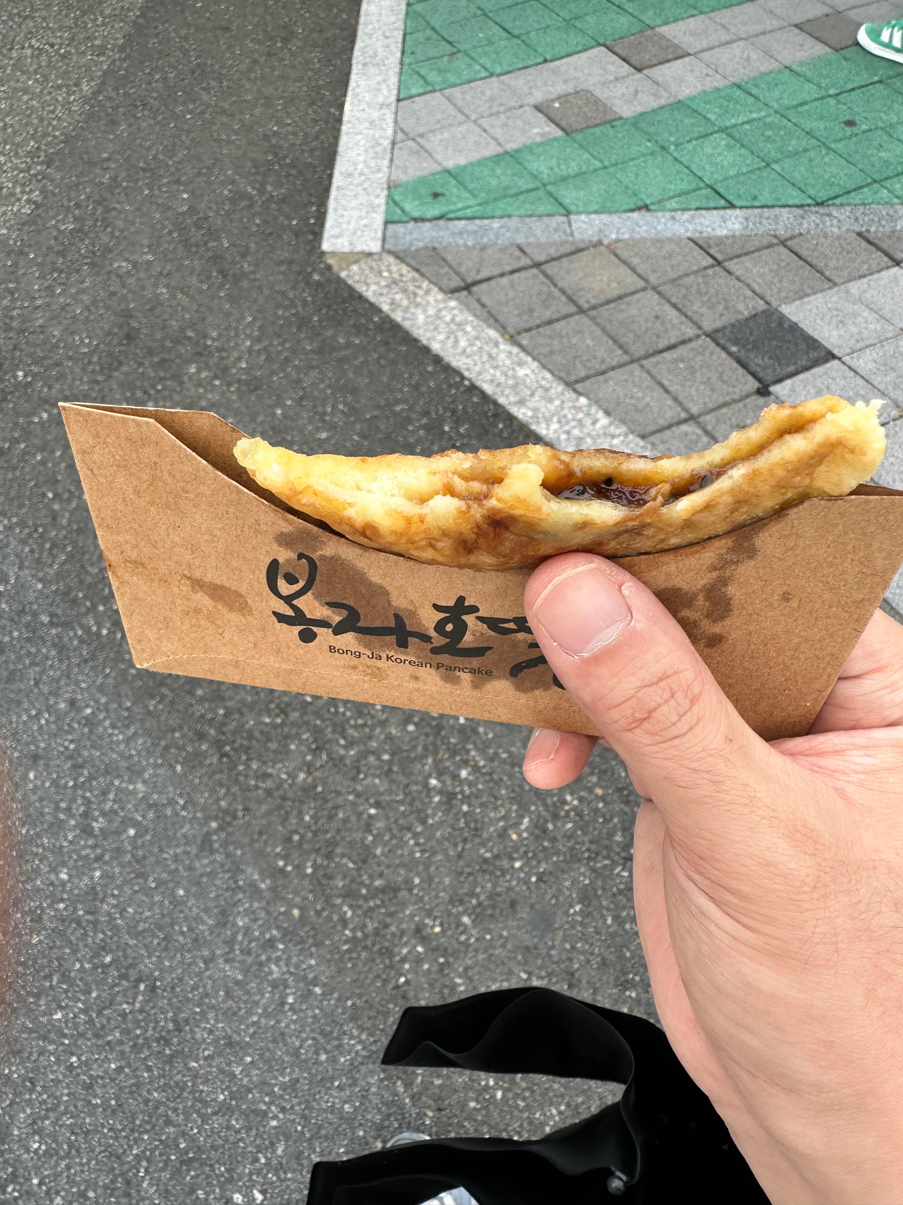 비오는날 한손에는 우산을 들고 또 한손에는 핸드폰 카메라로 사진을 찍다보니 더 배가 고파졌습니다. 이 작은 꿀치즈 호떡을 한입한입 먹기 시작했고 금방 다 먹게 되었습니다. 봉자호떡 꿀치즈 호떡을 한입 먹을 수록 안에 꿀치즈가 그대로 보이면서 느껴졌습니다. 치즈이긴한데 치즈 흔적은 보이지 않고 꿀만 가득했습니다. 이름이 꿀치즈라서 치즈와 꿀이 어떻게 되었는지 궁금했는데요. 만약 치즈가 그대로 보였다면 더 느끼한 맛이었을텐테 오히려 달고 더 맛있었습니다.
