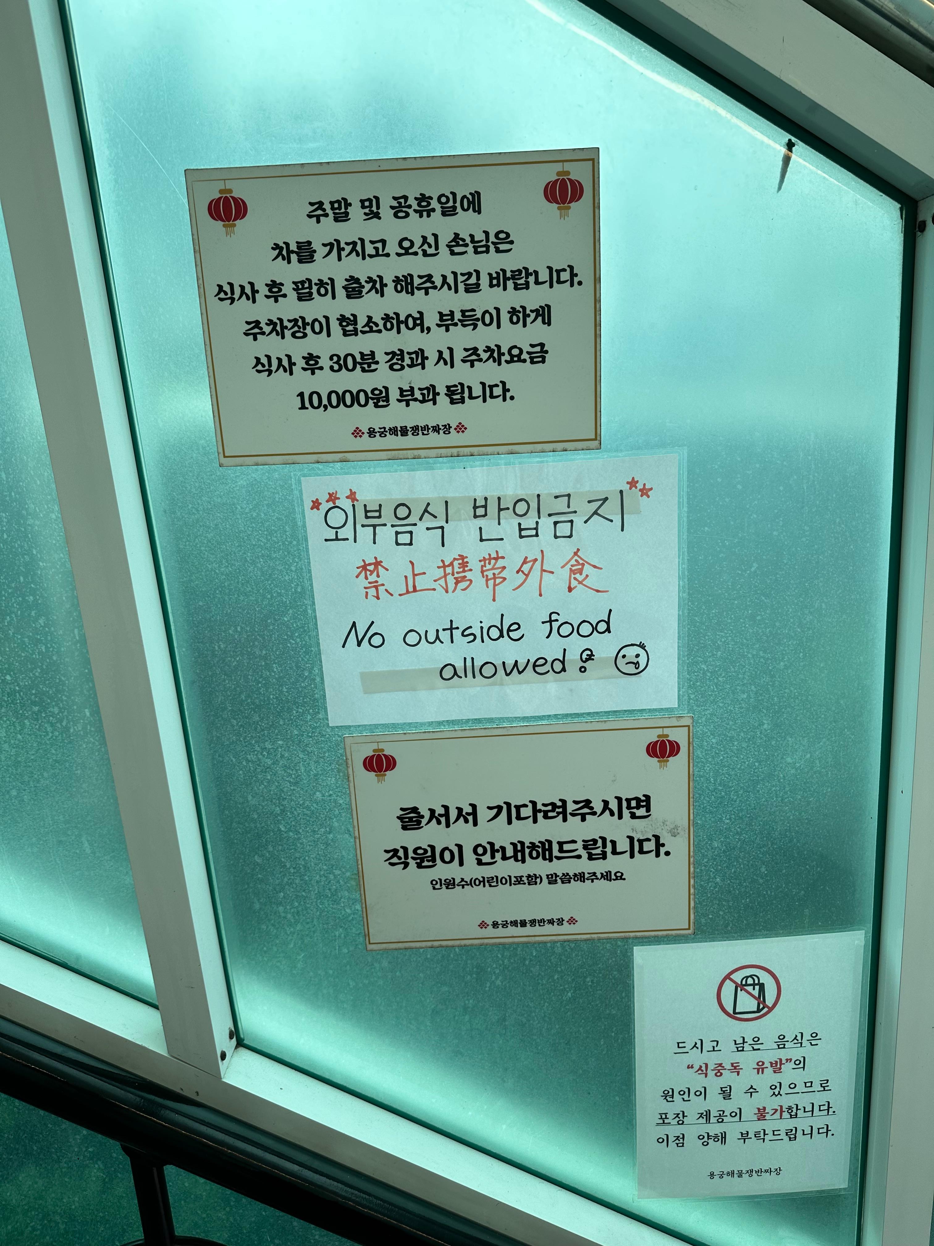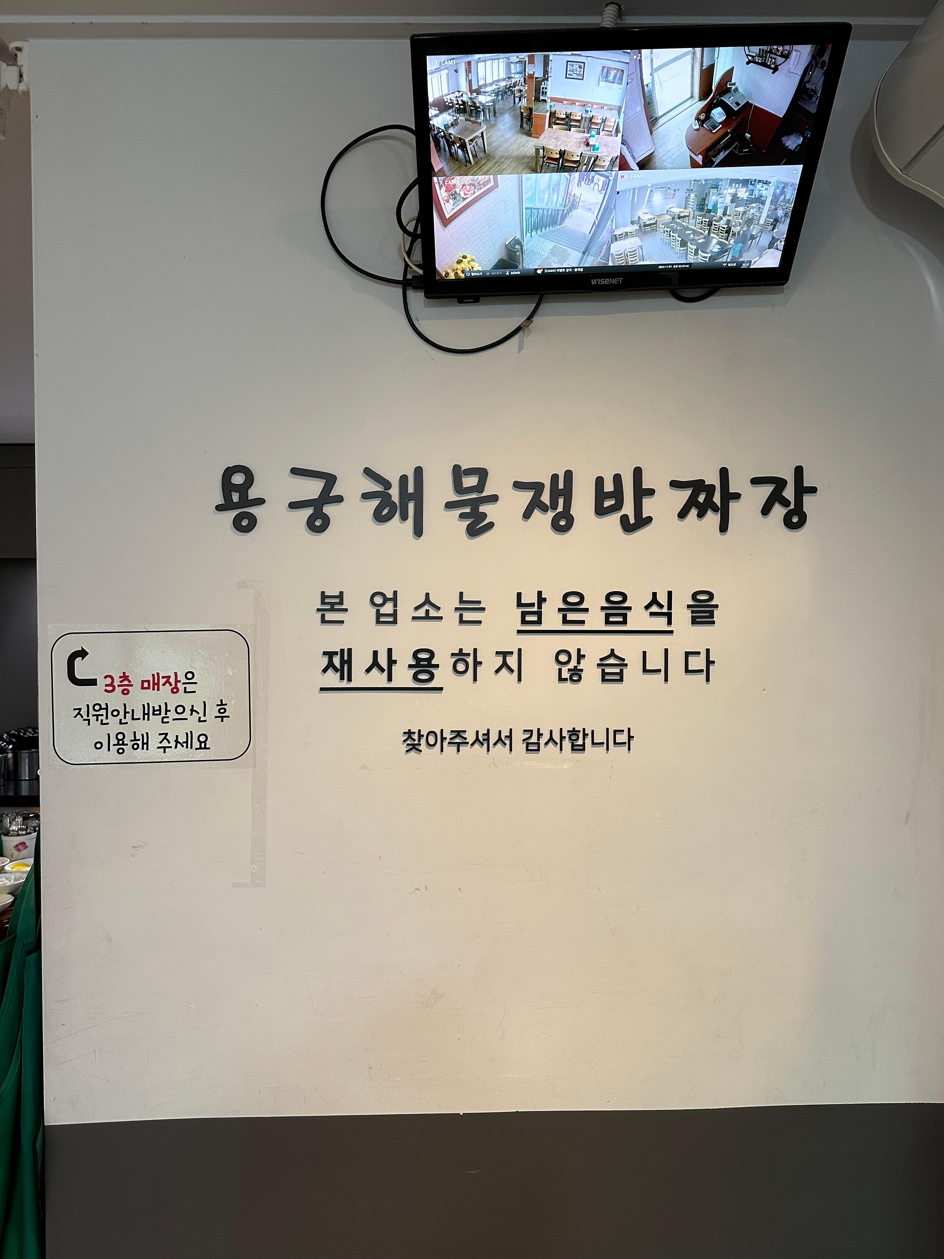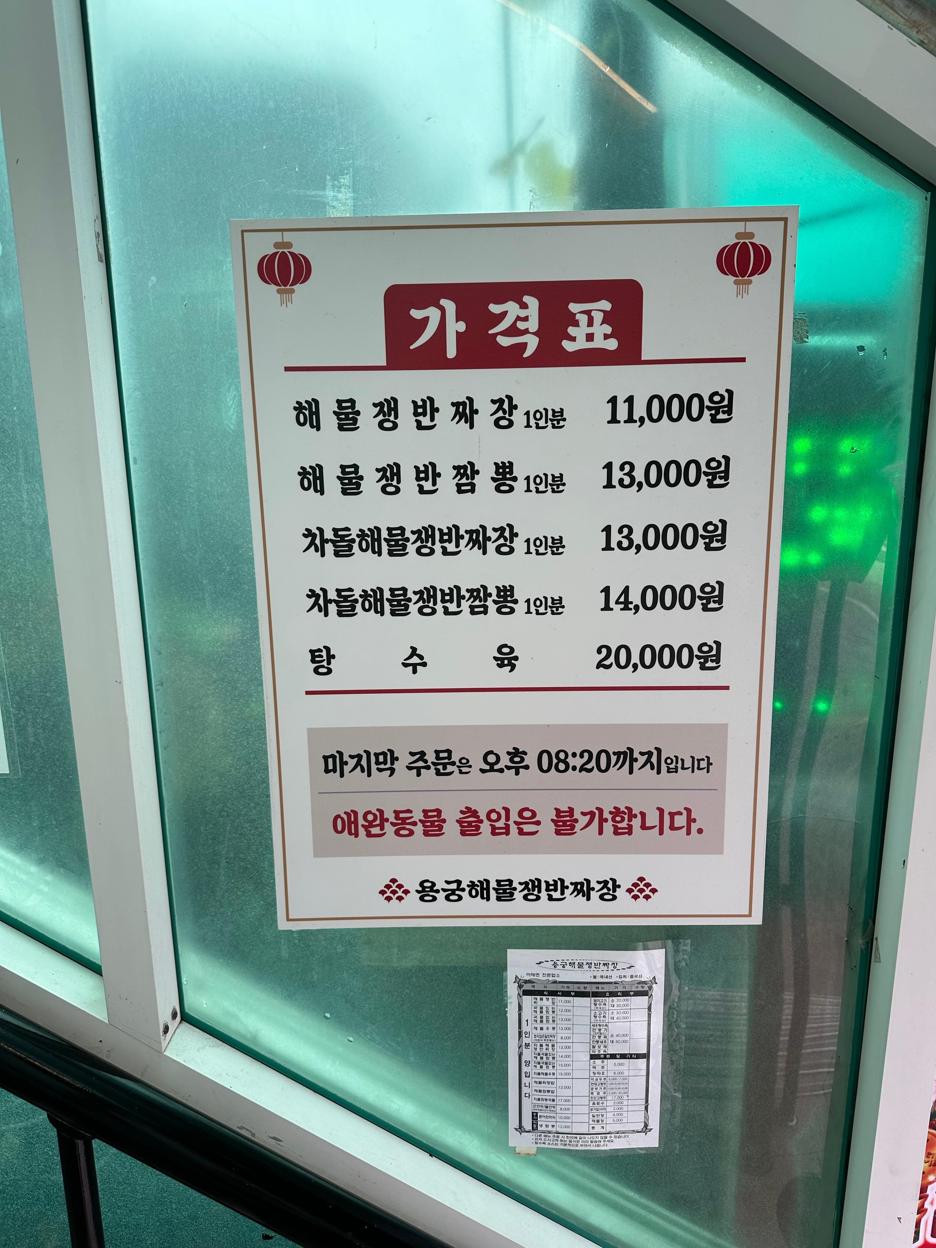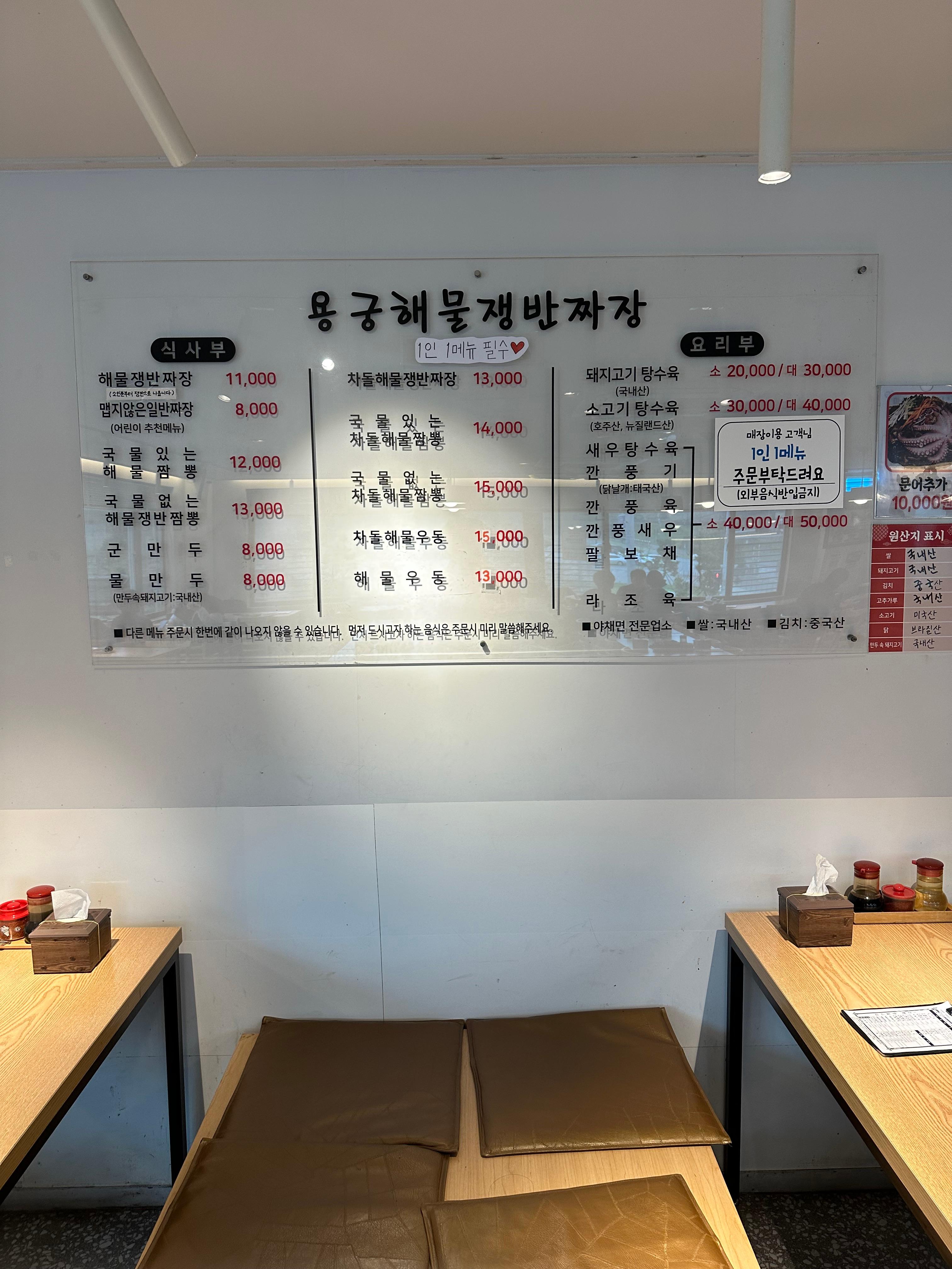 금요일 2시가 넘은 시간이라서 그런지 가게는 복잡하지 않은 모습을 볼 수 있었습니다. 주말이든 평일이든 관광지이기때문에 12시부터 1시까지는 사람이 정말 많을 것으로 예상됩니다. 대부분 가게 있던 손님들은 2시 이전에 와서 먹던 분이었습니다. 제가 음식을 주문하고 얼마 지나니까 가게는 텅 비어있는 것을 볼 수 있었구요. 특히 여행왔을 때 성수기나 주말에는 사람이 많으니까 조금 점심시간을 피해서 오면 여유롭게 먹을 수 있어서 더 좋은 것 같습니다. 이때는 해동용궁사를 관람하고 온거라 늦었지만 여유롭게 산다는게 나쁘지 않은 것 같습니다. 저는 가게 매장 끝쪽에 자리를 잡고 해물쟁반짜장으로 주문을 했습니다.